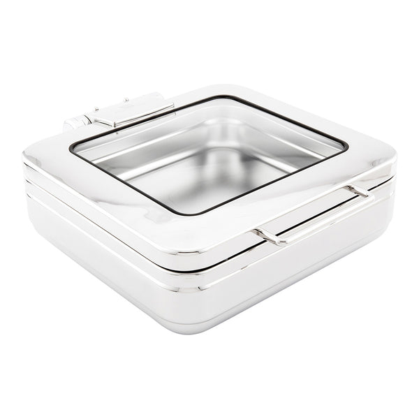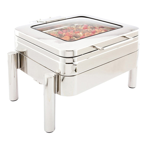 The stainless steel construction of this 6-quart chafing dish body traps in heat to keep meats and poultry at a healthy and proper serving temperature, while its rectangular shape makes it ideal for serving ample portions of hot food. Constructed with welded stainless steel for durability, this half size chafer is built with a glass viewing window for easy visibility. Whether you're serving a buffet, banquet, or wedding reception, this rectangular chafer will ensure guest satisfaction and gala success. Each Met Lux Half Size 6 Quart Rectangular Induction Ready Chafer Stainless Steel Body with Glass Viewing Window measures 22.6 inches L by 16 inches W, and is shipped in a 1 count box. Stands can be purchased separately.