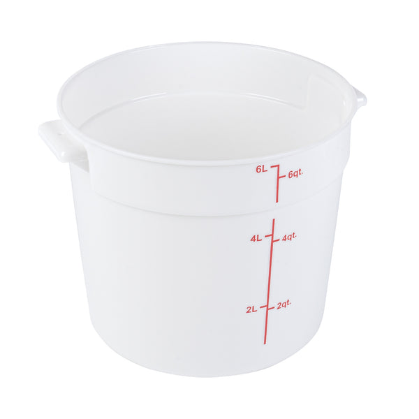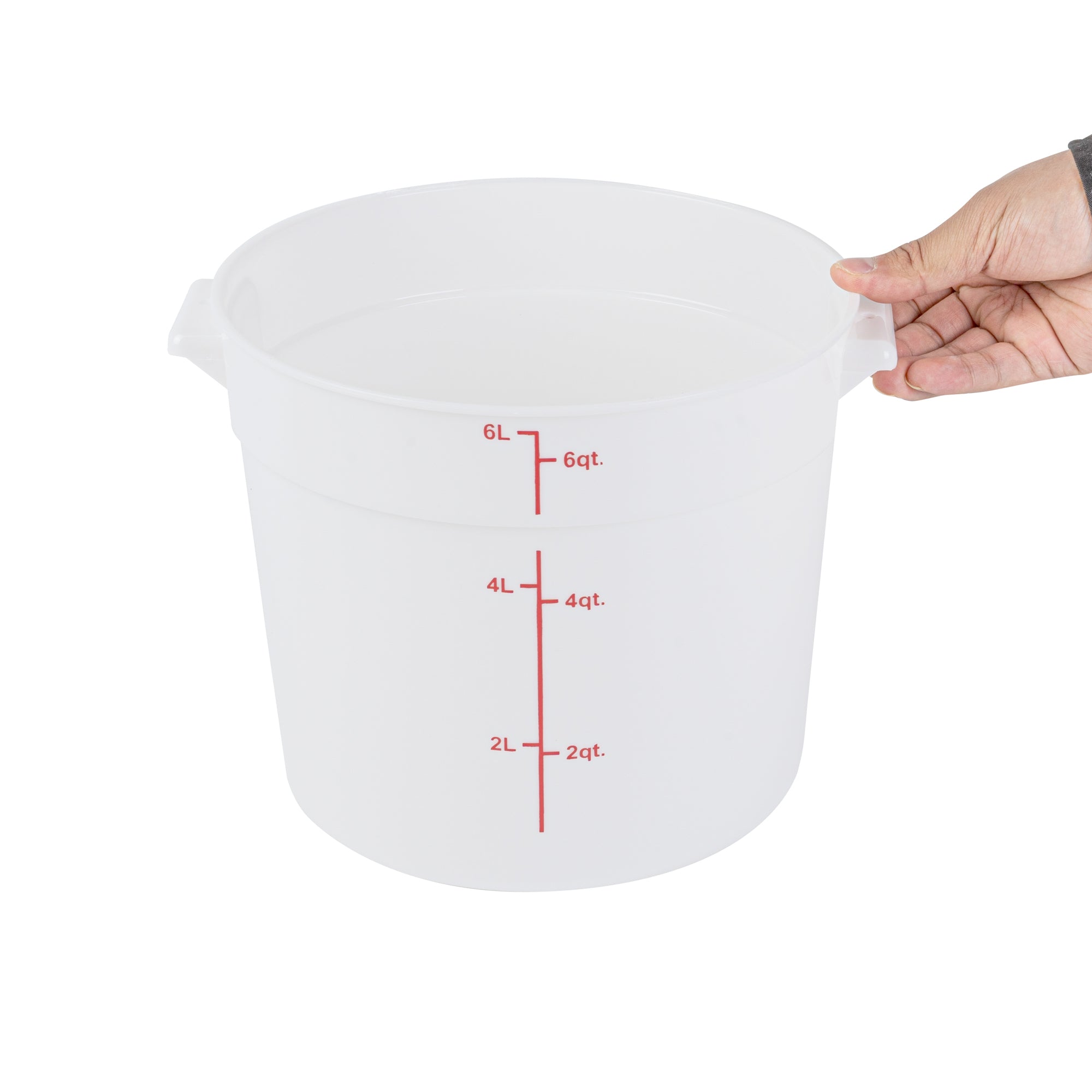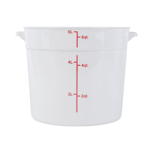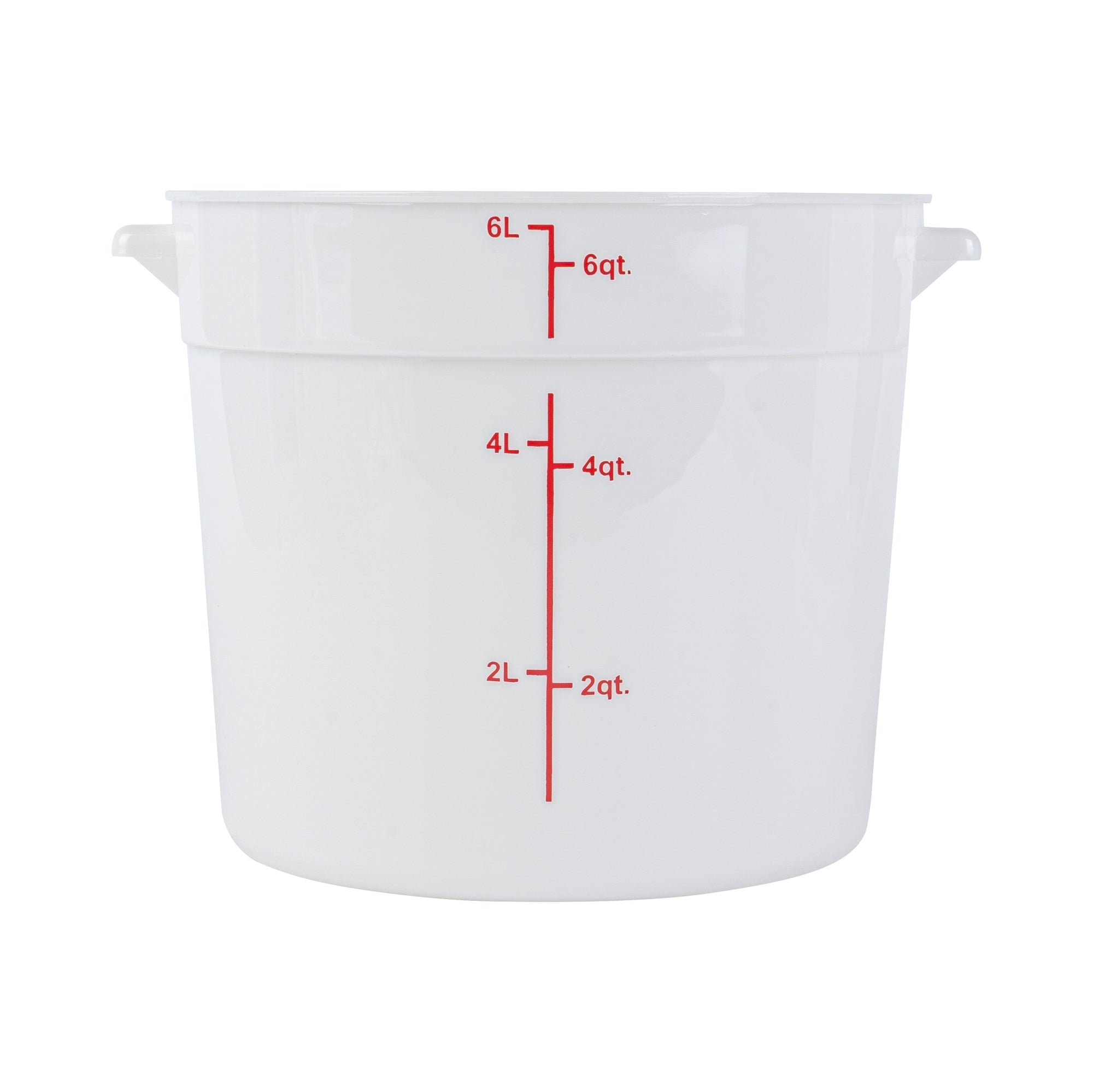 Take organization and quality control to the next level with our Met Lux 6-quart Round White Plastic Food Storage Container. Crafted from robust PP plastic, this food storage container offers longevity and can withstand temperatures ranging from -40 to 160 degrees Fahrenheit, making it an ideal choice for any culinary environment. For convenience and precision, this plastic food storage container features a red volume marker, allowing easy measurement of content. This storage container's design incorporates a stable handle, enabling easy transport and maneuverability around the kitchen. Pair it with our lid (SKU: RWT1575C-1), which is compatible with this round plastic food container, ensuring freshness. Showcasing a white design, this storage container enables quick and easy identification of contents, saving you valuable time in a busy kitchen setting. Boasting a functional capacity of 6 quarts, this round plastic container is perfect for storing large quantities of ingredients, while its compact dimensions of 8.75 inches in diameter by 7.75 inches in height allow for efficient space utilization. Compatible with a dishwasher and freezer, this versatile food container is designed for effortless cleaning and long-term food storage. Sold in a 1 count box. Lid is available and sold separately.