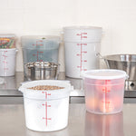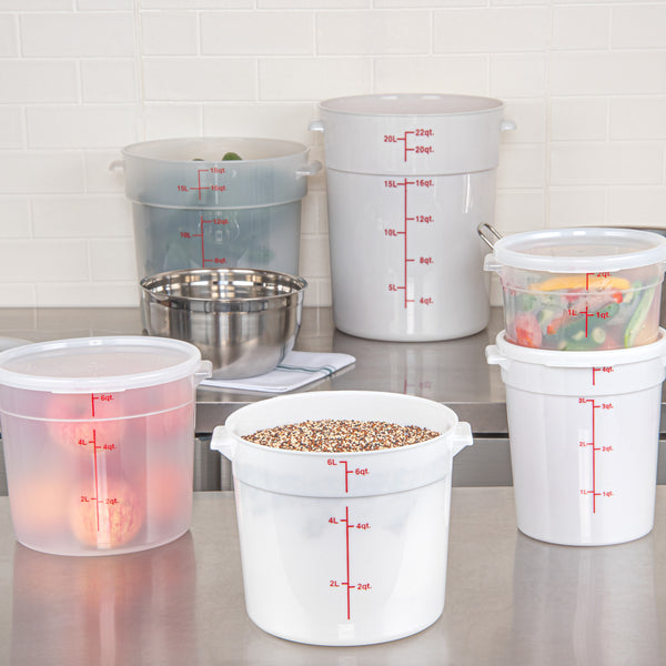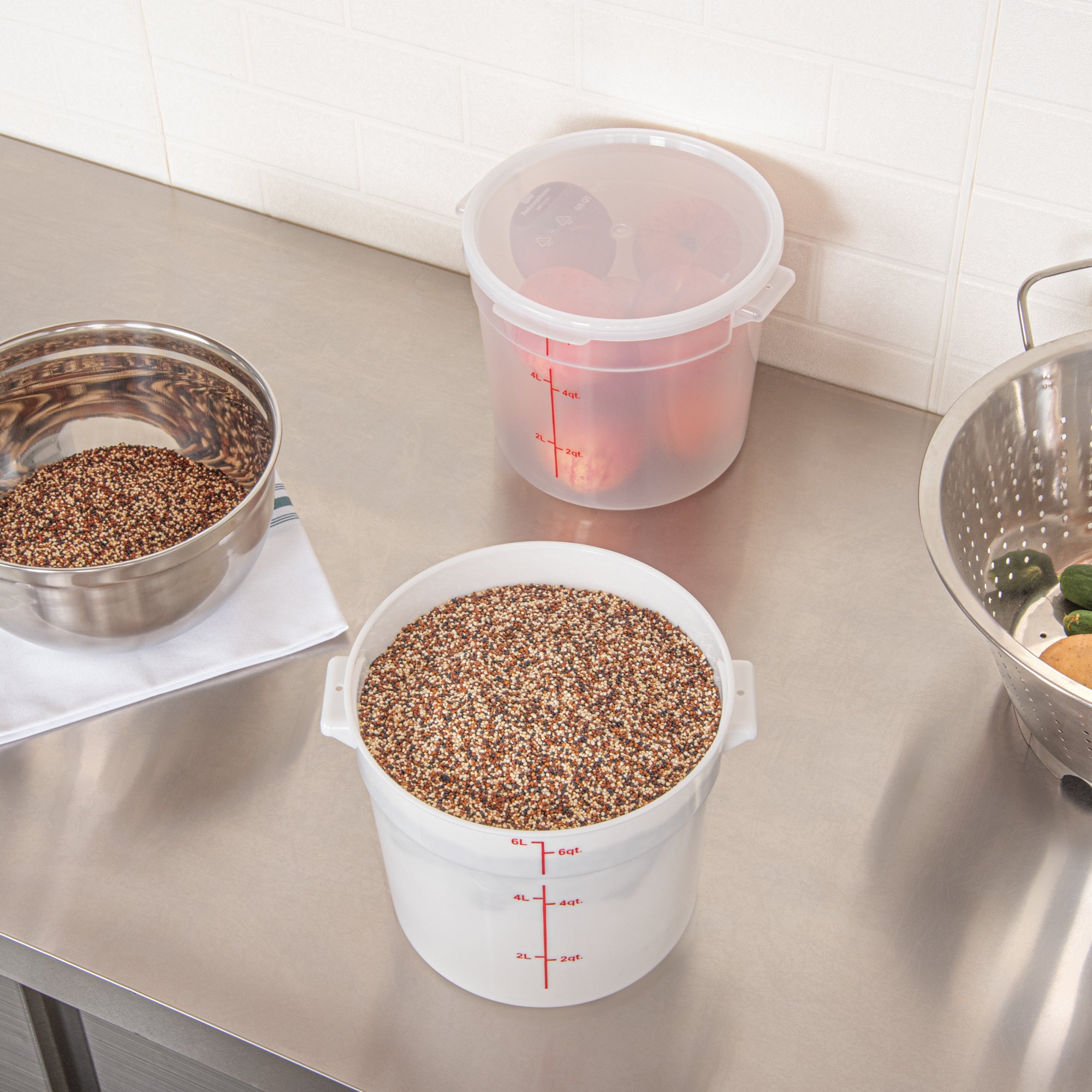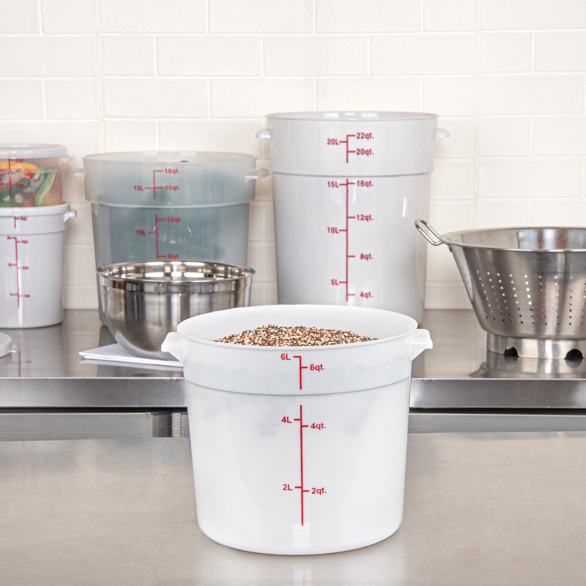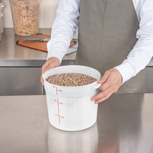 Take organization and quality control to the next level with our Met Lux 6-quart Round White Plastic Food Storage Container. Crafted from robust PP plastic, this food storage container offers longevity and can withstand temperatures ranging from -40 to 160 degrees Fahrenheit, making it an ideal choice for any culinary environment. For convenience and precision, this plastic food storage container features a red volume marker, allowing easy measurement of content. This storage container's design incorporates a stable handle, enabling easy transport and maneuverability around the kitchen. Pair it with our lid (SKU: RWT1575C-1), which is compatible with this round plastic food container, ensuring freshness. Showcasing a white design, this storage container enables quick and easy identification of contents, saving you valuable time in a busy kitchen setting. Boasting a functional capacity of 6 quarts, this round plastic container is perfect for storing large quantities of ingredients, while its compact dimensions of 8.75 inches in diameter by 7.75 inches in height allow for efficient space utilization. Compatible with a dishwasher and freezer, this versatile food container is designed for effortless cleaning and long-term food storage. Sold in a 1 count box. Lid is available and sold separately.