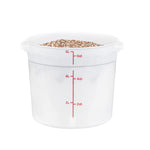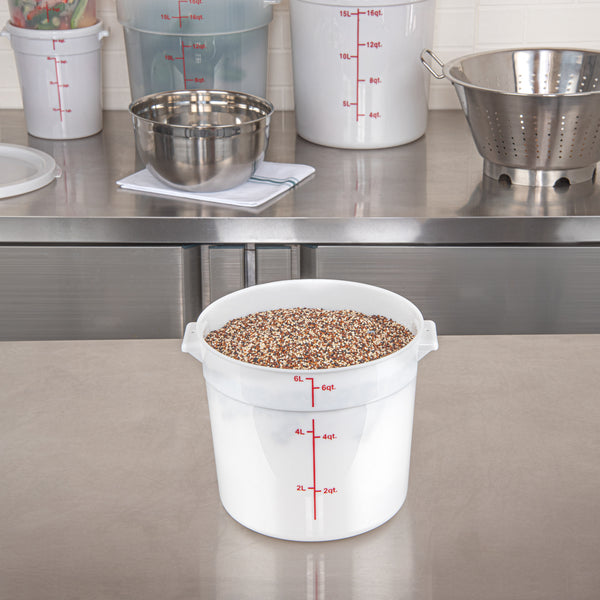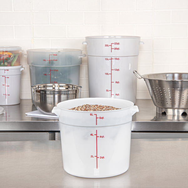 Take organization and quality control to the next level with our Met Lux 6-quart Round White Plastic Food Storage Containers. Crafted from robust pp plastic, these food storage containers offer longevity and can withstand temperatures ranging from -40 to 160 degrees Fahrenheit, making them an ideal choice for any culinary environment. For convenience and precision, these plastic food storage containers feature red volume markers, allowing easy measurement of contents. These storage containers' design incorporates stable handles, enabling easy transport and maneuverability around the kitchen. Pair with our lids (SKU: RWT1575C) that are compatible with these round plastic food containers, ensuring freshness. Showcasing a white design, these storage containers enable quick and easy identification of contents, saving you valuable time in a busy kitchen setting. Boasting a functional capacity of 6 quarts, these round plastic containers are perfect for storing large quantities of ingredients, while their compact dimensions of 8.75 inches in diameter by 7.75 inches in height allow for efficient space utilization. Compatible with both dishwasher and freezer, these versatile food containers are designed for effortless cleaning and long-term food storage. Sold in a 10 count box. Lids are available and sold separately.