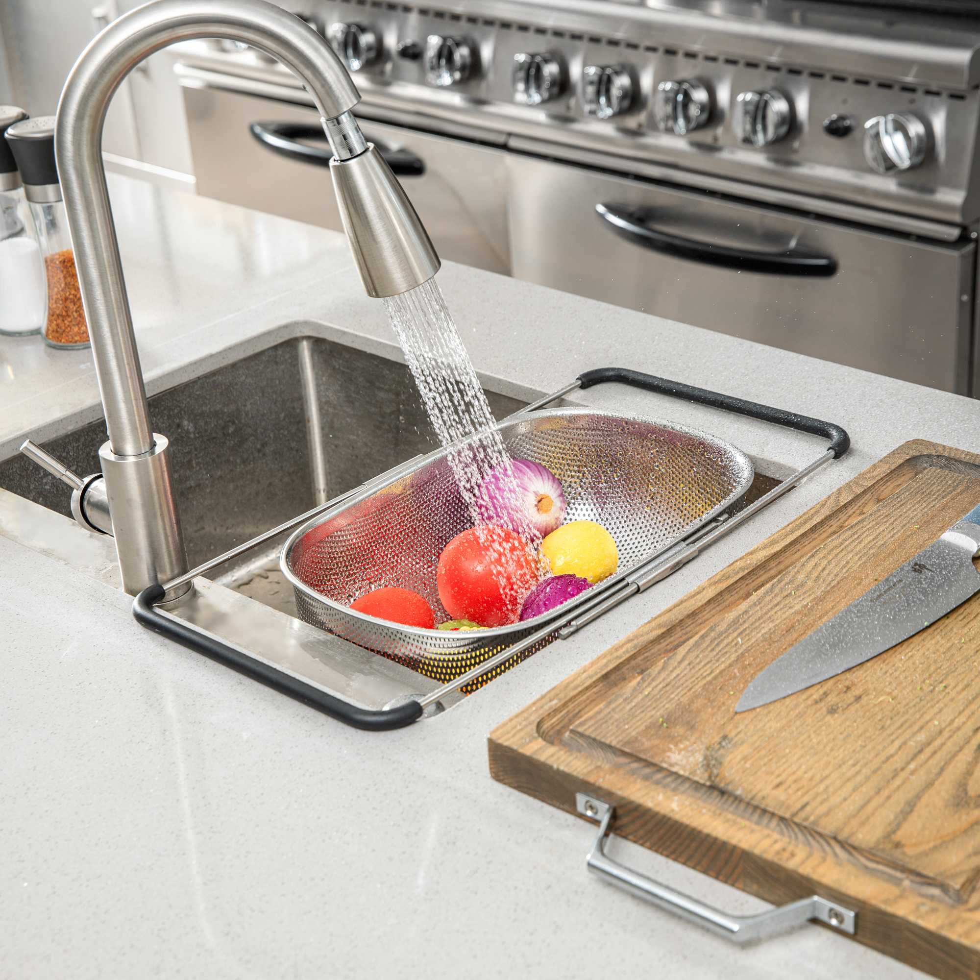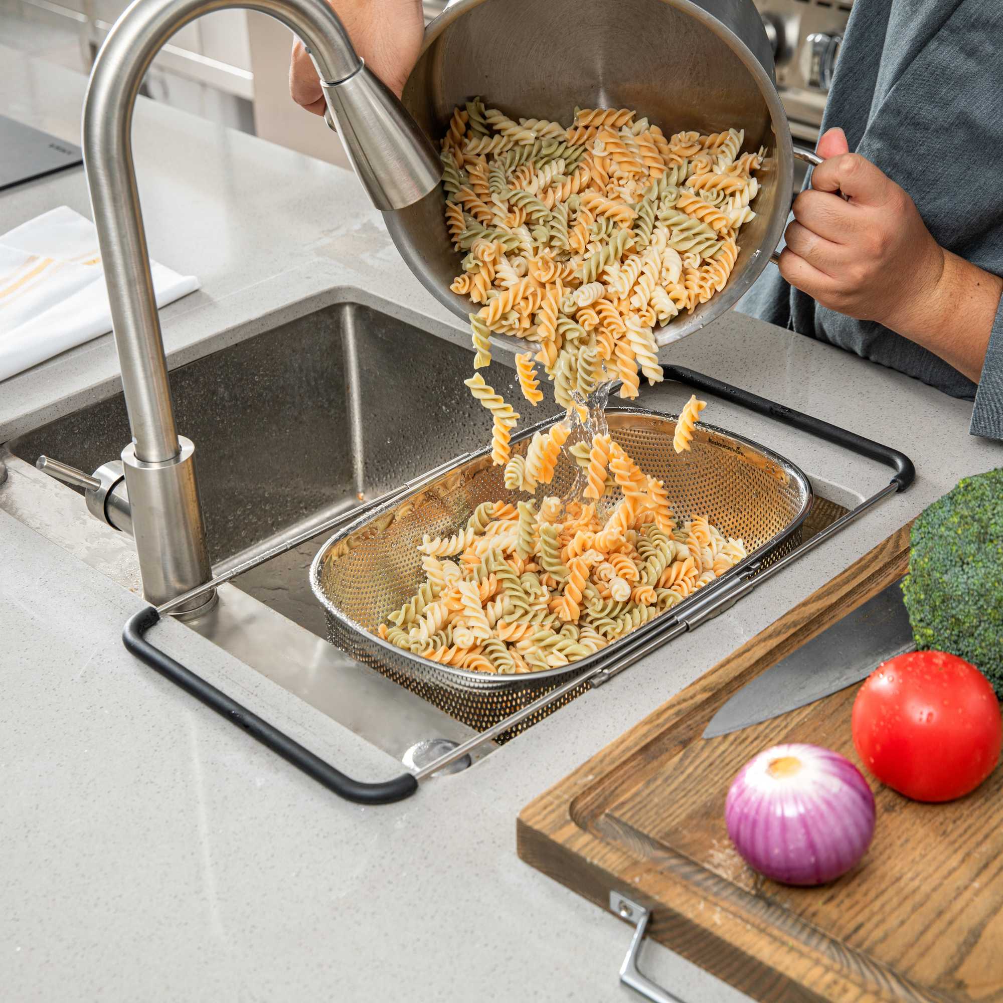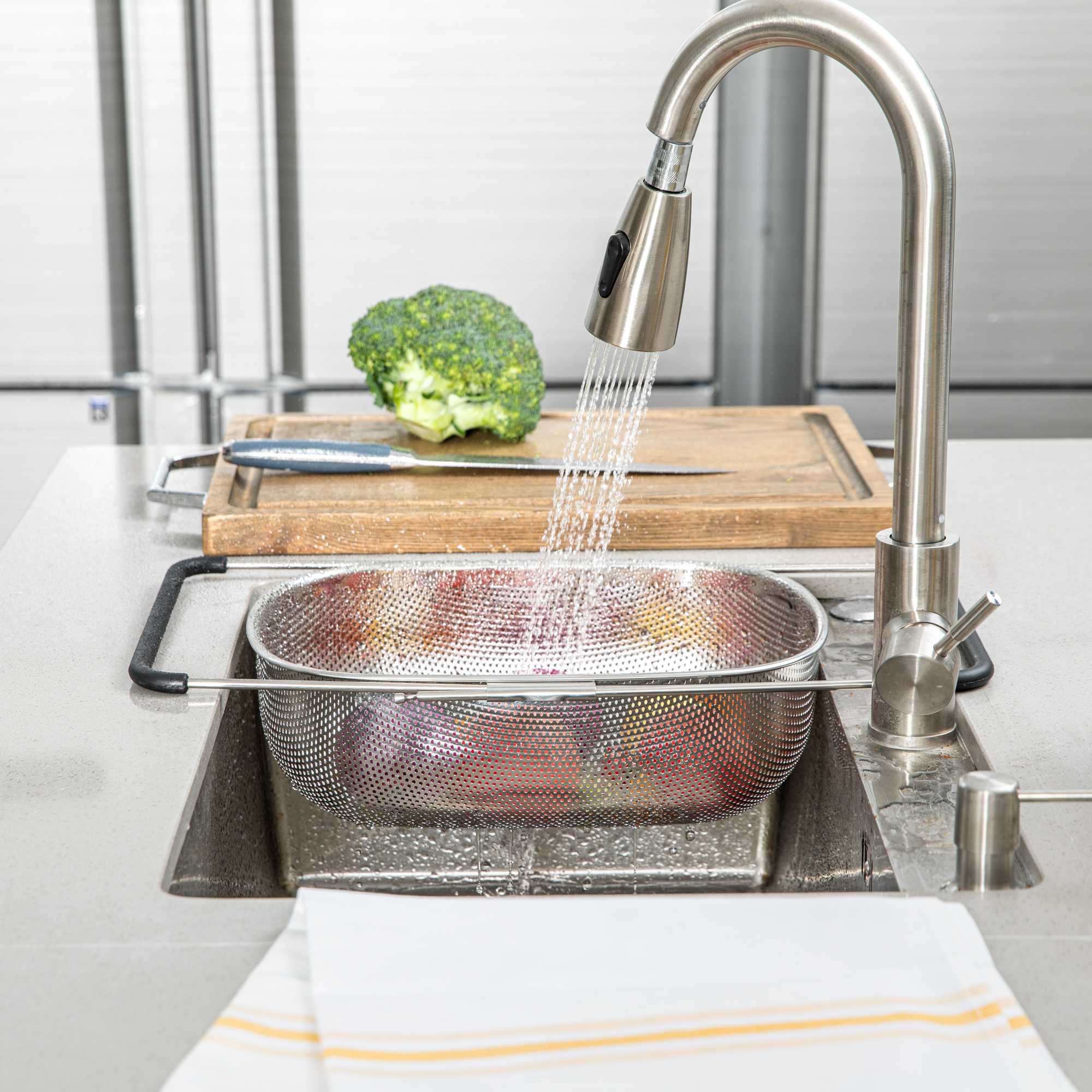 - Extendable handles provide hands-free over-the-sink use