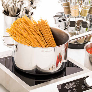 Constructed from premium stainless steel, this 6 quart saucepan is designed with measurement markers on the inside for easy and efficient ingredient measuring. The large basin is designed with a contoured lip to reduce spillage when pouring and emptying, and the dual handle makes for easy lifting and pouring. This saucepan is a must-have cookware tool for any chef and restaurant. Each Met Lux 6 Quart Induction Ready Dual Handle Stainless Steel Sauce Pan measures 9.4 inches in width, holds up to 6 quarts (192 ounces) and ships one per order. Stainless steel lids for this saucepan can be purchased separately (RWT0310).