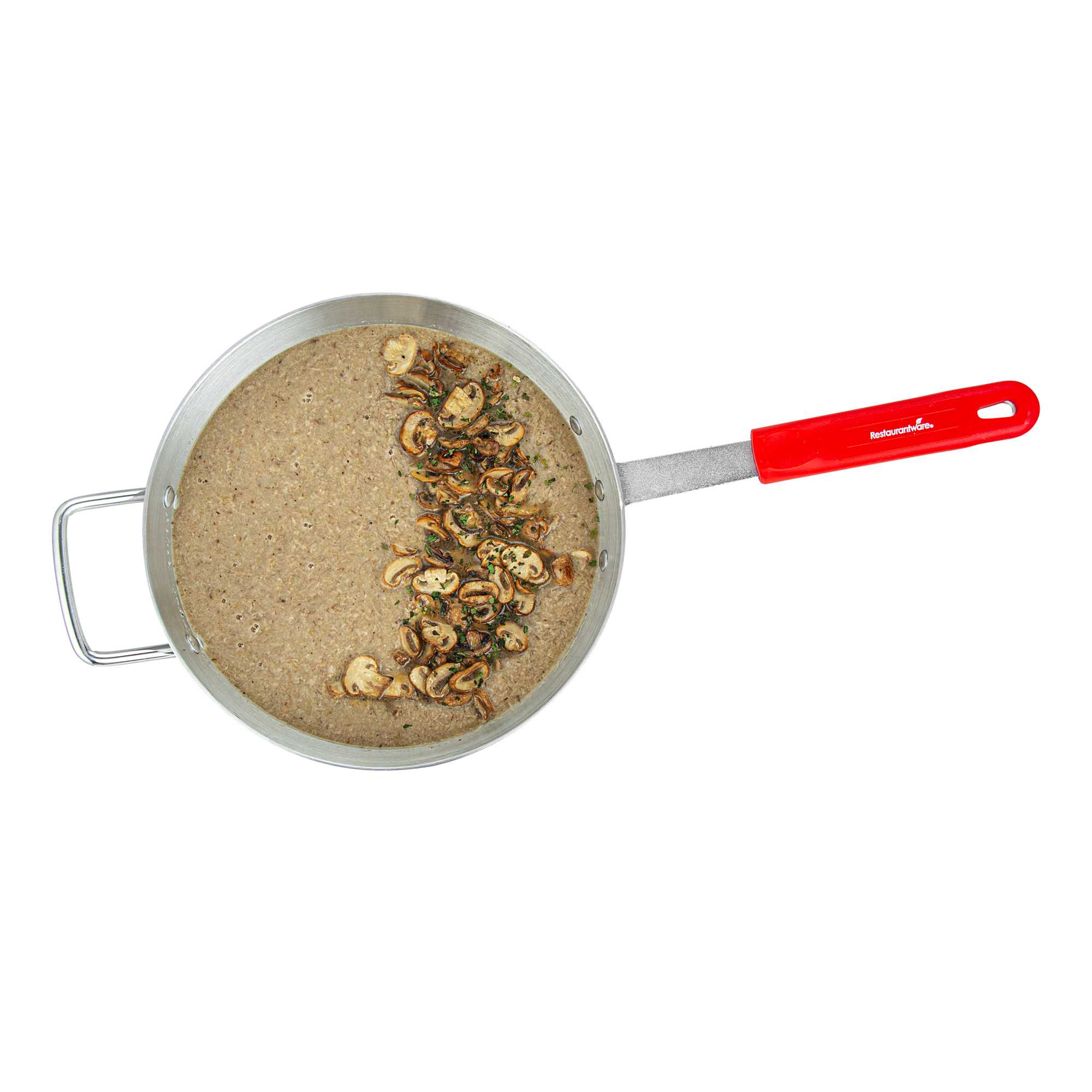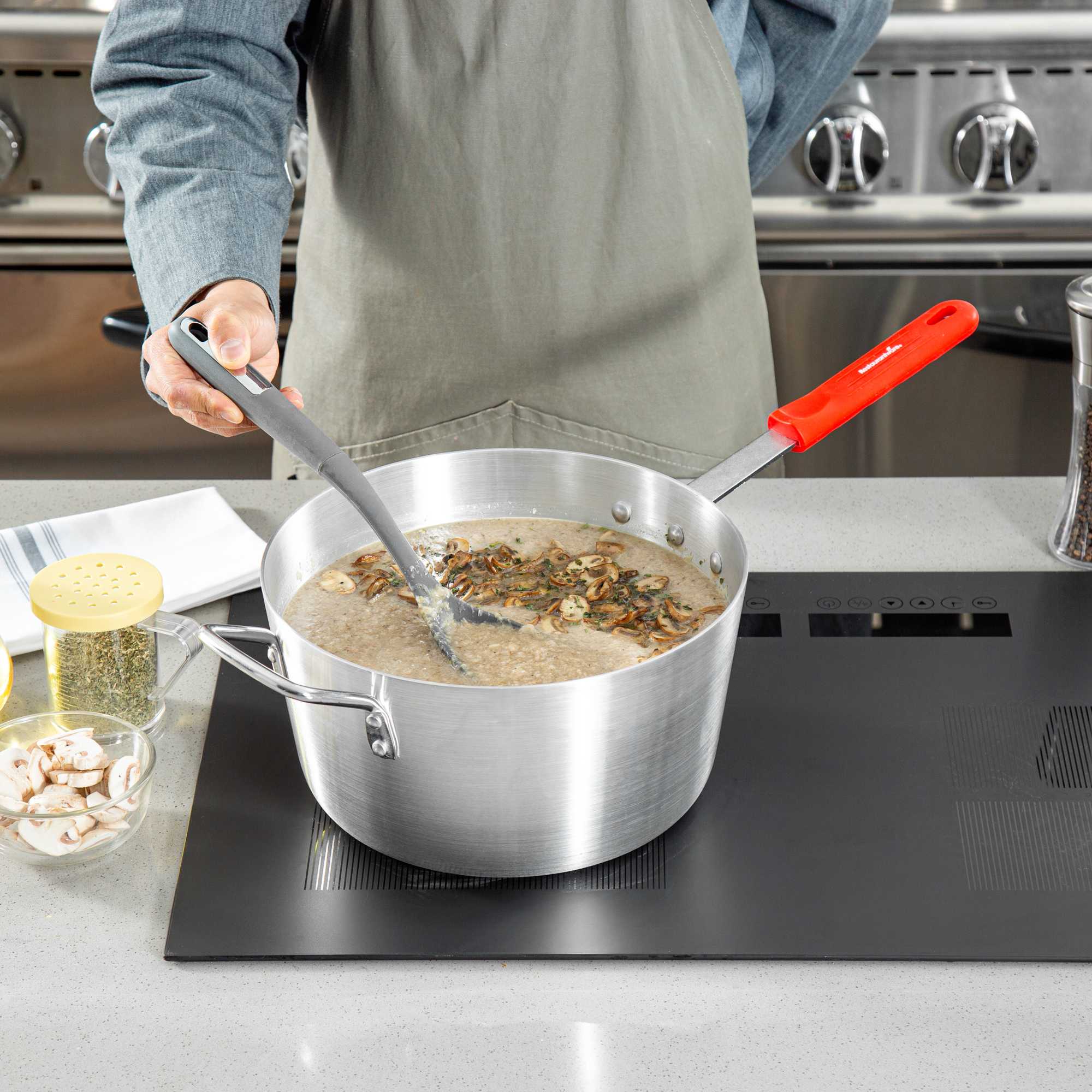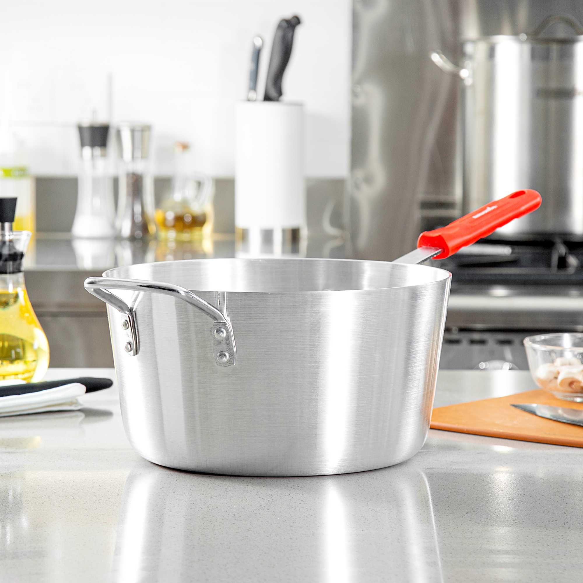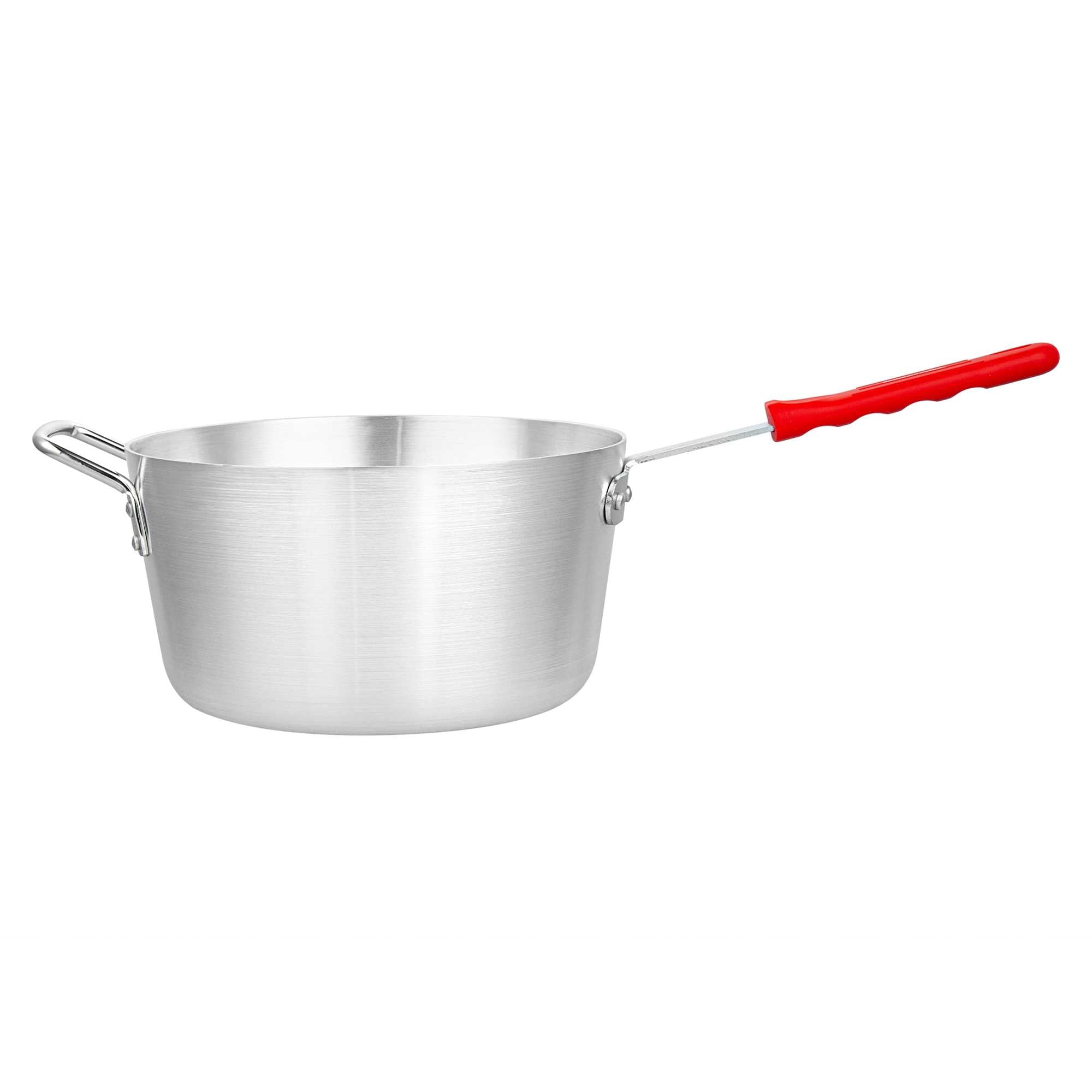 Effortlessly enhance your culinary creations with even heat distribution. The Met Lux Aluminum Sauce Pan with 7-quart capacity offers a tapered design that aids in even heat distribution, making it ideal for simmering sauces and boiling liquids in both commercial kitchens and home environments. Constructed of 3003 series, 2.5 millimeter thick aluminum, this commercial kitchen sauce pan ensures consistent cooking results while its 22.24-inch length accommodates various stovetop sizes. The vibrant red silicone handle stays cool, providing a safe grip and minimizing burn risks, crucial for high-paced, professional settings. Oven safe, this tapered sauce pan supports versatile cooking applications, allowing chefs to seamlessly transition from stovetop to oven. Its sturdy riveted design resists warping, with a removable silicone sleeve that withstands temperatures up to 450F, ensuring long-lasting durability. Sold in a 1 count box.