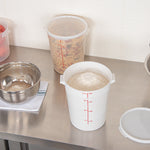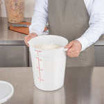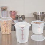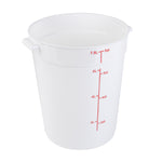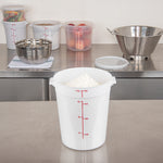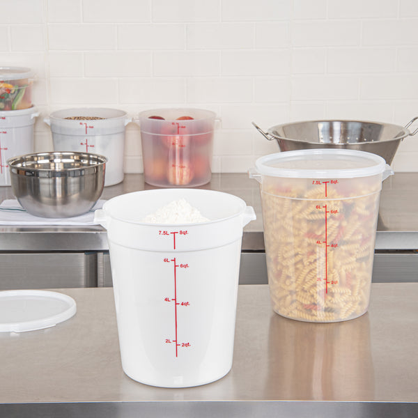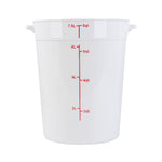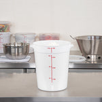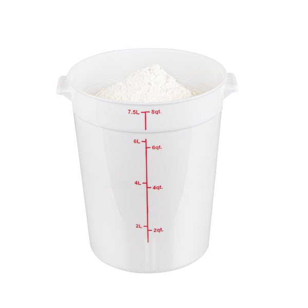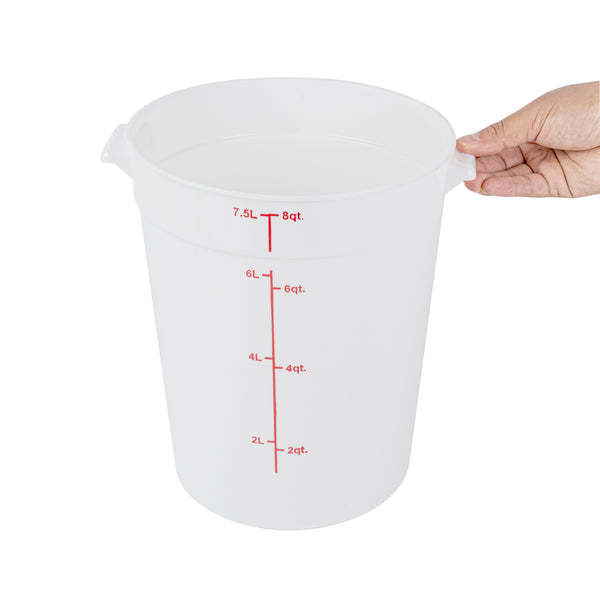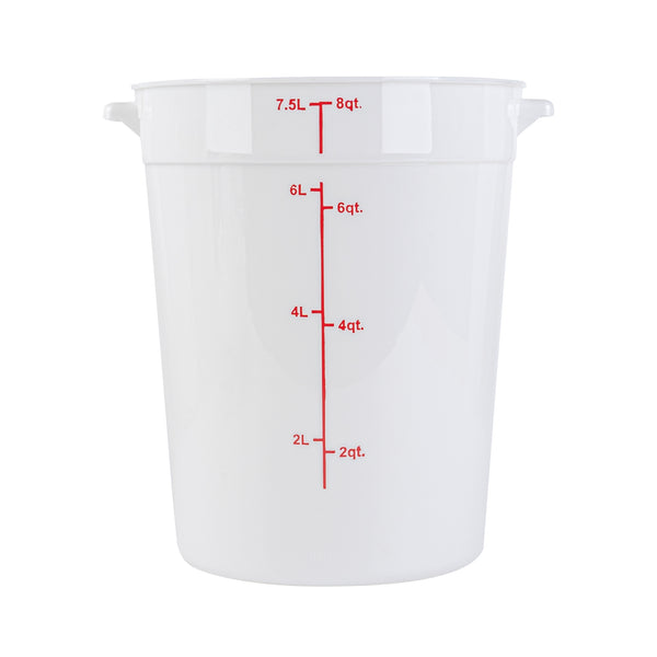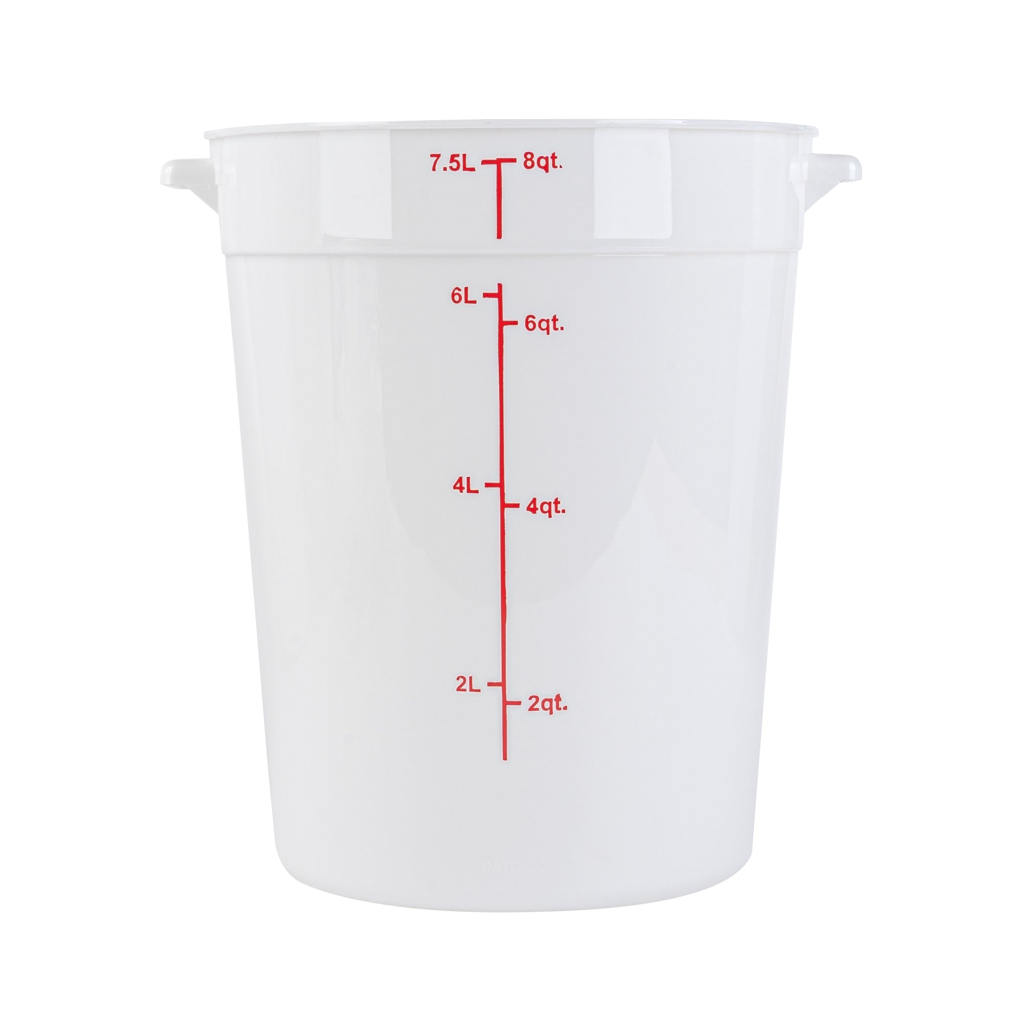 Streamline your kitchen organization with our Met Lux 8-quart Round White Plastic Food Storage Container. Crafted from durable PP plastic, this food storage container is built to withstand wear and tear, ensuring long-lasting use in your commercial kitchen. Featuring red volume markers, this plastic food storage container allows for easy measurement and portion control, helping to reduce food waste. The stable handle of this round plastic food container makes transport effortless, enhancing efficiency in your establishment. Designed to withstand temperatures ranging from -40 to 160 degrees Fahrenheit, this food container is both freezable and dishwashable, providing the versatility your kitchen requires. With a white finish, this round plastic container allows for quick identification of contents, saving you time during busy service hours. Boasting a generous capacity of 8 quarts, this storage container is ideal for storing large batches of ingredients or prepared food. Pair this container with our lid (SKU: RWT1575C-1) to seal in freshness. Measuring 8.75 inches in diameter by 10.75 inches in height, this food container is compact and easy to store, providing valuable kitchen space. Sold in a 1 count box. Lid is available and sold separately.