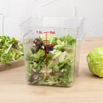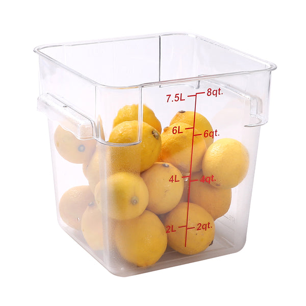 Conveniently store ingredients with our Met Lux 8-quart Square Clear Plastic Food Storage Container. This plastic food storage container has red volume markers in quarts and liters, providing your kitchen staff with a quick and effortless way to keep track of inventory. With built-in handles, this square food container offers a safe and comfortable way to transport foods from the refrigerator to the prep area at your restaurant, diner, or food truck. Crafted from premium plastic, this durable food storage box is resistant to stains and odors to withstand everyday use at your foodservice establishment. With a clear finish, this plastic food container allows employees to easily identify products inside containers. Seal this clear kitchen container with our coordinating lid (SKU: RWT0842-1) to prevent messy accidents in your kitchen. This kitchen storage box is safe for commercial dishwasher use to streamline your cleaning process at the end of the day. Great for enhancing organization, this freezer-safe container is stackable for quick and simple storage in your prep room. Containing up to 8 quarts, this plastic food box measures 8.75 inches wide by 8.5 inches tall. This durable food container can endure temperatures from -40F to 210F. Ships in a 1 count box. Lid is available and sold separately.