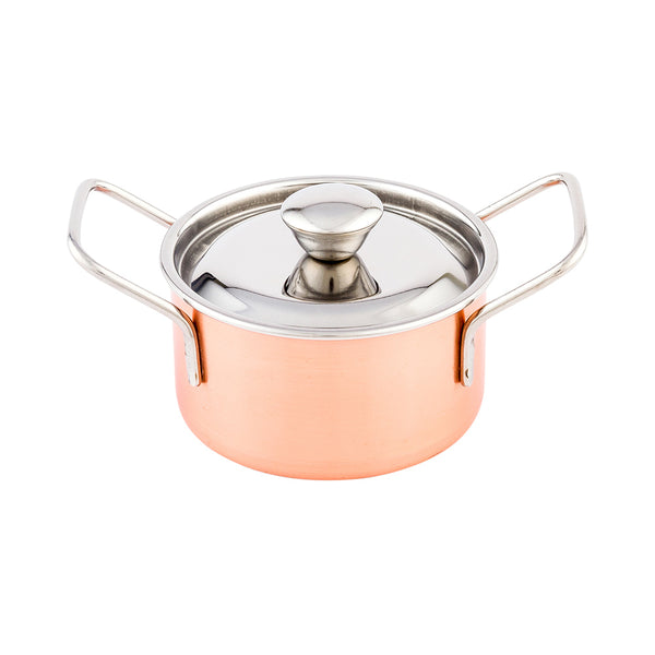 Create one of a kind food presentations with our Met Lux Small Copper Plated Individual Casserole Pots with Lids. Featuring a sleek copper plating, these small casserole dishes effortlessly complement the decor of any venue or event. With a durable stainless steel construction, these mini serving dishes are break-resistant and built to sustain long-lasting use. These 9 ounce stainless steel casserole pots are great for serving various types of cheeses fondue-style at your restaurant or for baking individuals serving of chocolate lava cakes for your next catering event. Sold with a coordinating lid, these small tasting bowls measure 5.8 inches long by 3.5 inches wide and holds 9 ounces. Each pot with lid is shipped in a 1 count box.