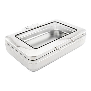 The stainless steel construction on this elegant 9-quart rectangular chafing dish body is welded for durability and easy cleaning. This chafing dish body is made to trap heat, keeping foods at a healthy ready-to-serve temperature for hot, fresh food every time. The large glass viewing window allows for easy visibility. Whether you're serving a buffet, banquet, or wedding reception, this rectangular chafer will ensure guest satisfaction and gala success. Each Met Lux Full Size 9 Quart Rectangular Induction Ready Chafer Stainless Steel Body with Glass Viewing Window measures 22.6 inches L by 18.3 inches W, holds up to 9 quarts (288 ounces), and is shipped in a 1 count box. Stands can be purchased separately.