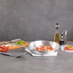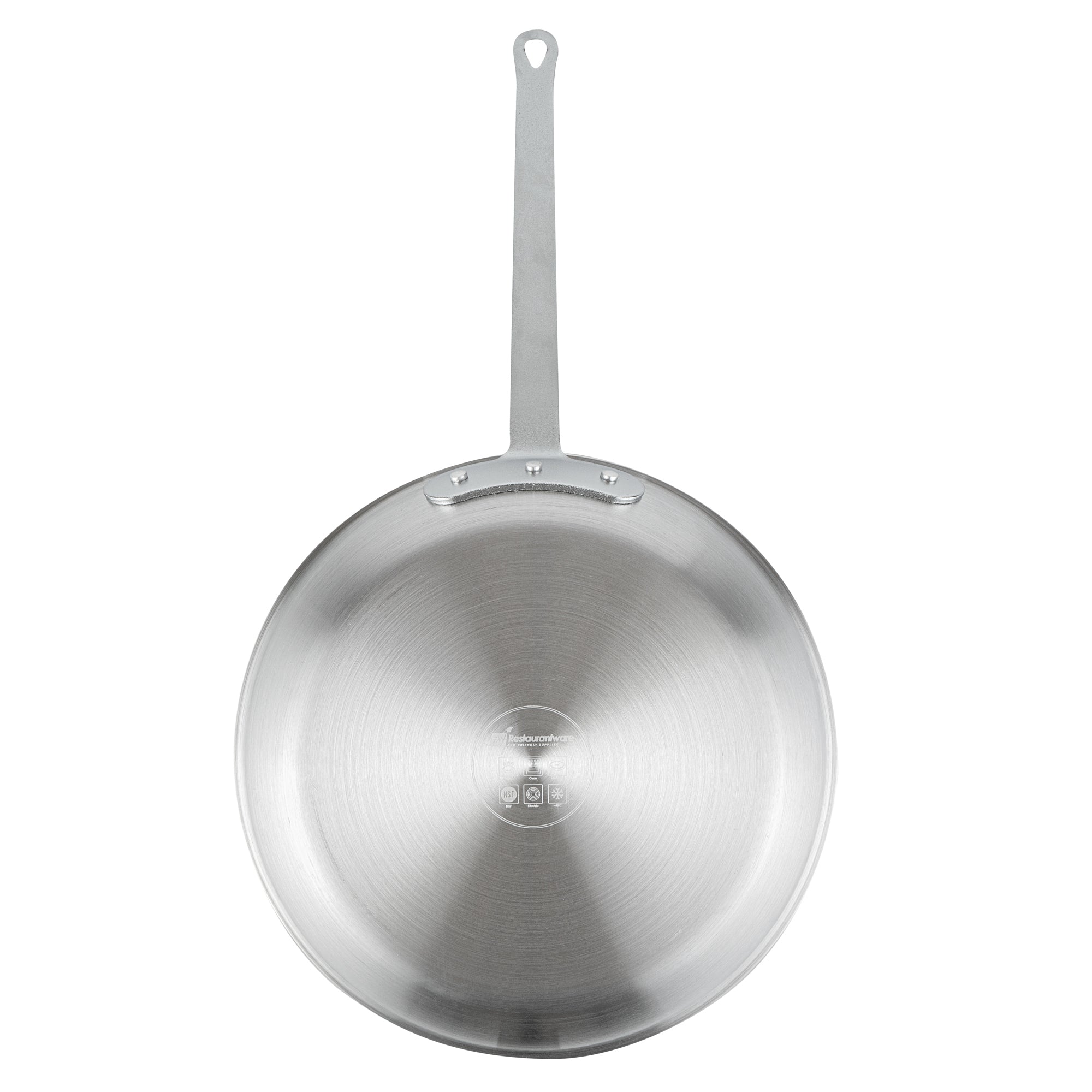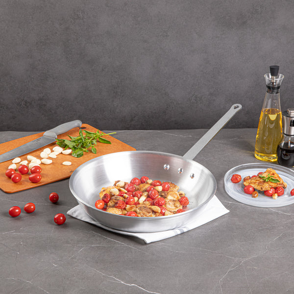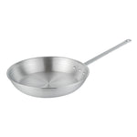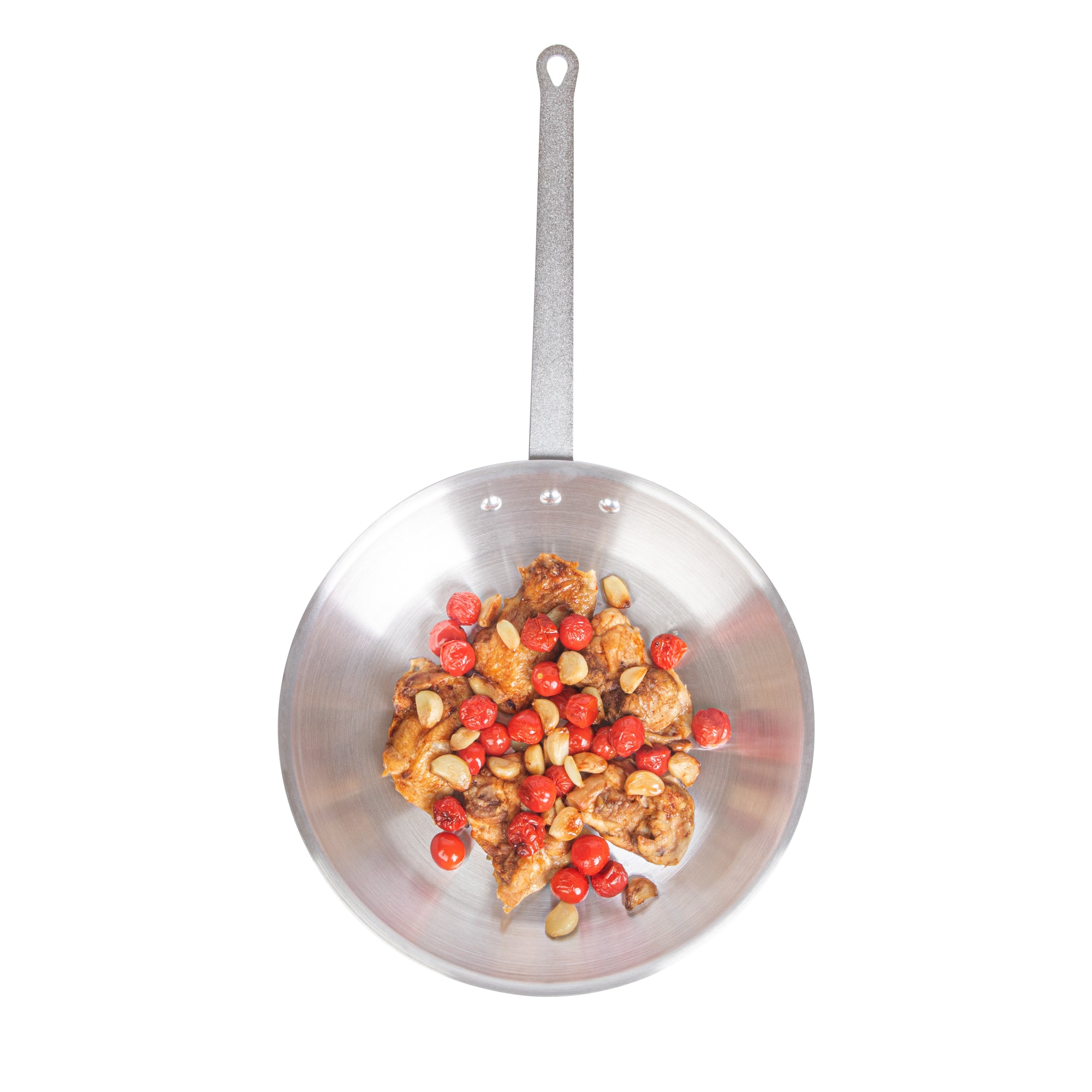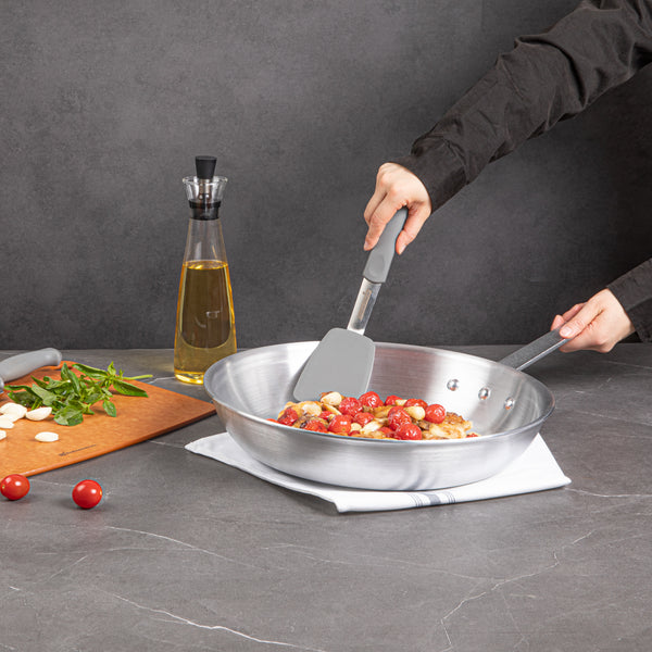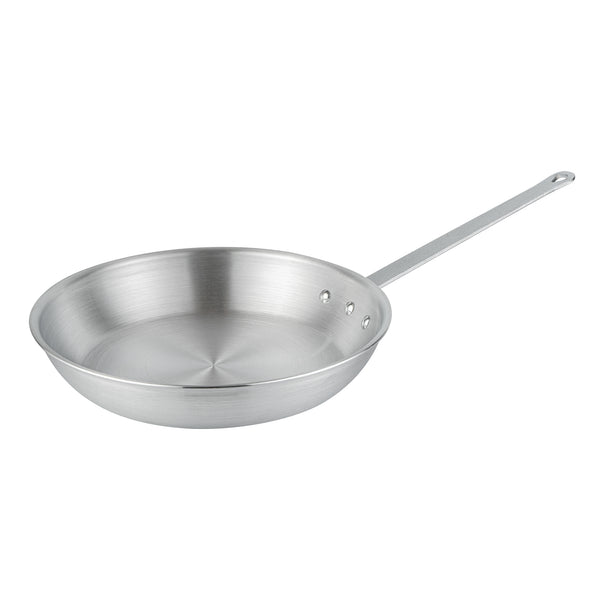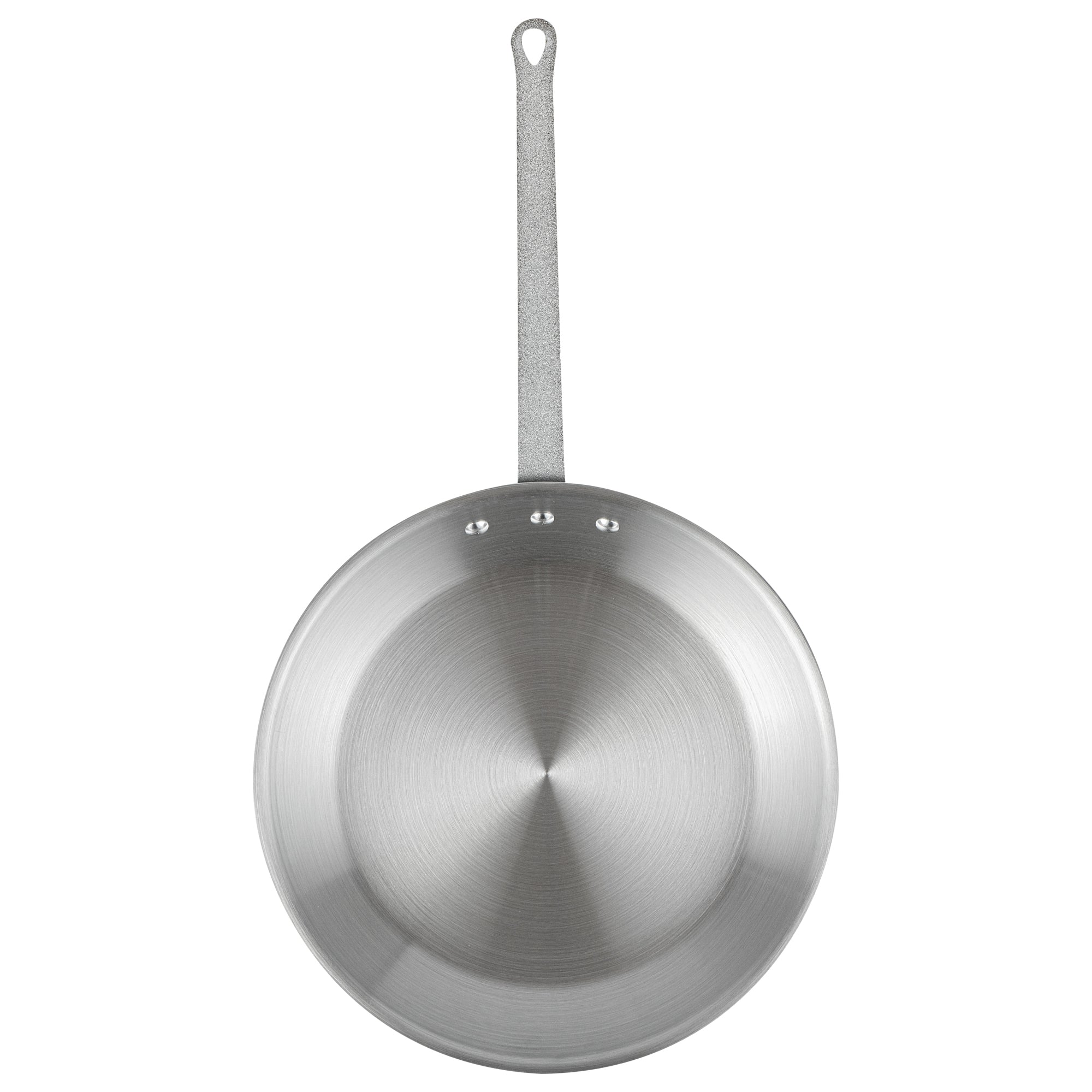 Enhance your culinary creations with our Met Lux Aluminum 14-inch Fry Pan. This fry pan, constructed from 3.5 mm thick aluminum, offers exceptional heat distribution for even cooking and browning. Lightweight yet durable, this silver fry pan makes maneuvering in the kitchen effortless, whether flipping pancakes or sauteing vegetables. Boasting a satin finish, this aluminum fry pan provides superior performance and adds a touch of elegance to your cookware collection. The triple-riveted handle of this frying pan facilitates a secure transfer from the stovetop to the oven. For added convenience, this skillet pan also features a hanging hole, allowing for easy storage and quick access. This aluminum skillet is designed for hand washing, ensuring optimal care and maintenance. Including the handle, this 14-inch fry pan measures 26 inches in length by 6.5 inches in height, offering ample cooking surface to cater to your diverse culinary needs. Sold in a 1 count box.