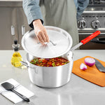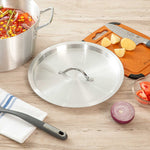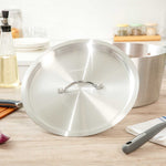 Seal in heat and flavor effortlessly with our Met Lux Aluminum Pan Cover. This versatile cookware lid, crafted from durable aluminum, is designed to fit snugly on your 10-quart saucepan (sold separately), providing a secure fit that locks in moisture and retains heat efficiently. Its warp-resistant construction ensures consistent performance, while its lightweight design allows for easy handling and quick adjustments. The stainless finish lid adds a sleek touch to your cookware collection, making it a practical addition to any commercial kitchen setup. This aluminum pan cover is oven safe, offering versatility for various cooking and storage needs. Whether you're simmering sauces or preparing large batches of soups, this moisture-trapping lid helps speed up cooking times and reduce spatter, contributing to a cleaner kitchen environment. Sold in a 1 count box.