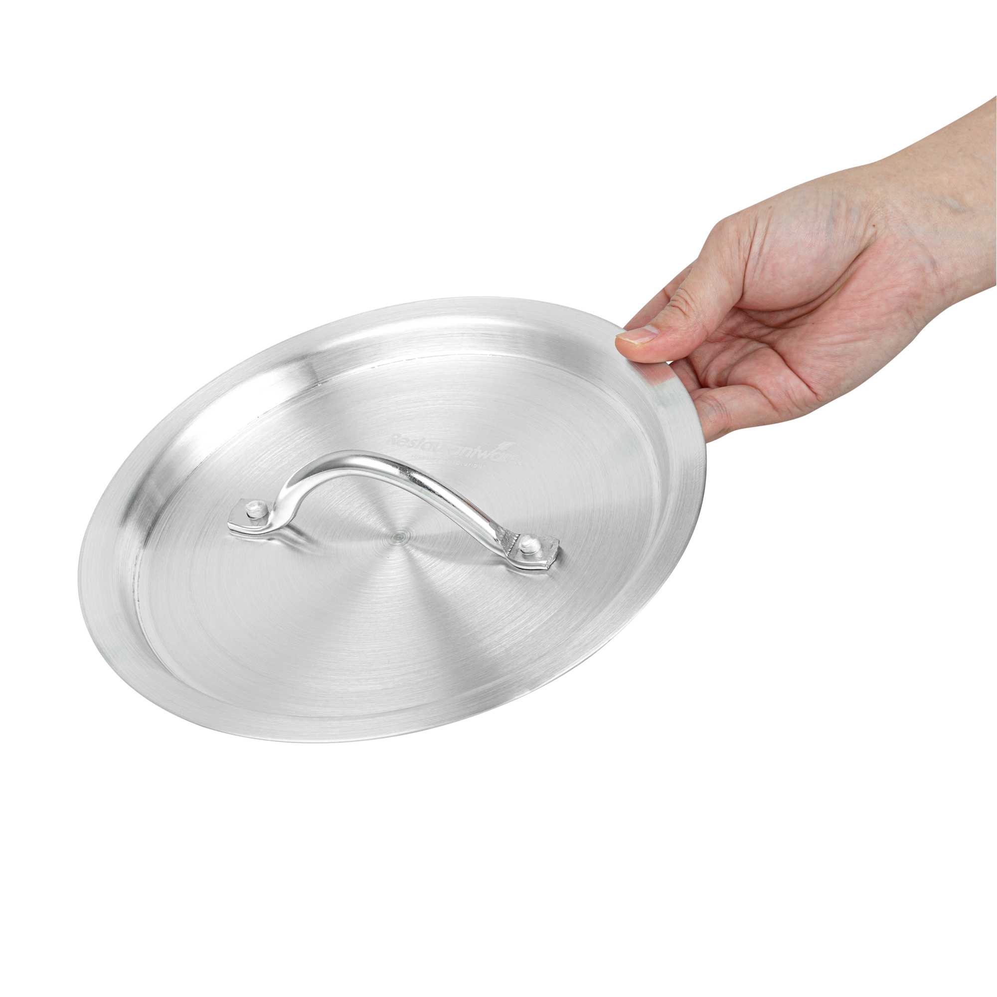 - Aluminum lid seals in heat, reduces spatter, maintains moisture