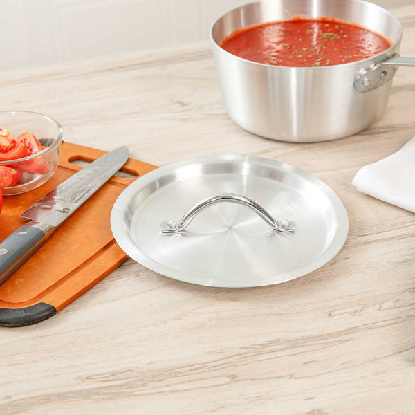 Seal in heat and enhance cooking efficiency with Met Lux Heat-Sealing Sauce Pan Lid. This aluminum sauce pan lid is expertly crafted to seal in heat, reduce spatter, and maintain moisture, ensuring your dishes are cooked to perfection. Its handle is easy to grab with a pad or towel, significantly reducing the risk of burns during use as an oven safe pan cover. Designed to withstand high temperatures, this cooking pot lid is oven-safe, making it a versatile addition to any professional kitchen. With dimensions of 8.74 inches by 8.74 inches, these lids fit securely on 2.75 quart sauce pans (sold separately), promoting efficient cooking while providing a clean, professional appearance. The warp-resistant aluminum construction ensures durability and longevity, supporting everyday use without compromising quality. Equip your kitchen with these essential tools to elevate your cooking experience. Sold in a 1 count box.