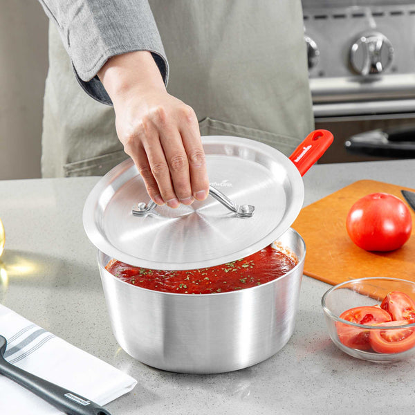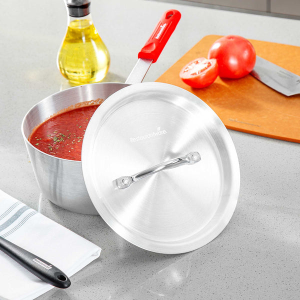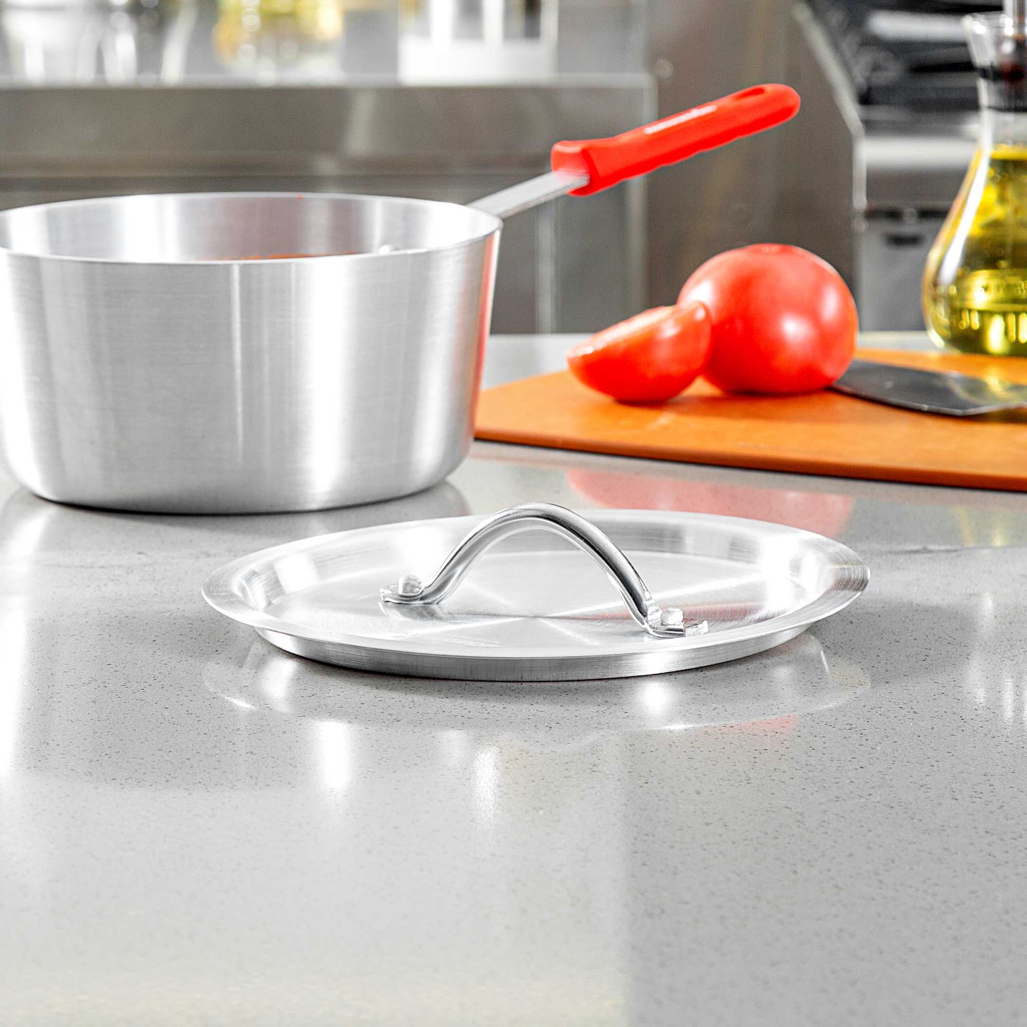 Seal in heat and enhance cooking efficiency with Met Lux Heat-Sealing Sauce Pan Lid. This aluminum sauce pan lid is expertly crafted to seal in heat, reduce spatter, and maintain moisture, ensuring your dishes are cooked to perfection. Its handle is easy to grab with a pad or towel, significantly reducing the risk of burns during use as an oven safe pan cover. Designed to withstand high temperatures, this cooking pot lid is oven-safe, making it a versatile addition to any professional kitchen. With dimensions of 8.74 inches by 8.74 inches, these lids fit securely on 2.75 quart sauce pans (sold separately), promoting efficient cooking while providing a clean, professional appearance. The warp-resistant aluminum construction ensures durability and longevity, supporting everyday use without compromising quality. Equip your kitchen with these essential tools to elevate your cooking experience. Sold in a 12 count box.