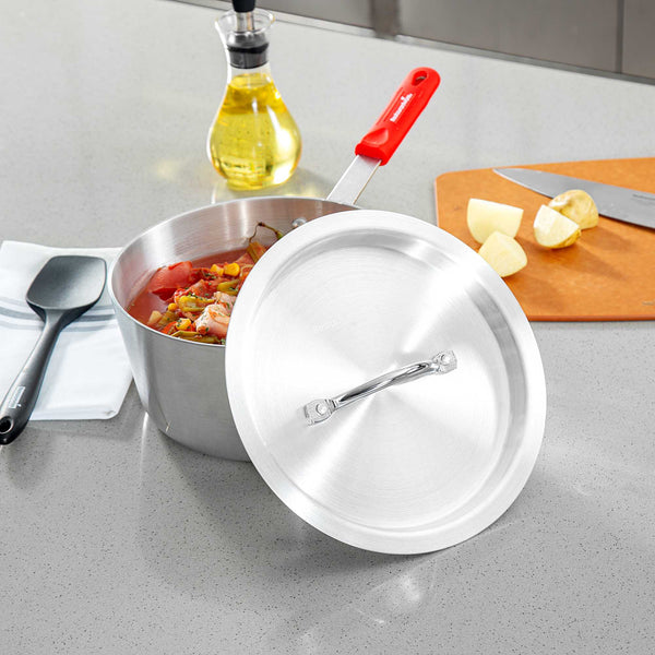 Enhance your kitchen's efficiency with superior heat retention. The Met Lux Heat-Sealing Aluminum Saucepan With Lid features an expertly designed aluminum lid that seals in heat and reduces spatter, keeping your cooking area clean and safe. This aluminum lid offers a secure fit on 3.75 quart sauce pans (sold separately) and traps heat and moisture, promoting faster and more consistent cooking results. Its easy-grab handle is designed to reduce the risk of burns when using a hot pad or towel, adding an extra layer of safety in bustling kitchens. With dimensions of 9.53 inches by 9.53 inches, this oven safe pan is built to withstand high temperatures, ensuring versatile cooking options. The nonstick aluminum construction is resistant to warping and corrosion, providing durability for daily use while maintaining a professional appearance. Equip your kitchen with this indispensable tool for efficient meal preparation. Sold in a 1 count box.