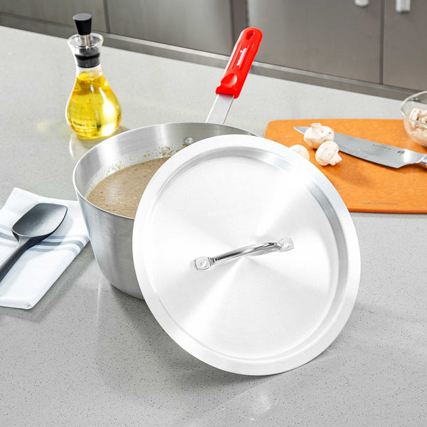 Enhance cooking efficiency with our heat-sealing solutions. The Met Lux Aluminum Saucepan Cover expertly seals in heat, reducing spatter and preserving the contents of your saucepan during cooking. Crafted from warp-resistant aluminum, this oven safe lid measures 11.18 inches in diameter and fits securely on 5.5 quart sauce pans (sold separately) to trap heat and moisture, making it an essential tool for versatile cooking applications. The warp-resistant cover ensures durability, resisting corrosion for everyday kitchen use, while the easy-to-grab handle is designed for easy gripping with a hot pad or towel, minimizing the risk of burns. Its lightweight construction facilitates easy handling, and its professional silver finish offers a clean, polished look, ideal for any culinary setting. Optimize your cookware with this aluminum saucepan cover, designed for performance and reliability. Sold in a 6 count box.