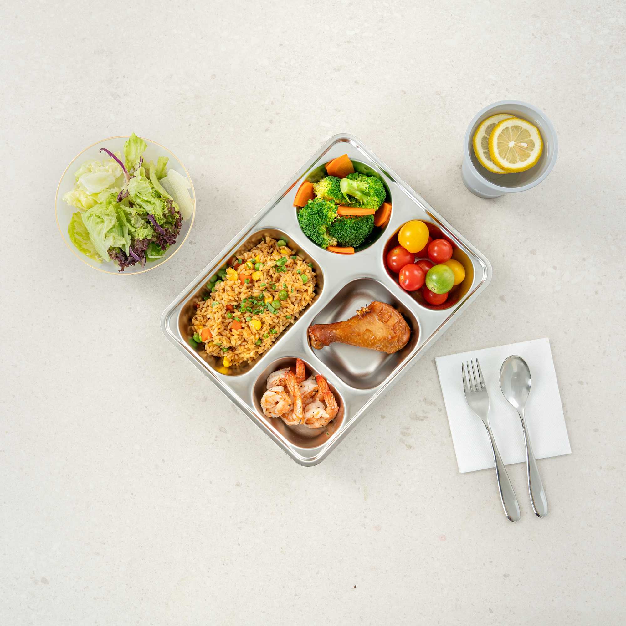 AMBIDEXTROUS RECTANGLE STAINLESS STEEL TRAY - 5 COMPARTMENTS