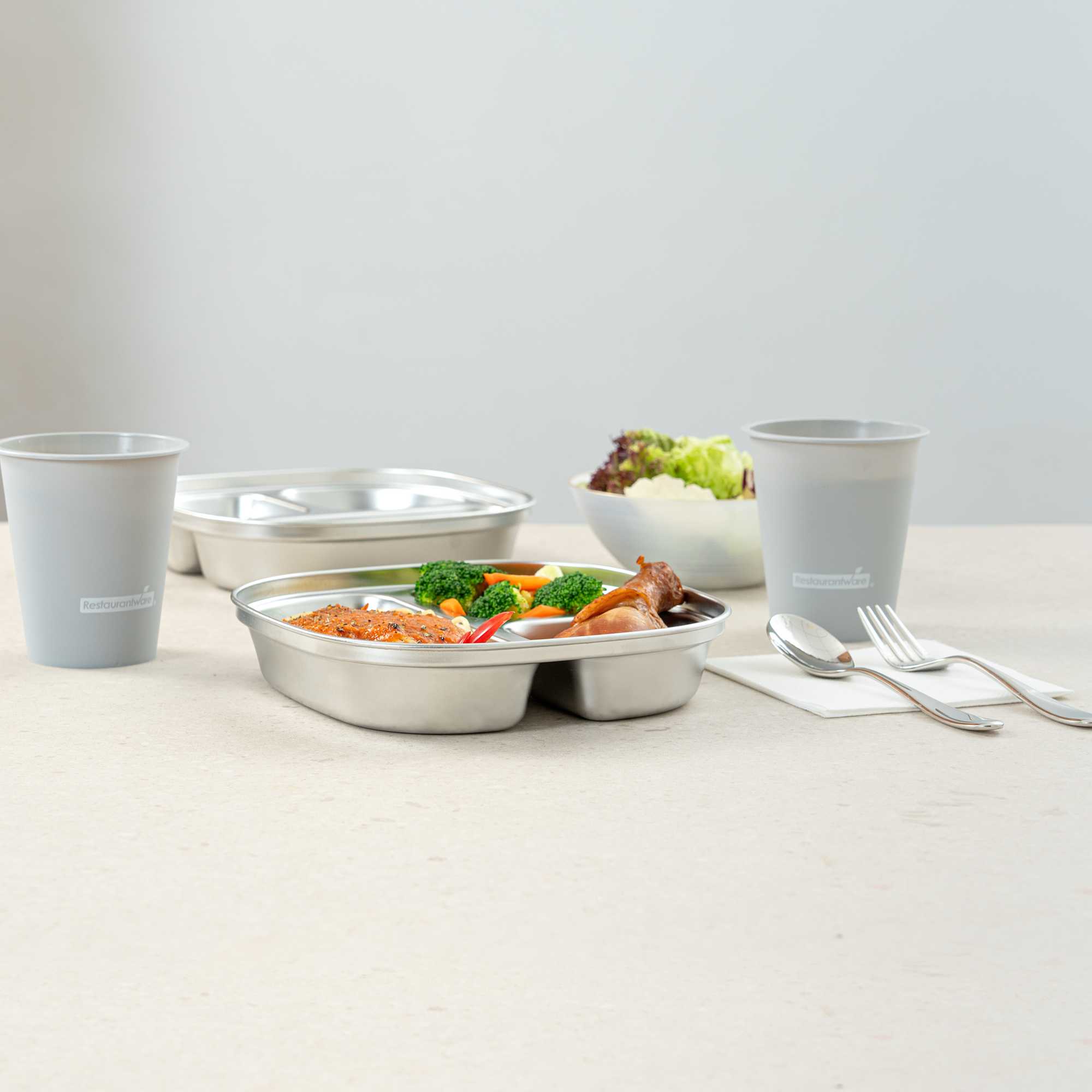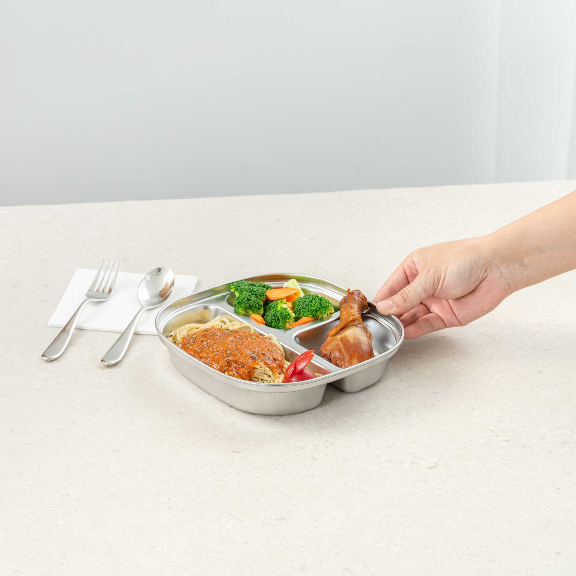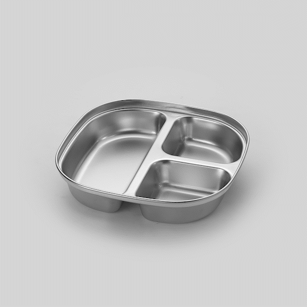 AMBIDEXTROUS SQUARE STAINLESS STEEL TRAY - 3 COMPARTMENTS