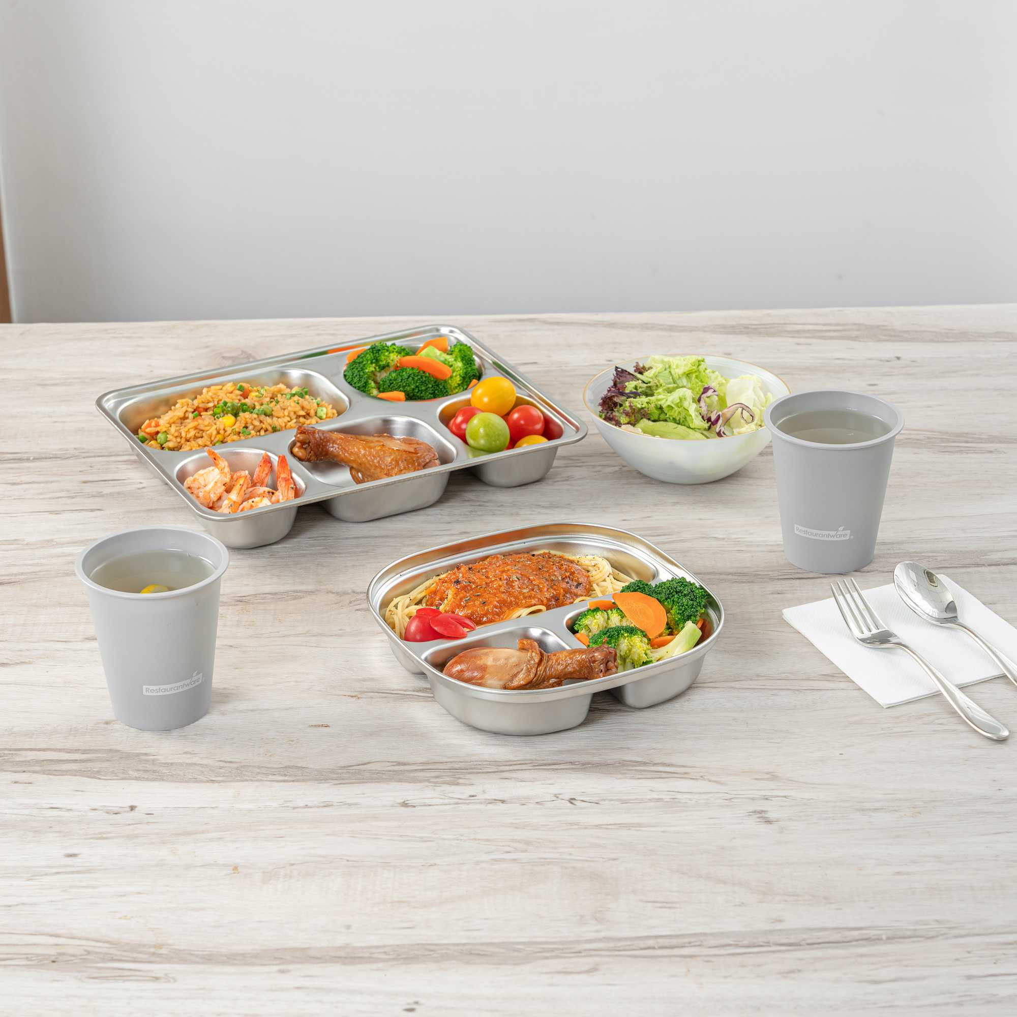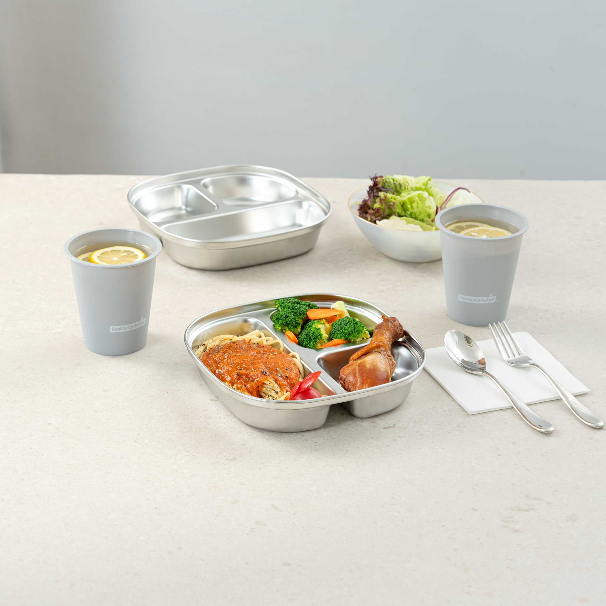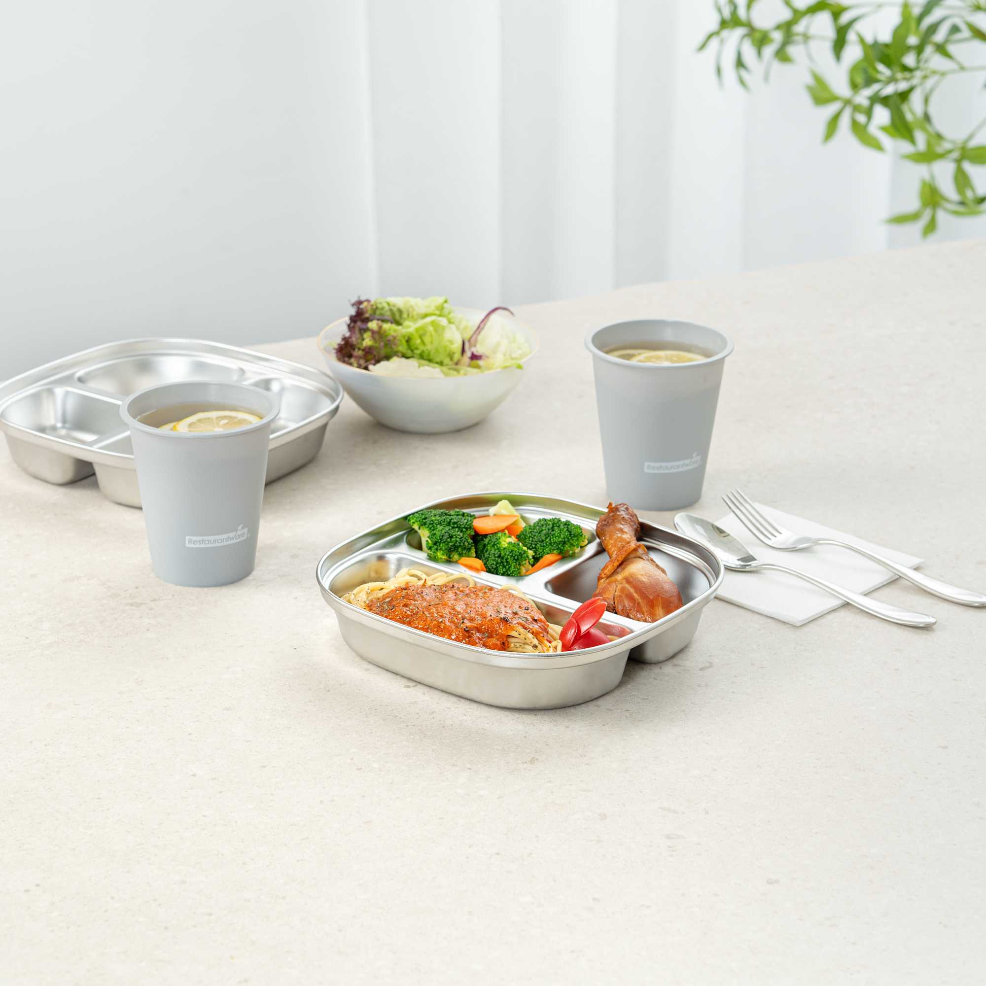 Enhance meal presentation with our Met Lux Ambidextrous Square Stainless Steel Trays. Expertly crafted from durable stainless steel, this food tray features a three-compartment layout that supports organized plating and portion control, ideal for cafeterias, catering services, and institutional dining. Its ambidextrous design accommodates both left- and right-handed users, offering a practical solution for high-traffic foodservice settings. Built for commercial use, this tray is dishwasher-safe to allow for fast cleanup. Measuring 7.68 inches in length, 7.68 inches in width, and 1.65 inches in height, its compact square profile delivers space-saving stackability while offering just the right amount of room for balanced meals. Sold in a 20 count box.