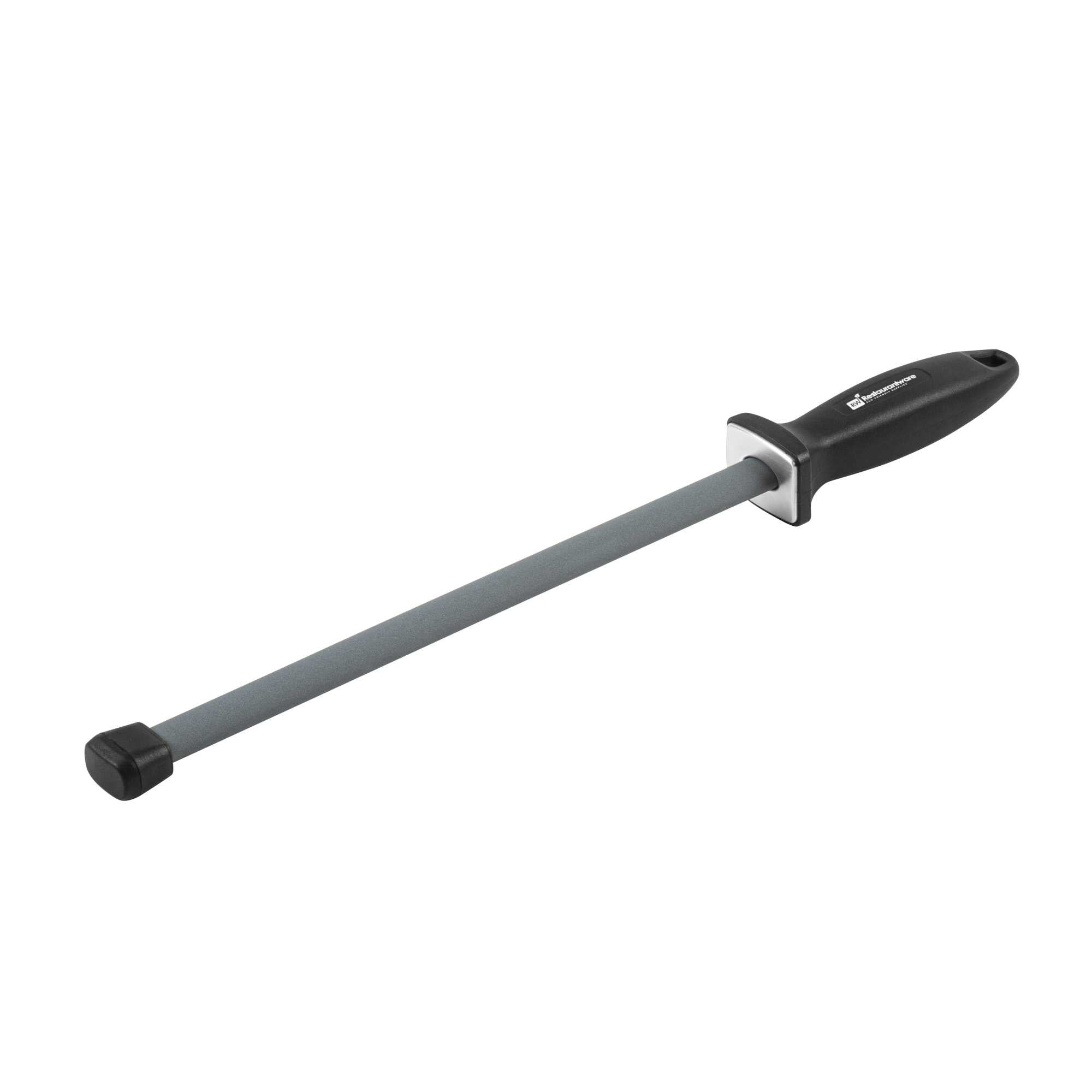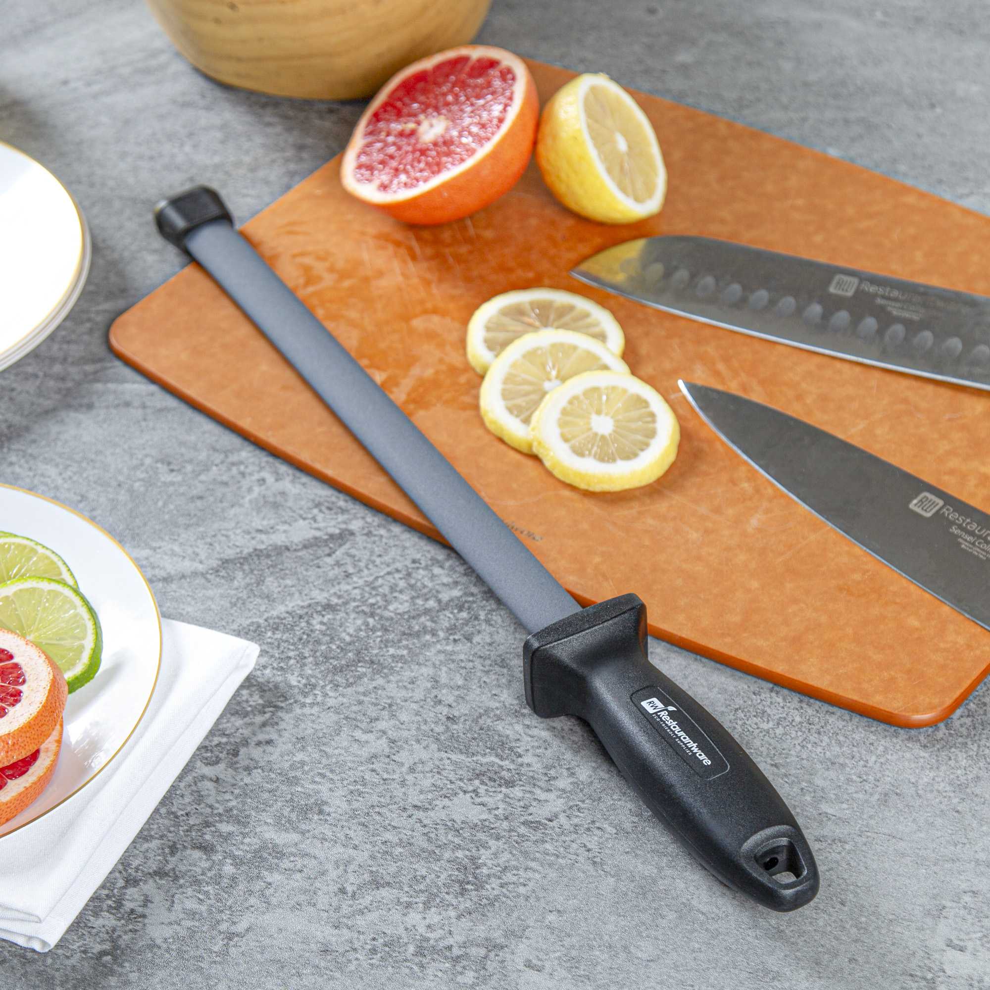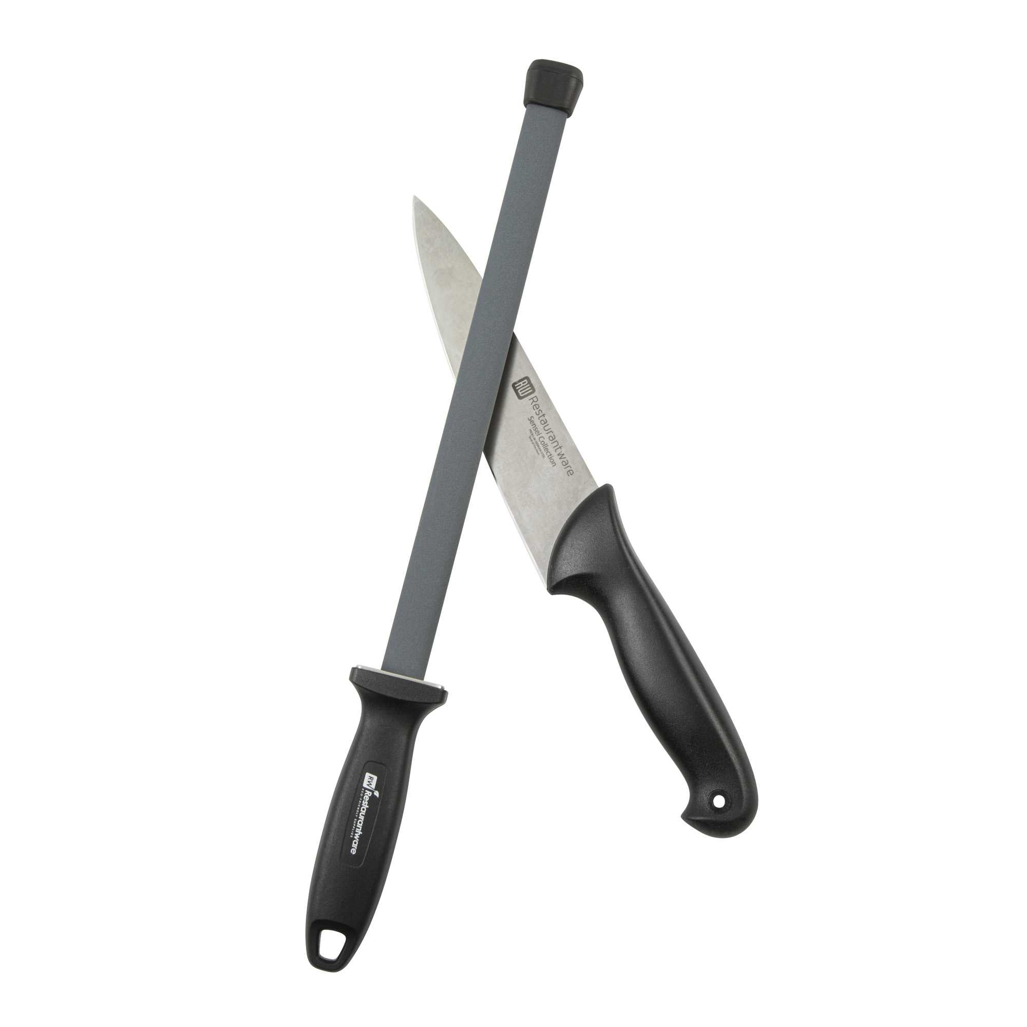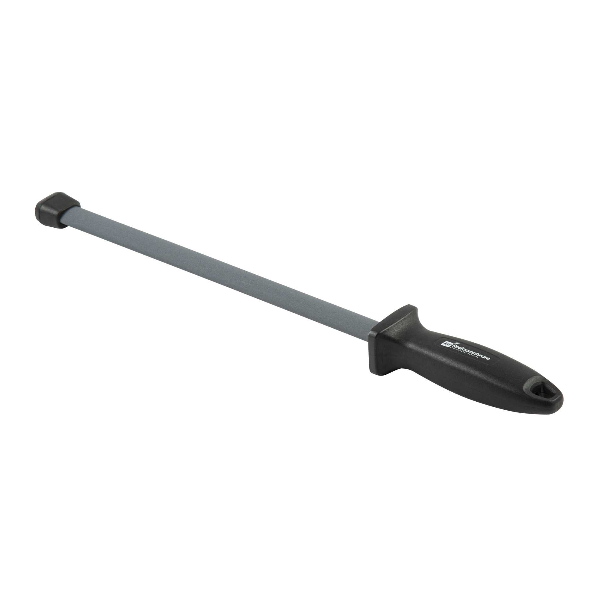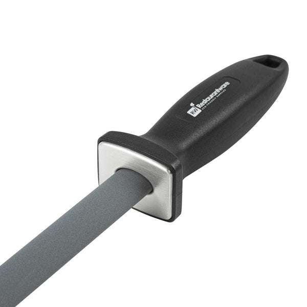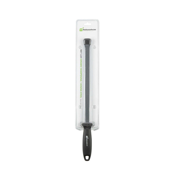 Keep your collection of kitchen knives sharp using our Met Lux Black Ceramic Sharpening / Honing Steel. Crafted with high-quality ceramic, this honing steel polishes knives down until smooth, without shaving off bits of metal. The surface of this sharpening steel is grooved, making it ideal for maintaining and restoring a knife's edge. The durable ceramic construction of this honing rod is made to withstand vigorous use and is extremely durable to resist sharpening tough steel knives. Designed with a built-in nylon handle, this honing steel offers a comfortable and firm grip while sharpening knives to avoid any dangerous accidents. The stopper at the end of the honing rod absorbs shock and provides balance on surfaces while honing knife edges. Made with a chic all-black finish, this honing steel perfectly matches the rest of your commercial kitchen tools. The sharpening blade of this sharpening steel measures 12 inches long while the total length is 17.5 inches long. Shipped in a 1 count box.
