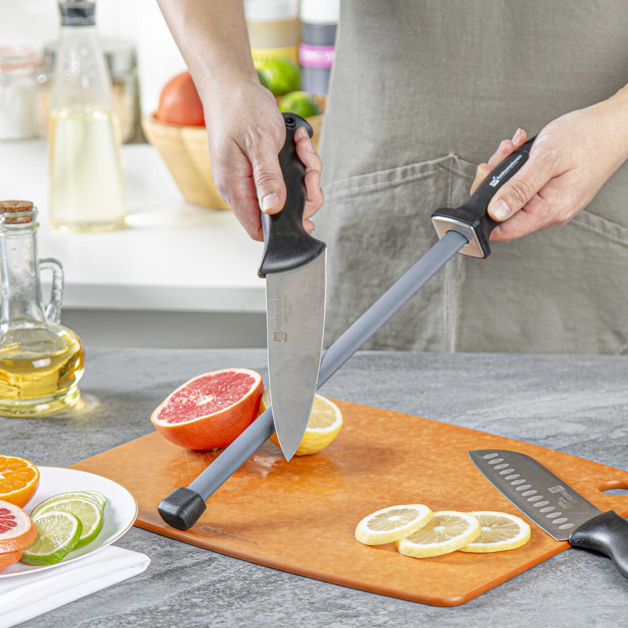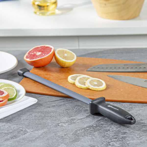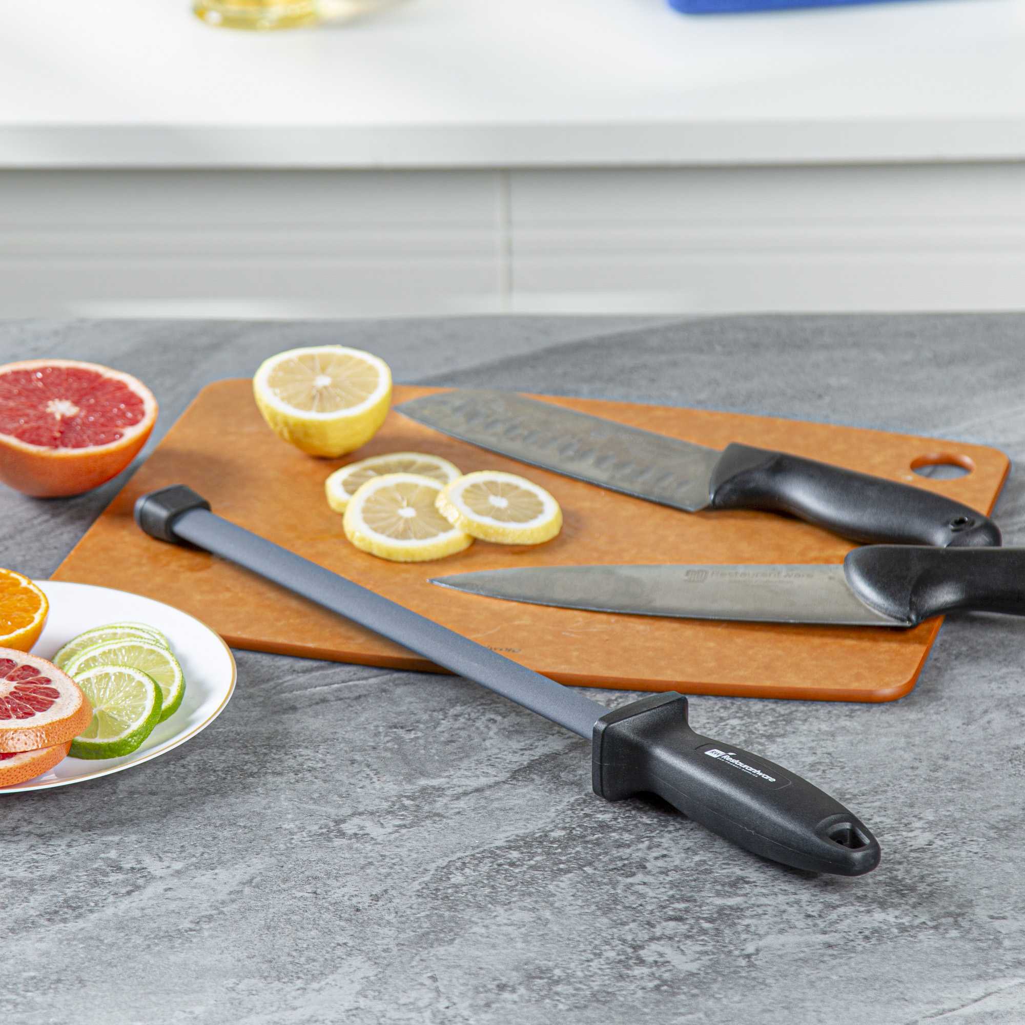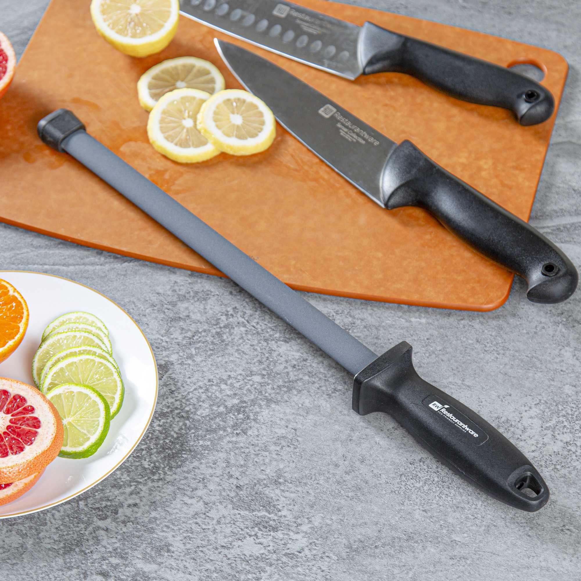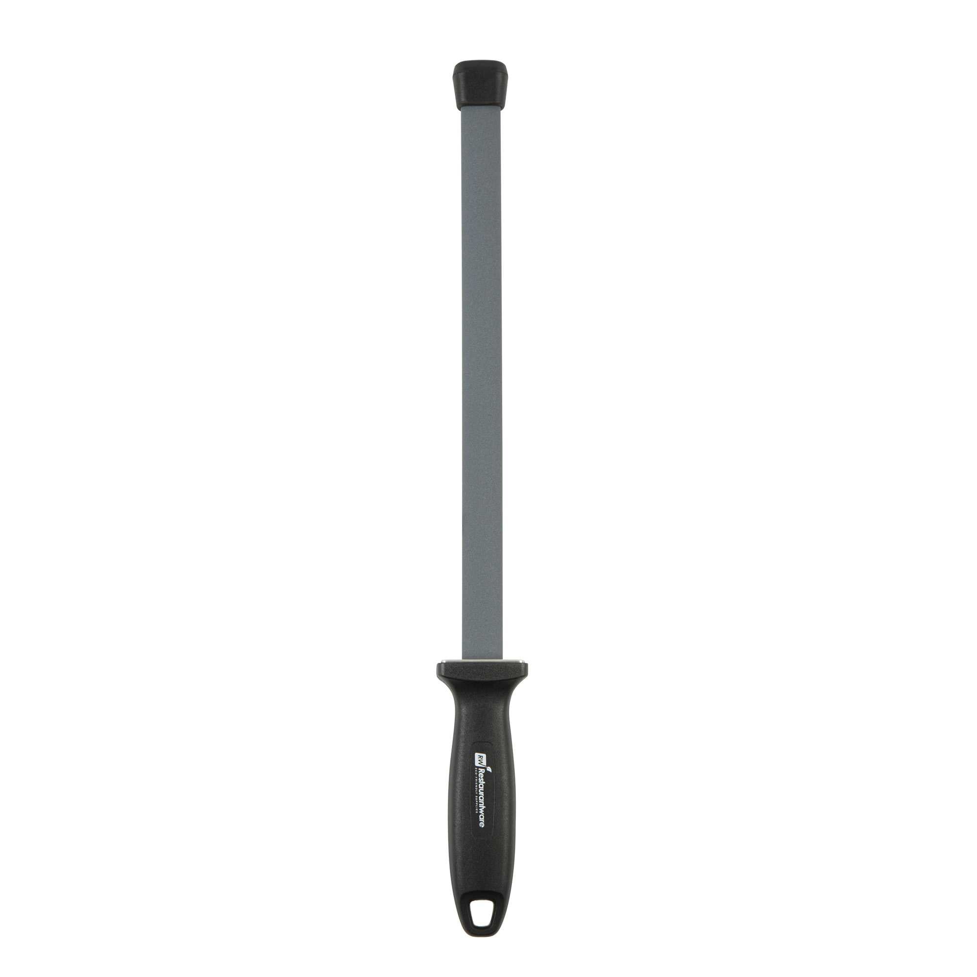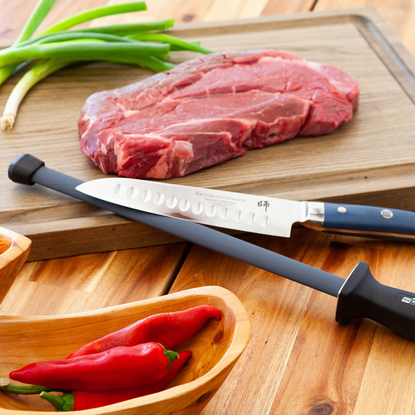 Keep your collection of kitchen knives sharp using our Met Lux Black Ceramic Sharpening / Honing Steel. Crafted with high-quality ceramic, this honing steel polishes knives down until smooth, without shaving off bits of metal. The surface of this sharpening steel is grooved, making it ideal for maintaining and restoring a knife's edge. The durable ceramic construction of this honing rod is made to withstand vigorous use and is extremely durable to resist sharpening tough steel knives. Designed with a built-in nylon handle, this honing steel offers a comfortable and firm grip while sharpening knives to avoid any dangerous accidents. The stopper at the end of the honing rod absorbs shock and provides balance on surfaces while honing knife edges. Made with a chic all-black finish, this honing steel perfectly matches the rest of your commercial kitchen tools. The sharpening blade of this sharpening steel measures 12 inches long while the total length is 17.5 inches long. Shipped in a 1 count box.