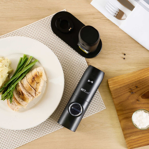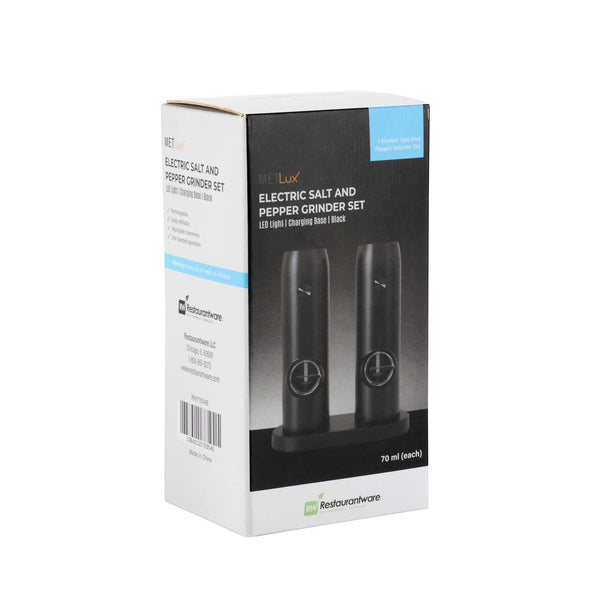 Ensure consistent seasoning with the Met Lux Electric Salt Grinder. This automatic spice grinder features a convenient charging base, guaranteeing it is always ready to enhance your culinary creations. Its built-in LED light is perfect for low-light environments, allowing chefs to accurately season dishes without missing a grain. The ceramic core of this usb rechargeable spice grinder maintains its sharpness over time, delivering precise and reliable grinding for long-term use. Measuring 6.5 inches in length and crafted from durable stainless steel, this grinder withstands the demands of busy kitchens and adds a sleek touch to any setting. Elevate your foodservice operations by incorporating this reliable tool into your kitchen arsenal. Each order includes 1 Met Lux Electric Salt Grinder.