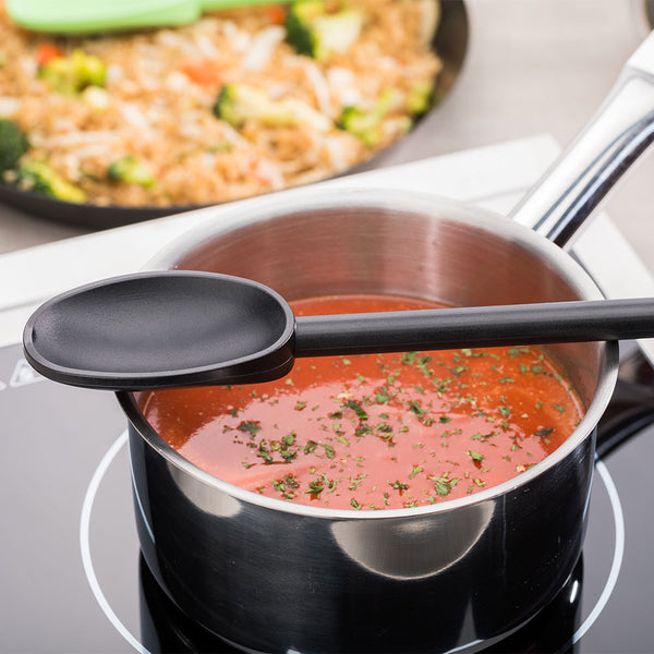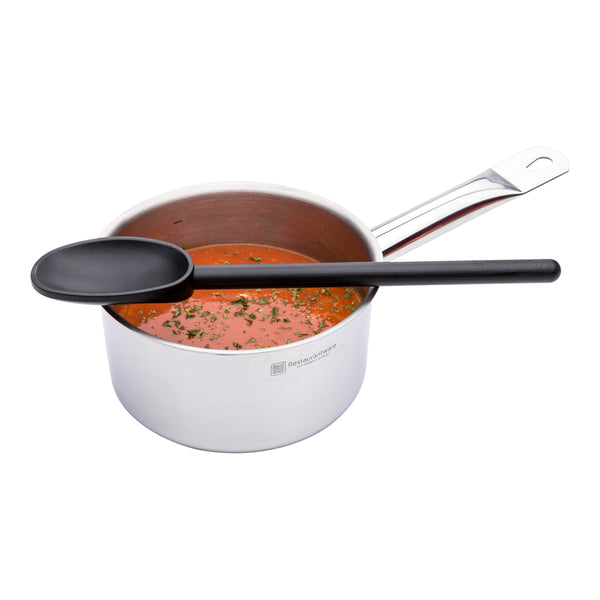 - Wide scoop stirs through creamy sauces and thick soups easily