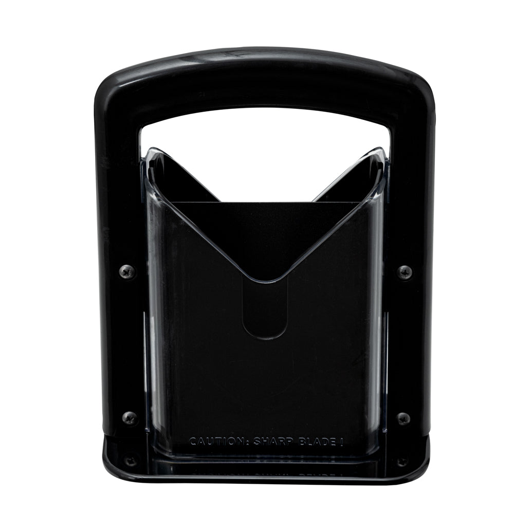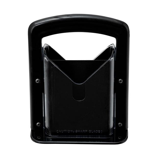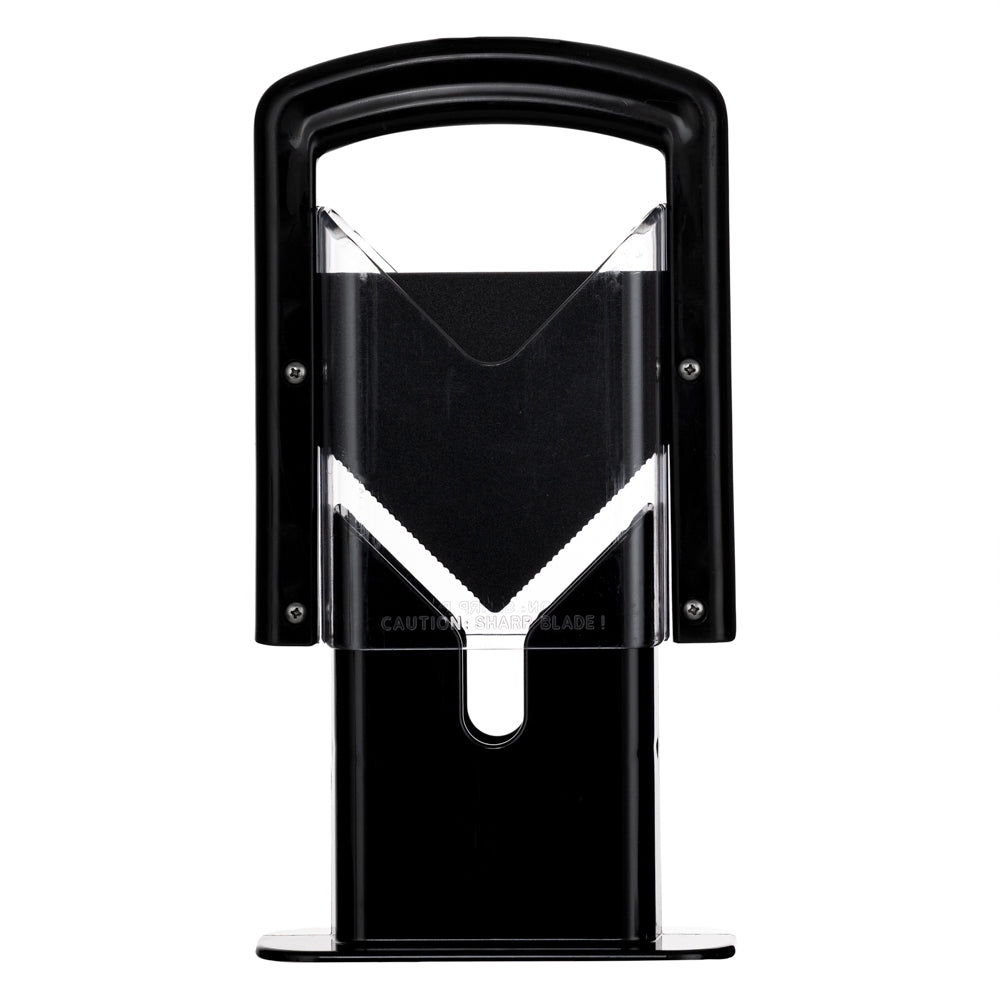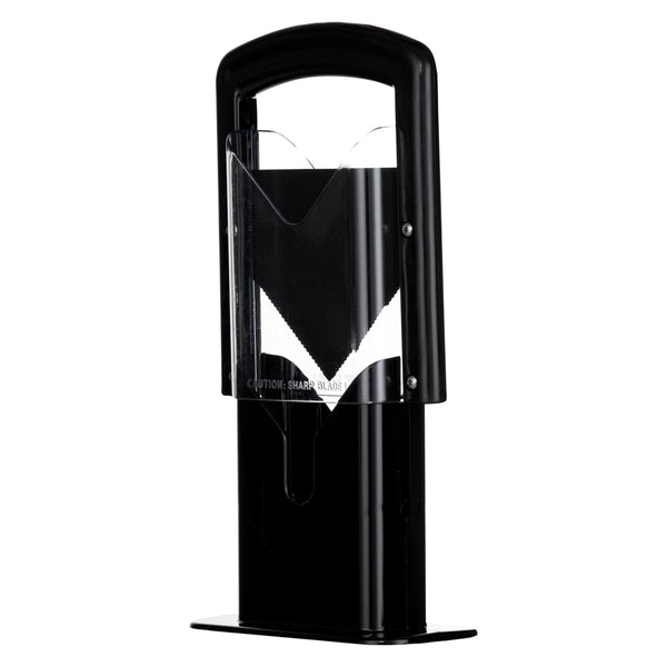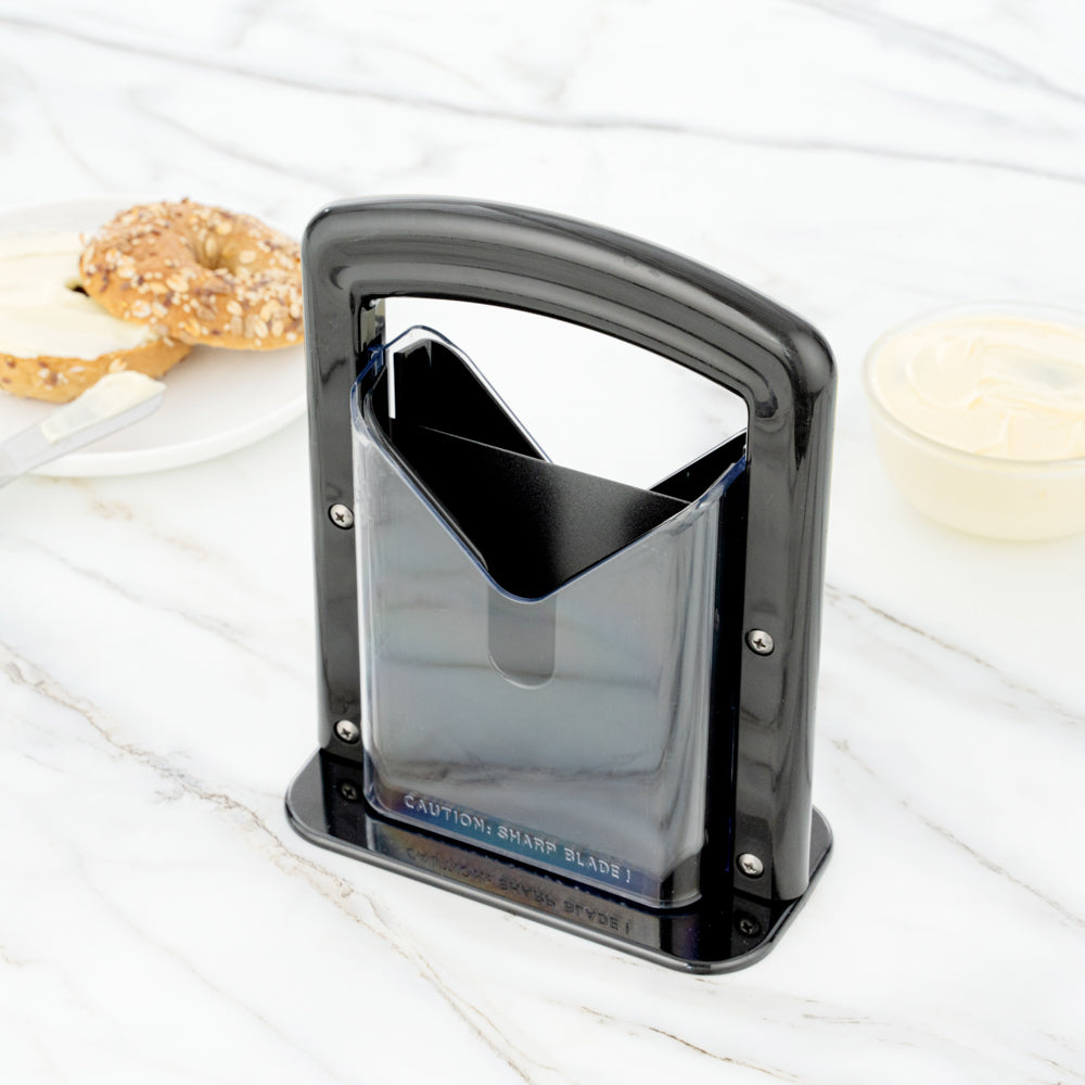 Streamline your bagel slicing process with our Mat Lux Black Stainless Steel Commercial Bagel Slicer. Featuring two components, this bagel guillotine has a base component that contains the bagel and serves as a base, and a top component for cutting the bagel. To easily use this guillotine slicer, simply insert the bagel in the base compartment, align the top component over the base, and push down the blade. The stainless steel blade of this bagel cutter is non-stick and serrated to effortlessly slice through any type of bagel. Equipped with a clear, protective shield, this bagel guillotine keeps hands safe from the sharp blade to prevent harmful cuts. With an ergonomic handle, this bagel slicer allows you to to comfortably push down the blade in a single motion. The compact design of this commercial bagel slicer takes up minimal space on your kitchen counters. This bagel cutter measures 7 inches long by 3.5 inches wide by 9 inches tall while the bagel compartment can fit bagels that are up to 5 inches in diameter. Sold in a 1 count box.
