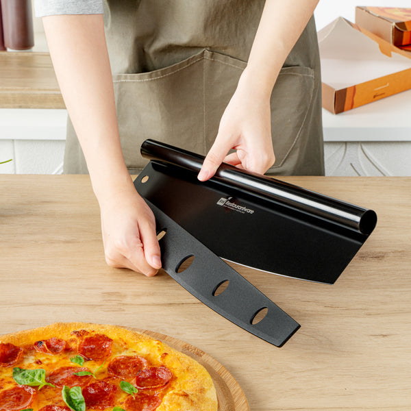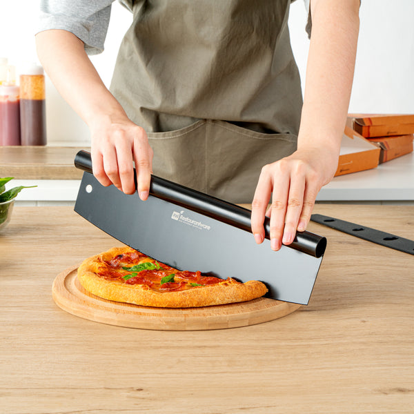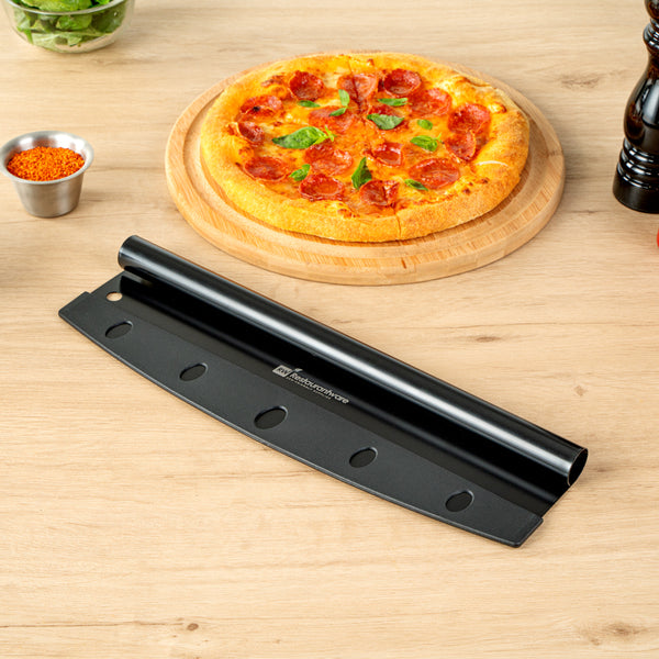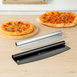 These pizza rocker knives are designed to use a rocking motion to achieve even slices. They cut across the whole length of your pizza or pie in one motion!