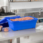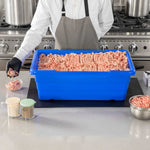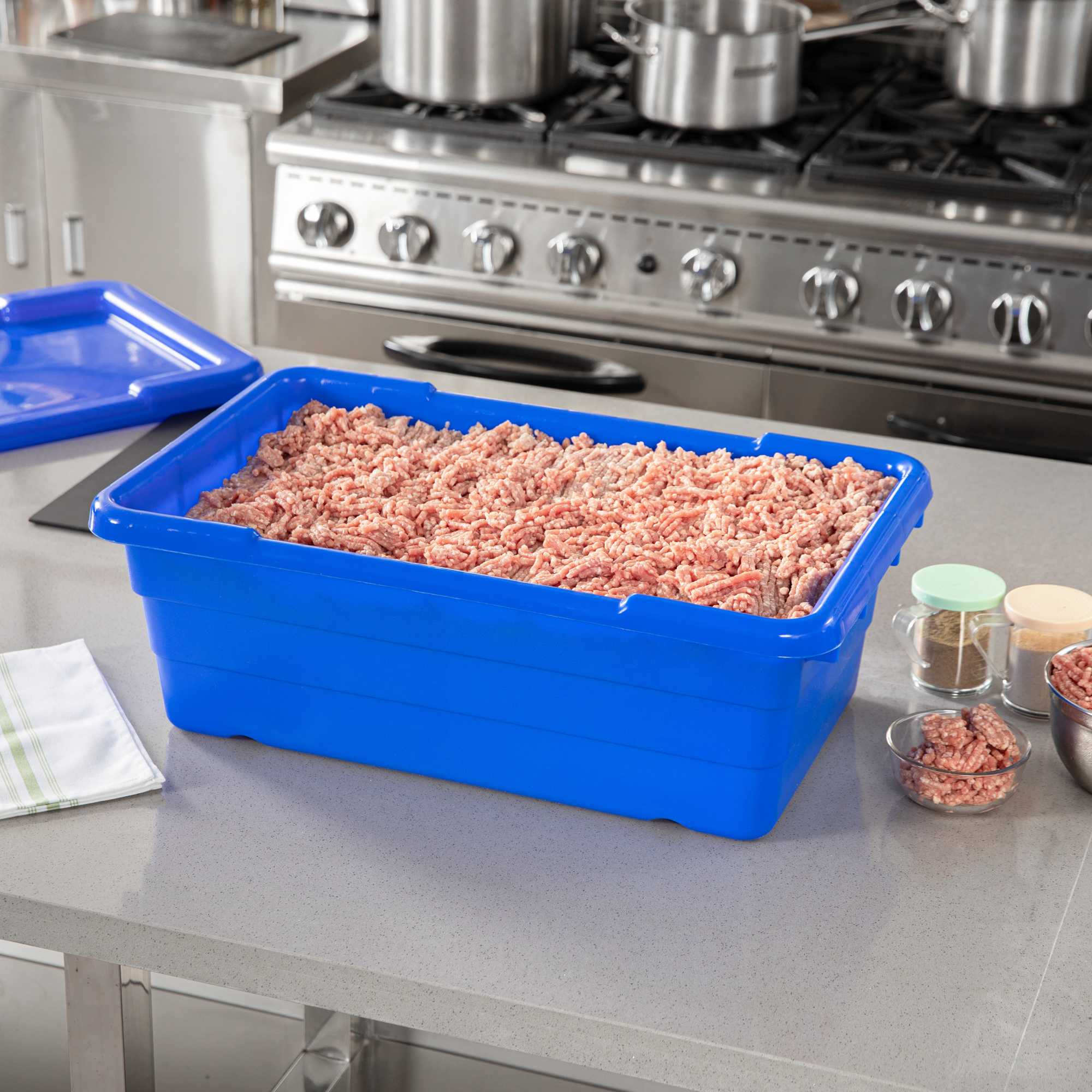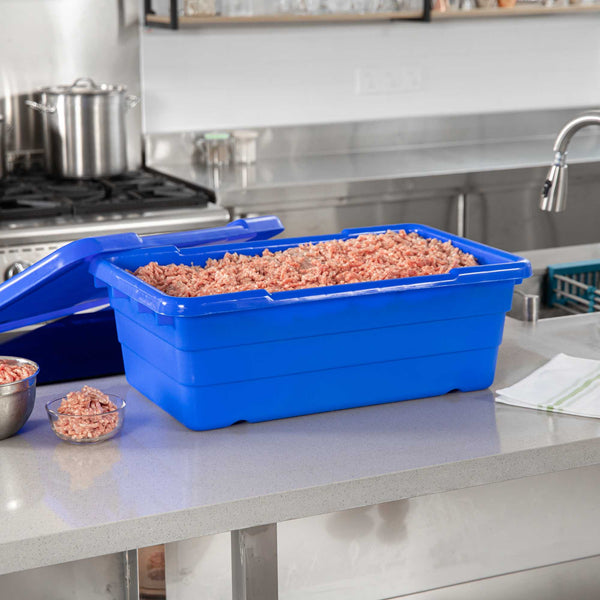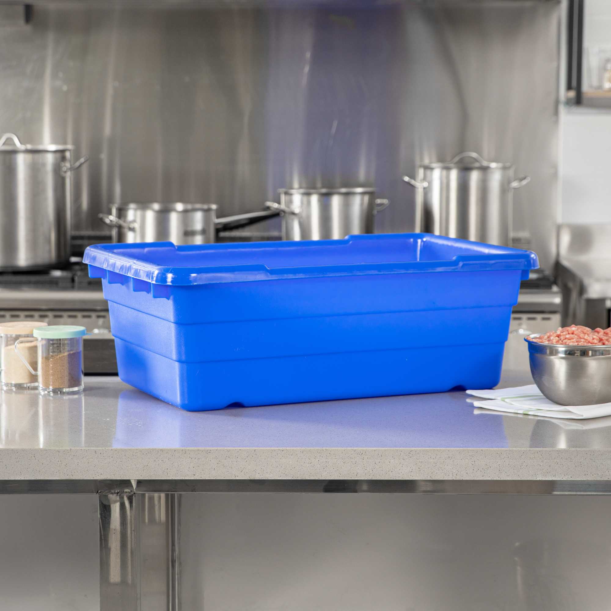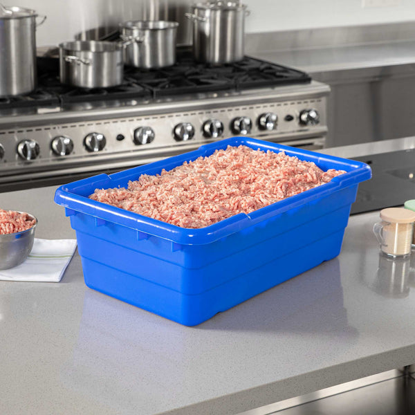 Optimize your kitchen operations with space-saving storage solutions. The Met Lux Stackable Plastic Meat Lug boasts a stackable design that maximizes storage in limited spaces, making it a perfect fit for bustling kitchens. This versatile meat lug is constructed from blue plastic, featuring a dishwasher-safe finish that ensures quick and easy cleaning, a must-have feature for maintaining hygiene standards. Its freezer-safe construction preserves meats for longer periods, reducing food waste and enhancing inventory management. As a reliable food transport tote, it incorporates a smooth interior surface with a wide corner radius, facilitating fast, hassle-free cleanup. The ability to integrate into a color-coded system helps reduce the risk of cross-contamination, promoting safer food handling practices. Ideal for cross stacking or nesting with similar-sized tote boxes, this plastic tote box is designed for efficient use in any professional kitchen. Each order includes 1 Met Lux Stackable 24.8 inches by 15.7 inchesby 8.7 inches Meat Lug.
