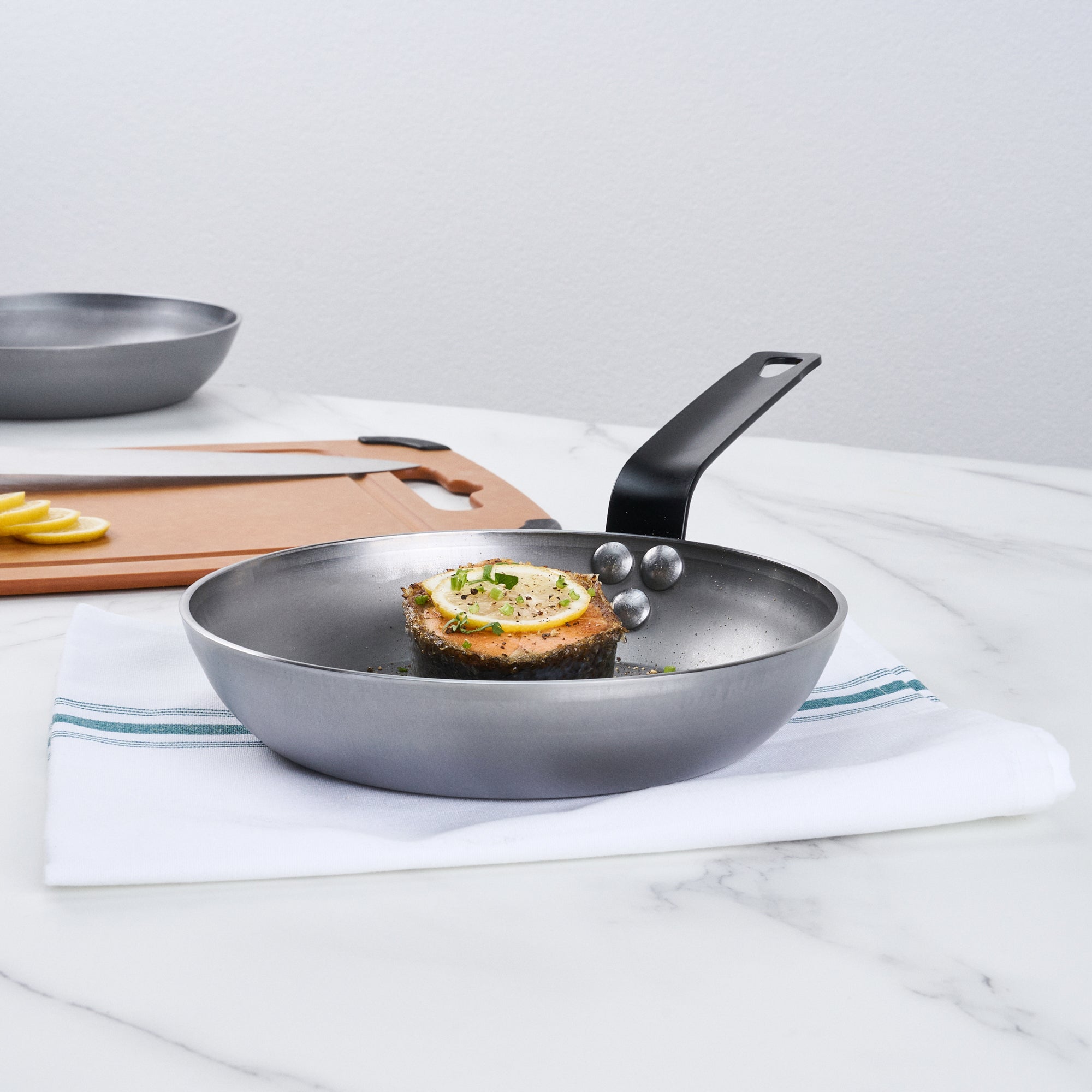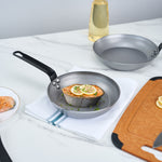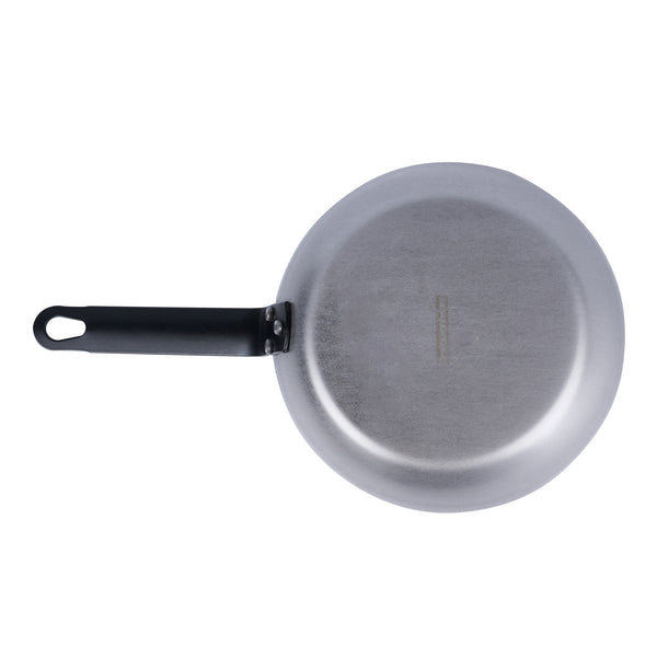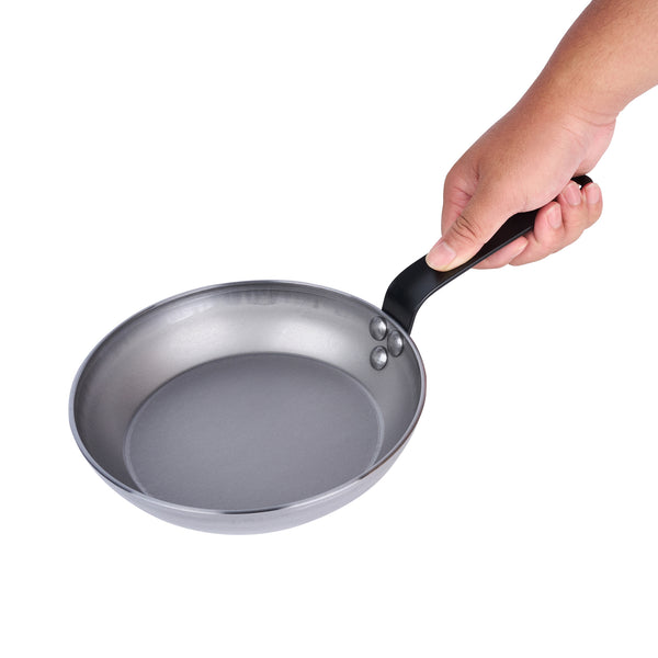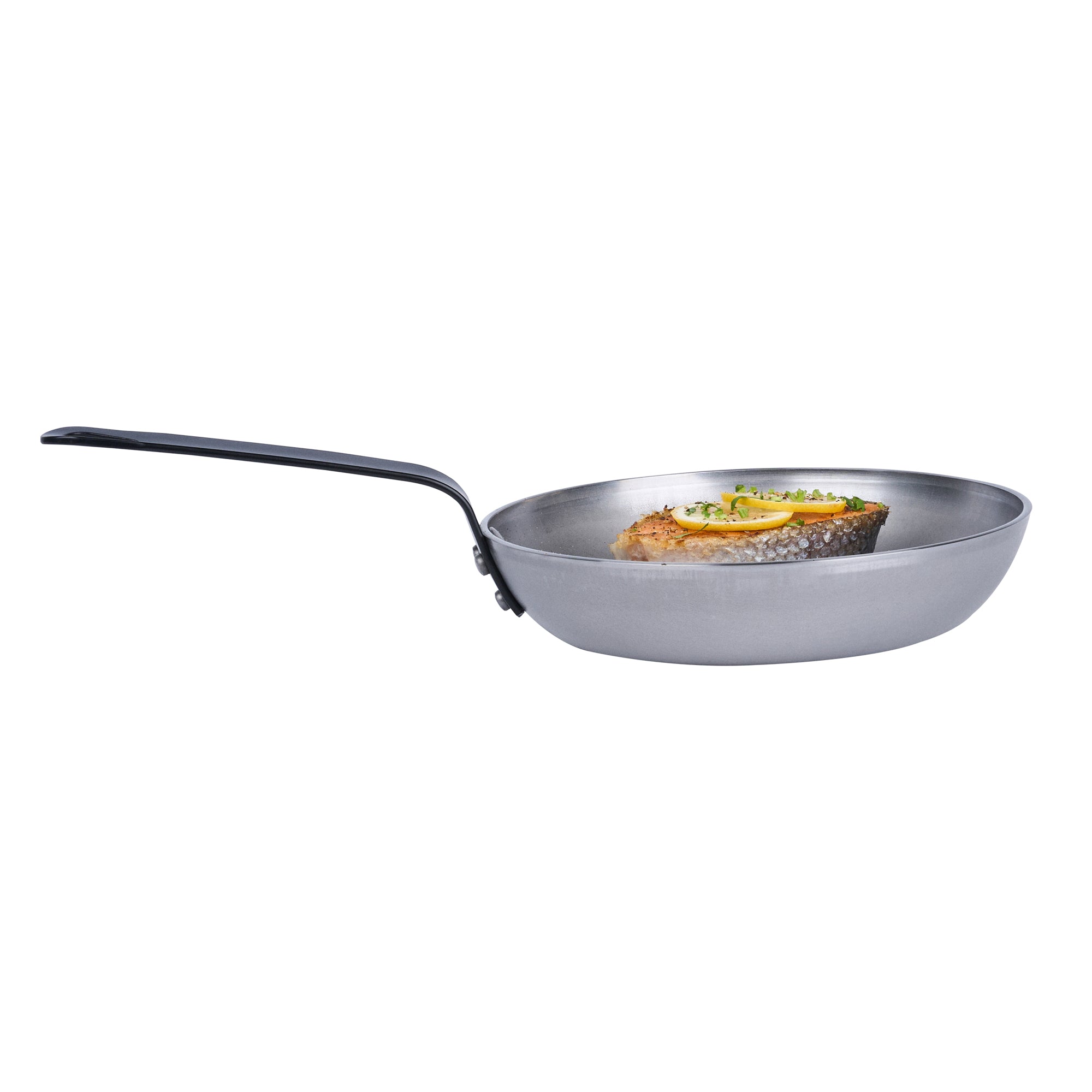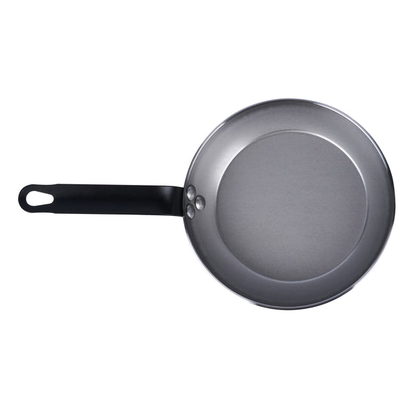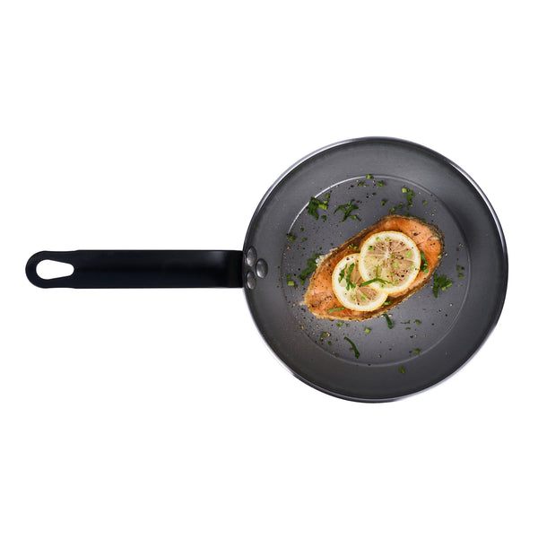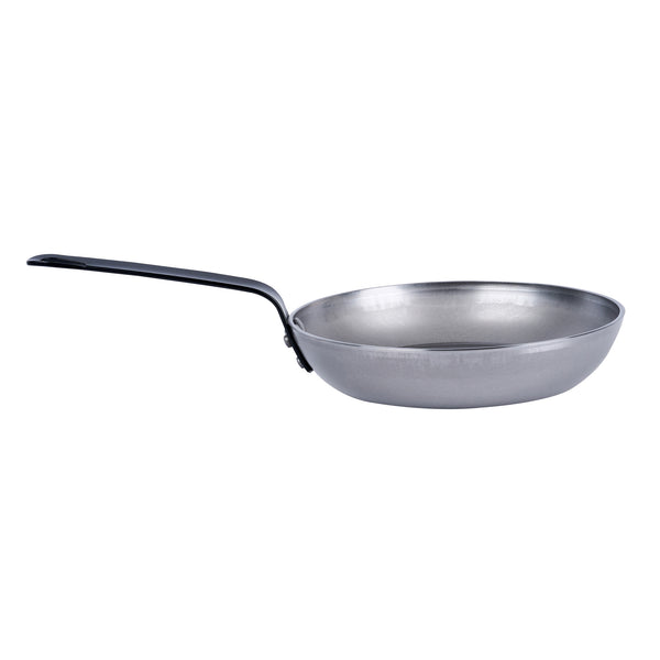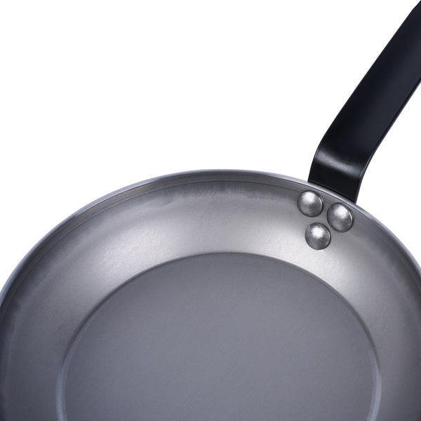 Enhance your kitchen efficiency with the versatile Met Lux Induction-Compatible Carbon Steel Frying Pan. This carbon steel frying pan, constructed from 3 millimeter thick carbon steel, ensures robust durability in even the most demanding culinary settings. The pre-seasoned surface provides a natural non-stick layer, transforming it into a non-stick fry pan that reduces the need for additional oils and promotes healthier cooking. Its triple-riveted handle offers a secure grip and added durability, making it an ideal oven safe fry pan for professional chefs. With an induction-safe design, this fry pan supports diverse cooking methods across various heat sources, including induction cooktops. Its lightweight construction allows for easy maneuverability, reducing strain during prolonged use, and the ergonomic handle enhances control and safety in busy kitchens. Each order includes 1 Met Lux Induction-Compatible Carbon Steel Frying Pan.