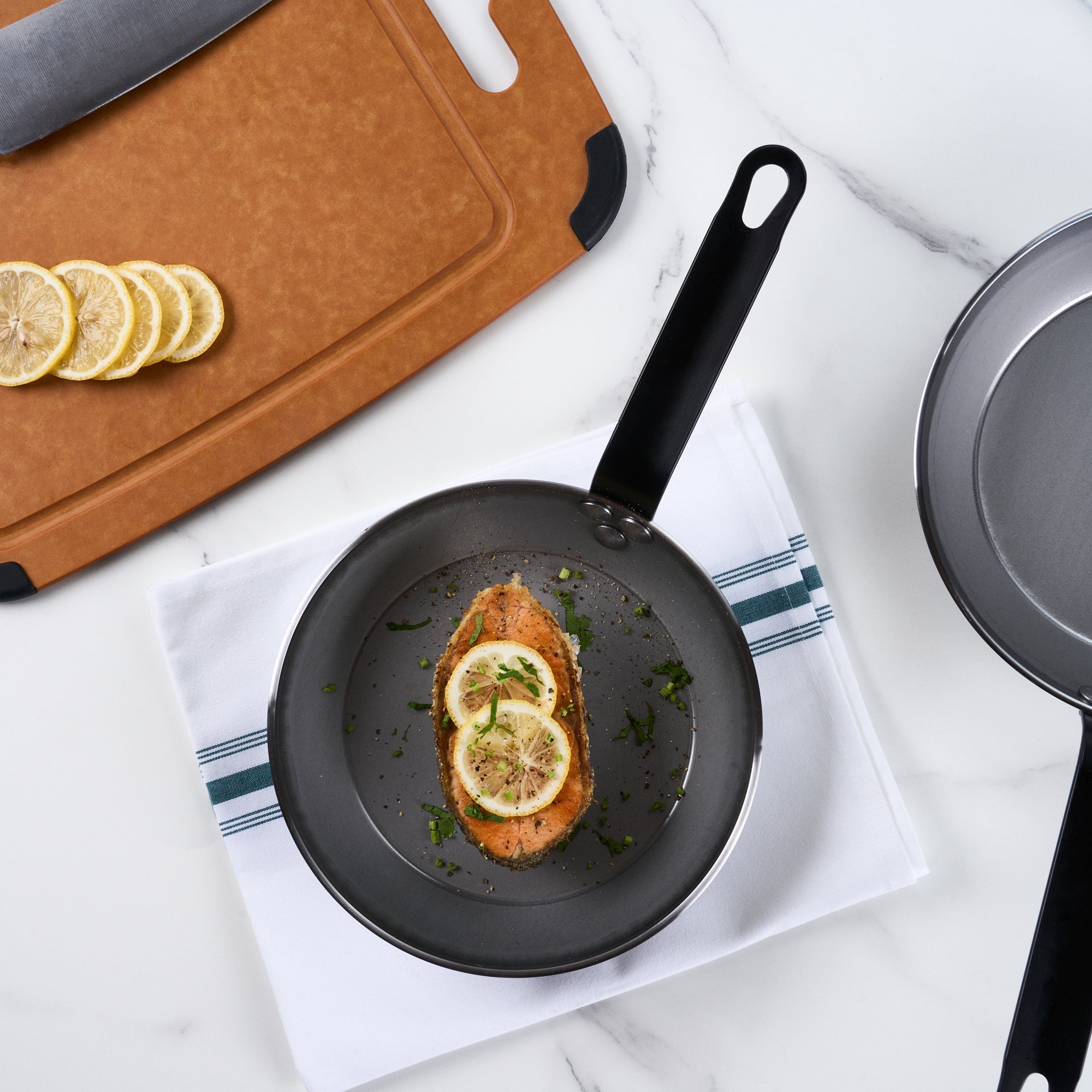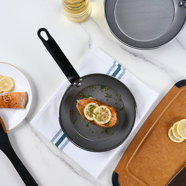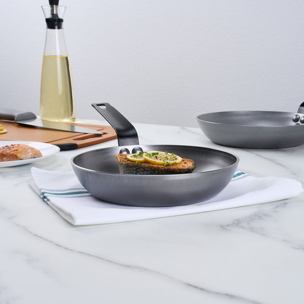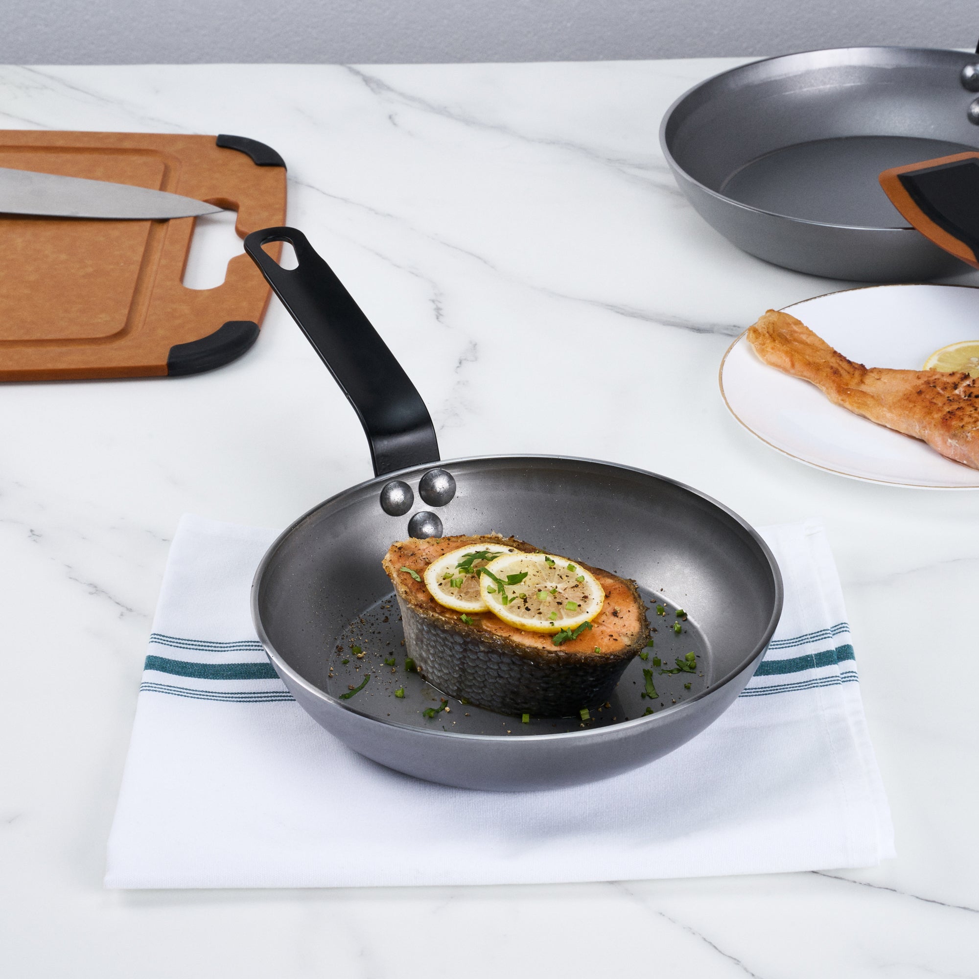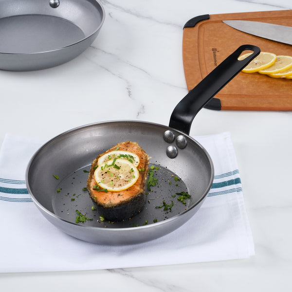 Enhance your kitchen efficiency with the versatile Met Lux Induction-Compatible Carbon Steel Frying Pan. This carbon steel frying pan, constructed from 3 millimeter thick carbon steel, ensures robust durability in even the most demanding culinary settings. The pre-seasoned surface provides a natural non-stick layer, transforming it into a non-stick fry pan that reduces the need for additional oils and promotes healthier cooking. Its triple-riveted handle offers a secure grip and added durability, making it an ideal oven safe fry pan for professional chefs. With an induction-safe design, this fry pan supports diverse cooking methods across various heat sources, including induction cooktops. Its lightweight construction allows for easy maneuverability, reducing strain during prolonged use, and the ergonomic handle enhances control and safety in busy kitchens. Each order includes 1 Met Lux Induction-Compatible Carbon Steel Frying Pan.