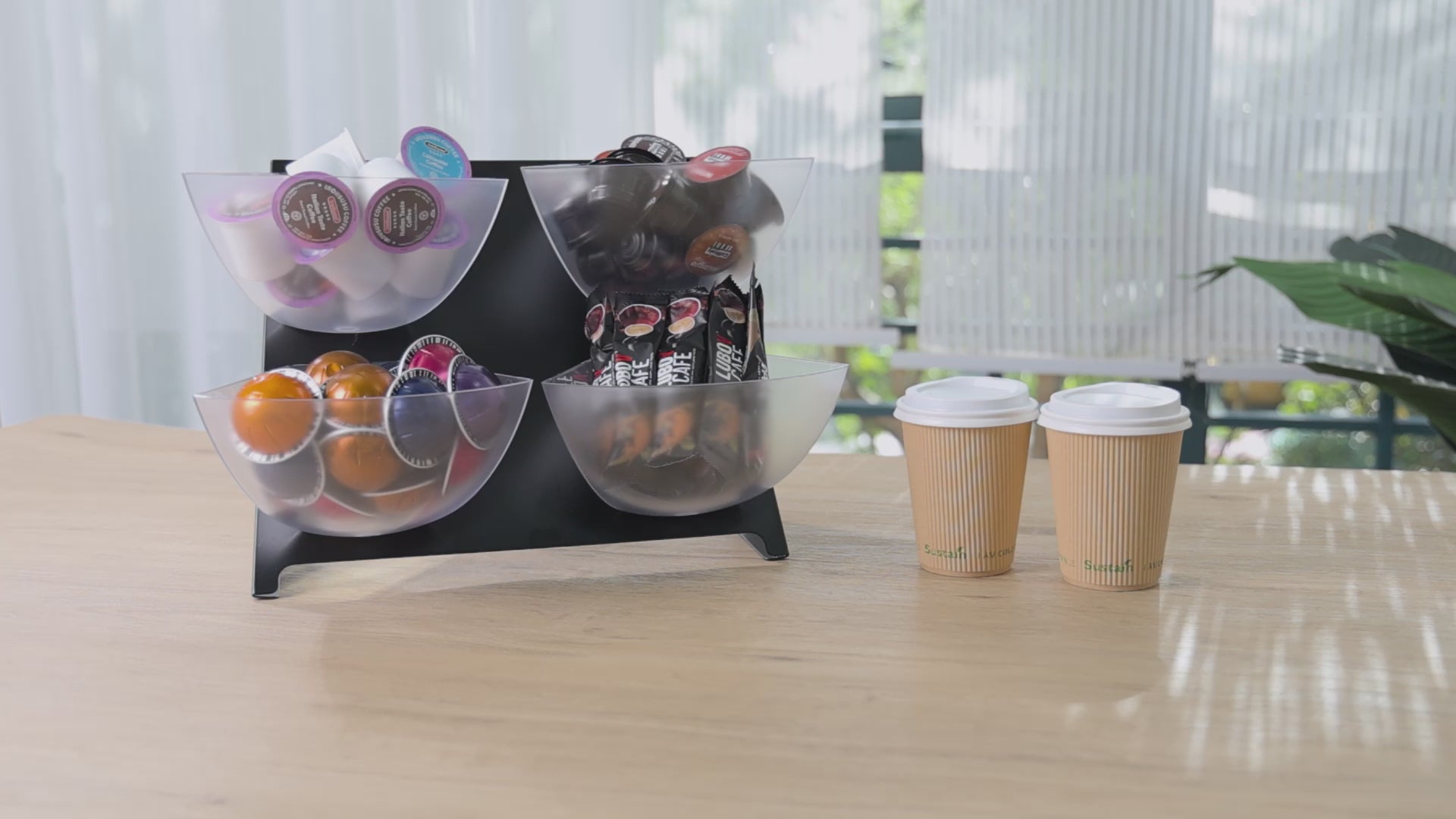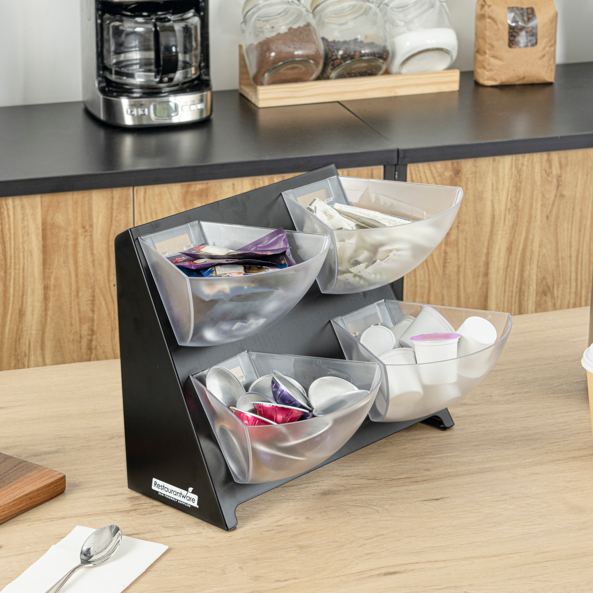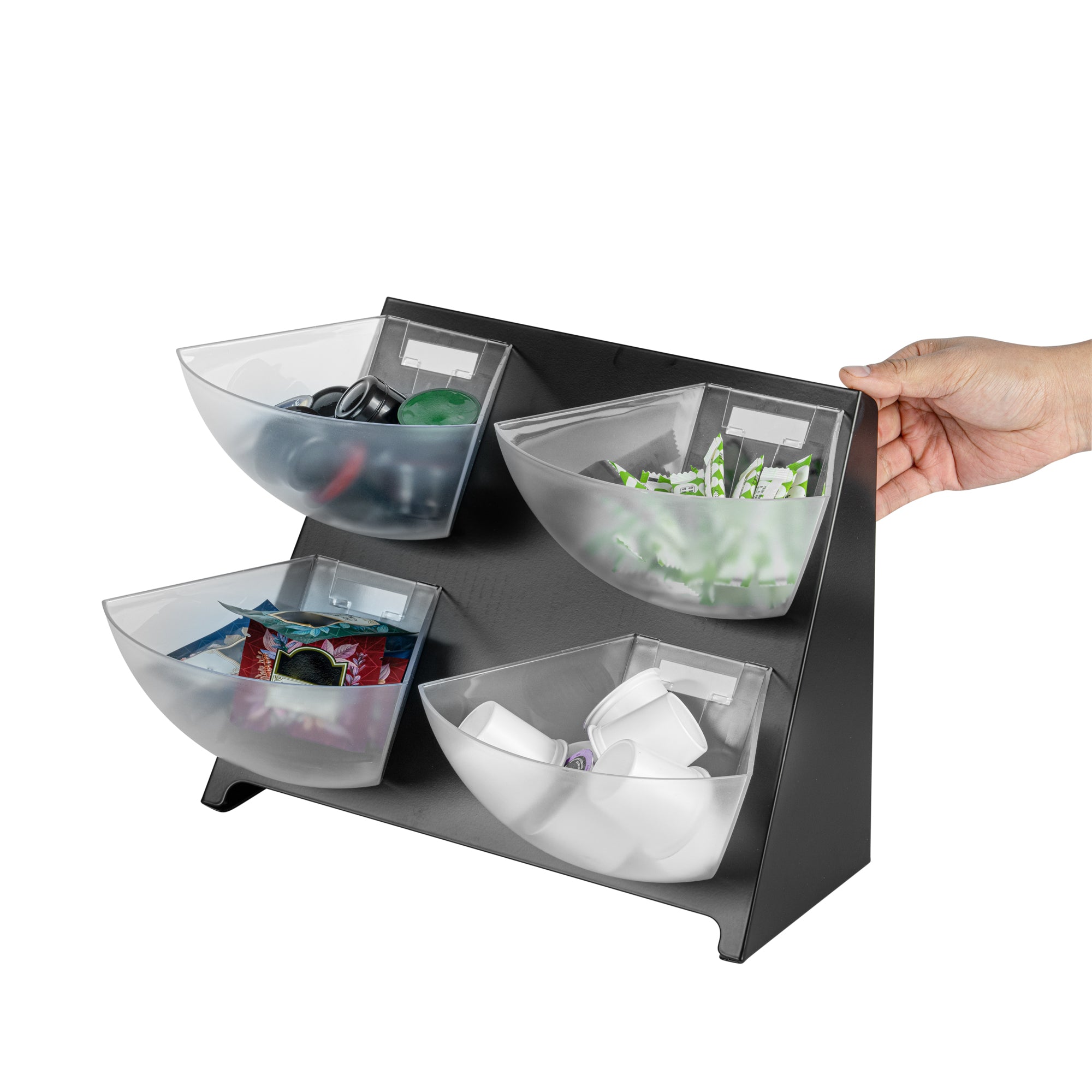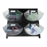 - 4 removable clear bins are provide easy access for refills and cleanups