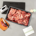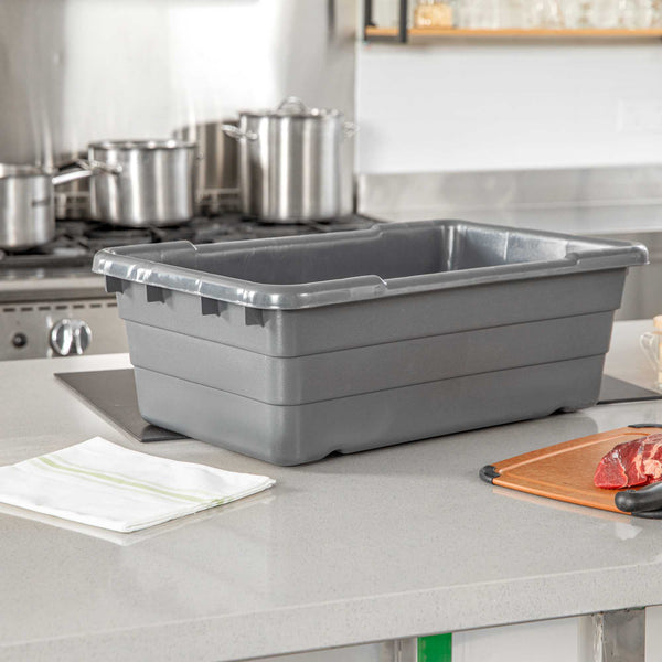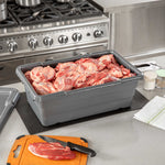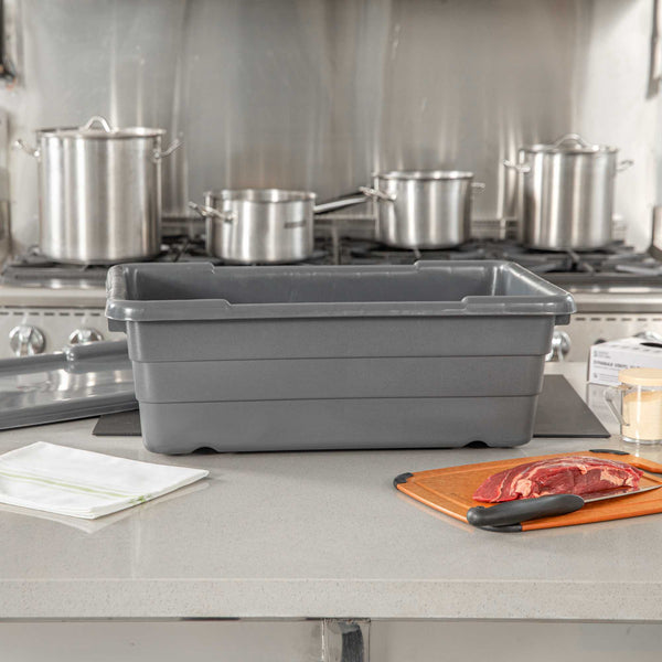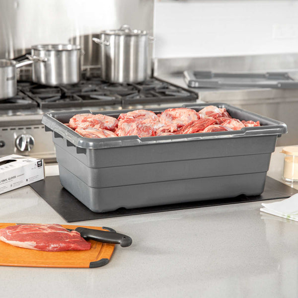 Optimize your storage with stackable containers designed for efficiency. The Met Lux Stackable Meat Tote Box is expertly crafted from durable plastic, providing a reliable solution for storing and transporting a variety of foodservice products. With its stackable design, this meat tote box maximizes storage space efficiency, ensuring that your kitchen remains organized. The dark gray color allows it to be easily integrated into a color-coded system, reducing the risk of cross-contamination. Measuring 24.8 inches in length, this food-grade tote features a smooth interior surface and wide corner radius, allowing for quick and easy cleanup. Its freezer-safe capability offers convenient meat storage at any temperature, while the dishwasher-safe property ensures effortless maintenance. Enhance your foodservice operations with this versatile stackable meat lug that also supports cross-stacking and nesting with similar-sized tote boxes. Each order includes 1 Met Lux Stackable Meat Tote Box.