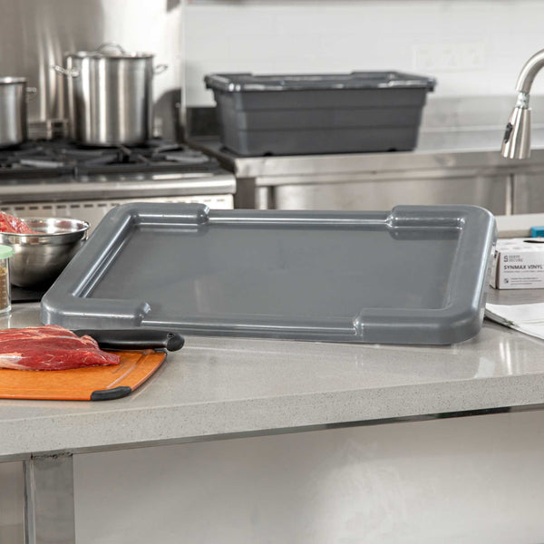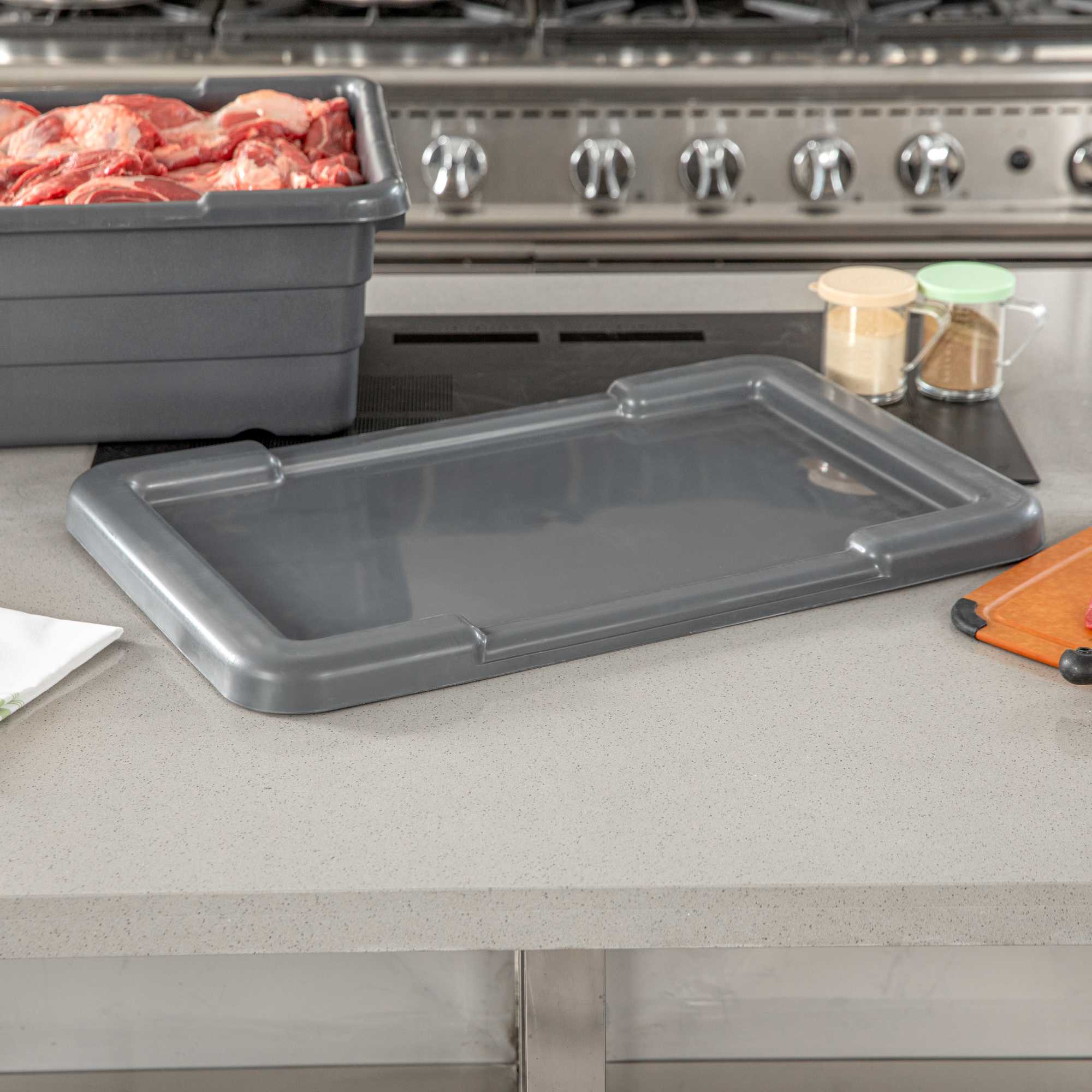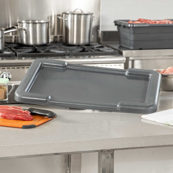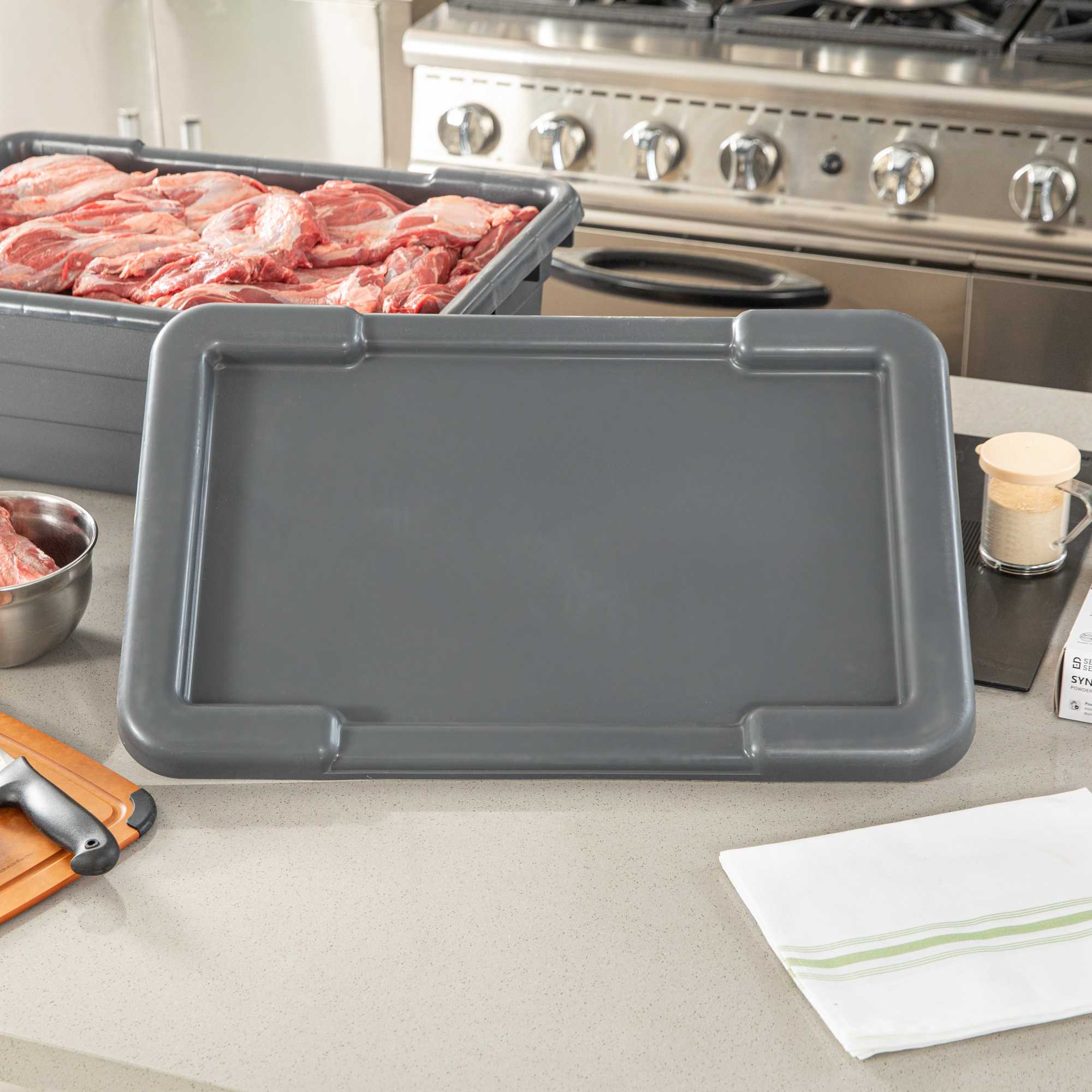 Ensure superior protection with the Met Lux Dark Gray Stackable Meat Lug Lid. This plastic lid for meat lug features a recessed design with a raised rim, ensuring secure stacking and maximizing your storage space efficiently. Its dishwasher-safe construction simplifies cleaning processes, saving valuable time in busy kitchens and making it an ideal food storage lid. With dimensions of 15.9 inches in width, it effectively prevents the spread of germs and bacteria while keeping unpleasant odors contained, crucial for maintaining high foodservice standards. Elevate your kitchen's efficiency and hygiene with this essential meat lug lid. Each order includes 1 Met Lux Dark Gray Stackable Meat Lug Lid.