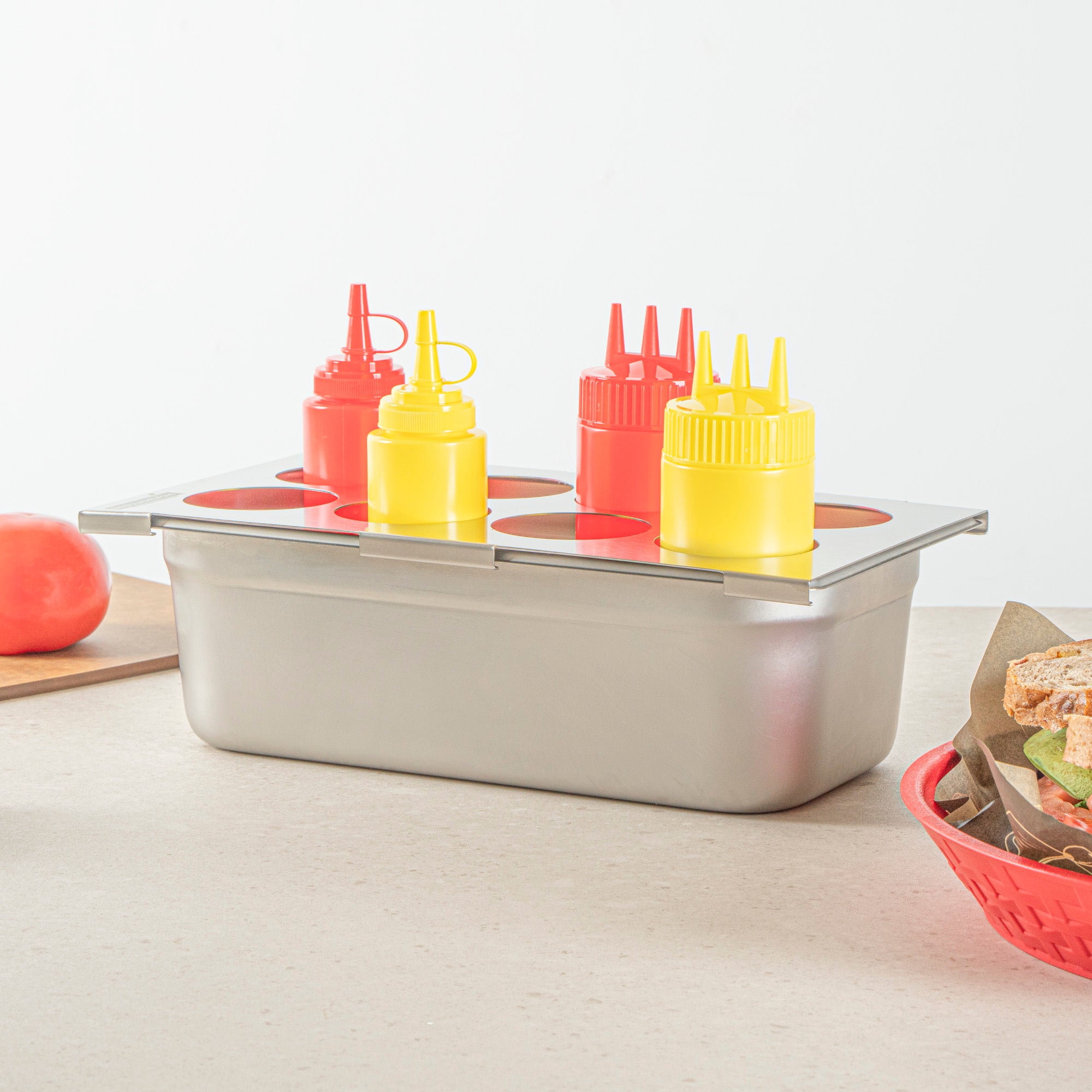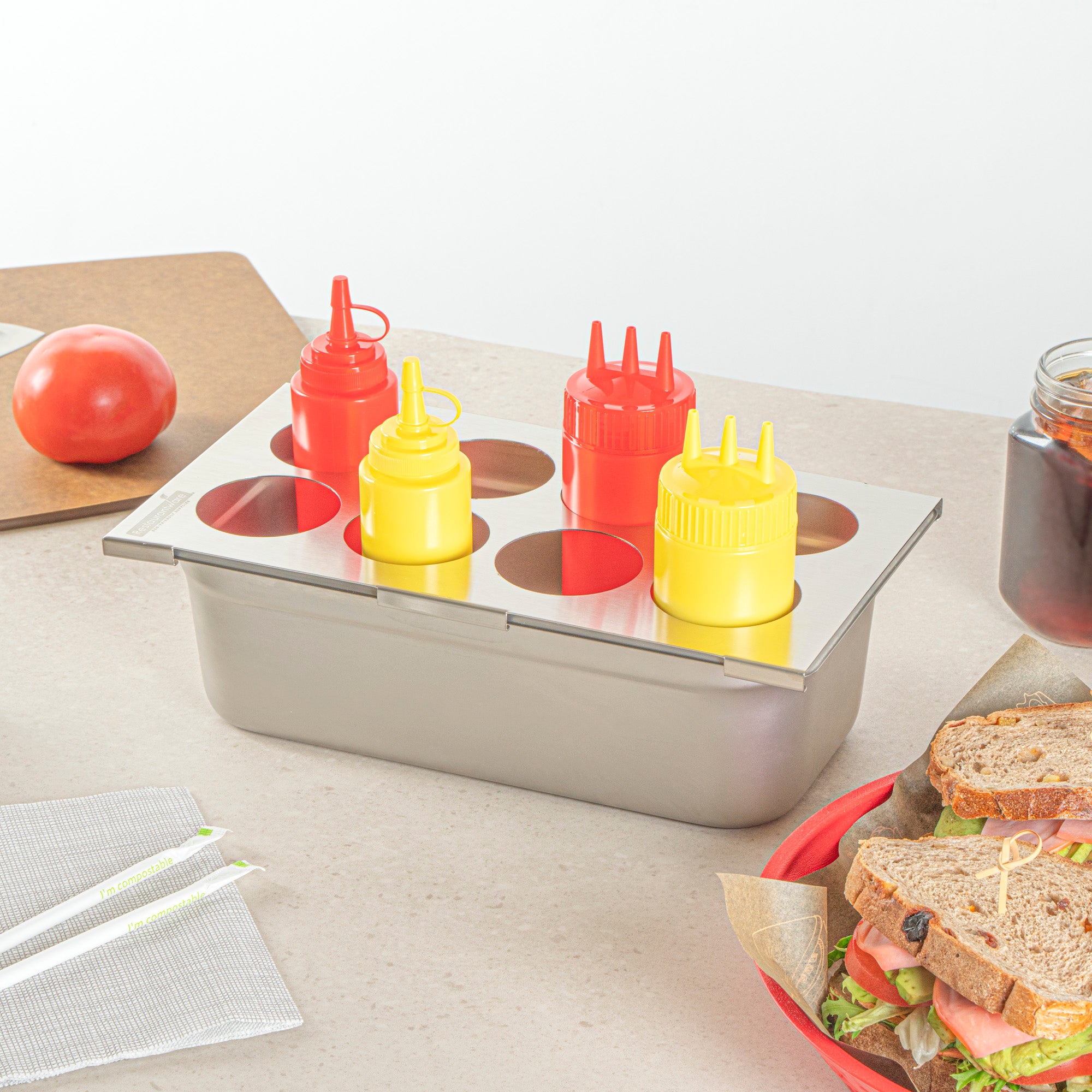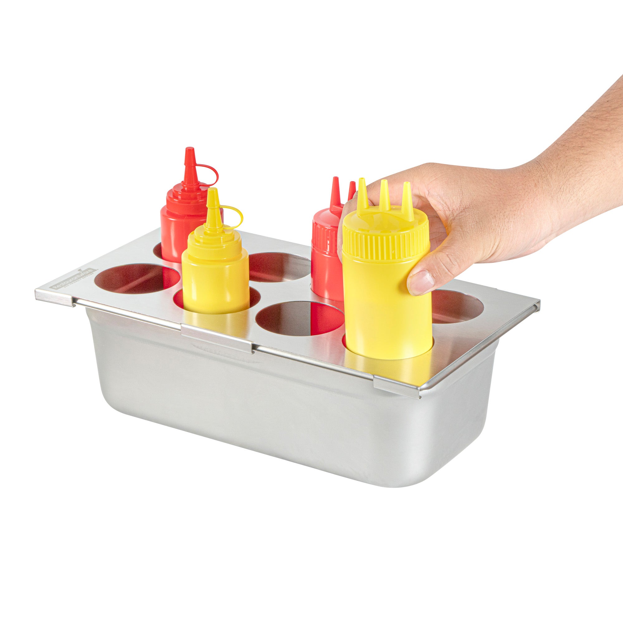 Effortlessly streamline your condiment organization with the Met Lux Stainless Steel Squeeze Bottle Holder Top. This squeeze bottle holder is constructed from durable stainless steel, ensuring long-lasting use and resistance to corrosion in busy kitchen environments. Its compact dimensions of 12.75 inches by 7 inches allow for efficient use of counter space while accommodating up to eight squeeze bottles, making it the perfect condiment bottle organizer for fast-paced foodservice settings. Designed to fit 1/3 size pans, this stainless steel condiment holder seamlessly integrates into existing kitchen setups, enhancing workflow and accessibility. The dishwasher-friendly design of this holder simplifies clean-up, ensuring quick sanitation and compliance with health standards. Its eight-hole configuration easily fits sauces, oils, and more, providing organized storage for efficient meal preparation. Sold in a 1 count box.