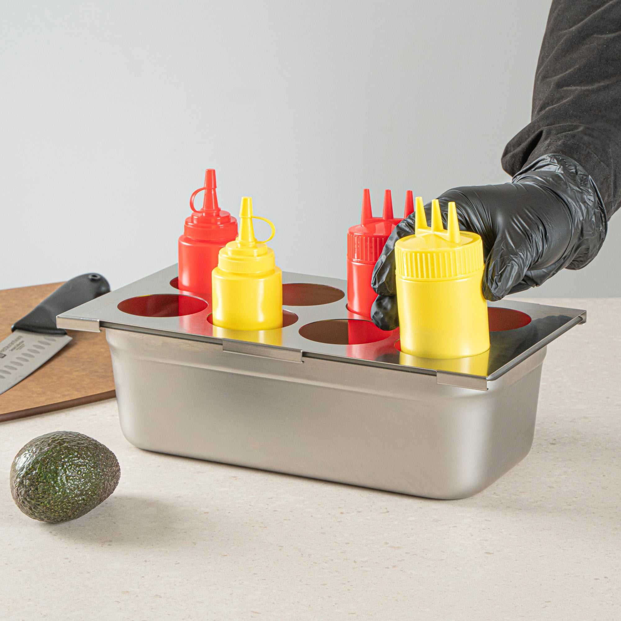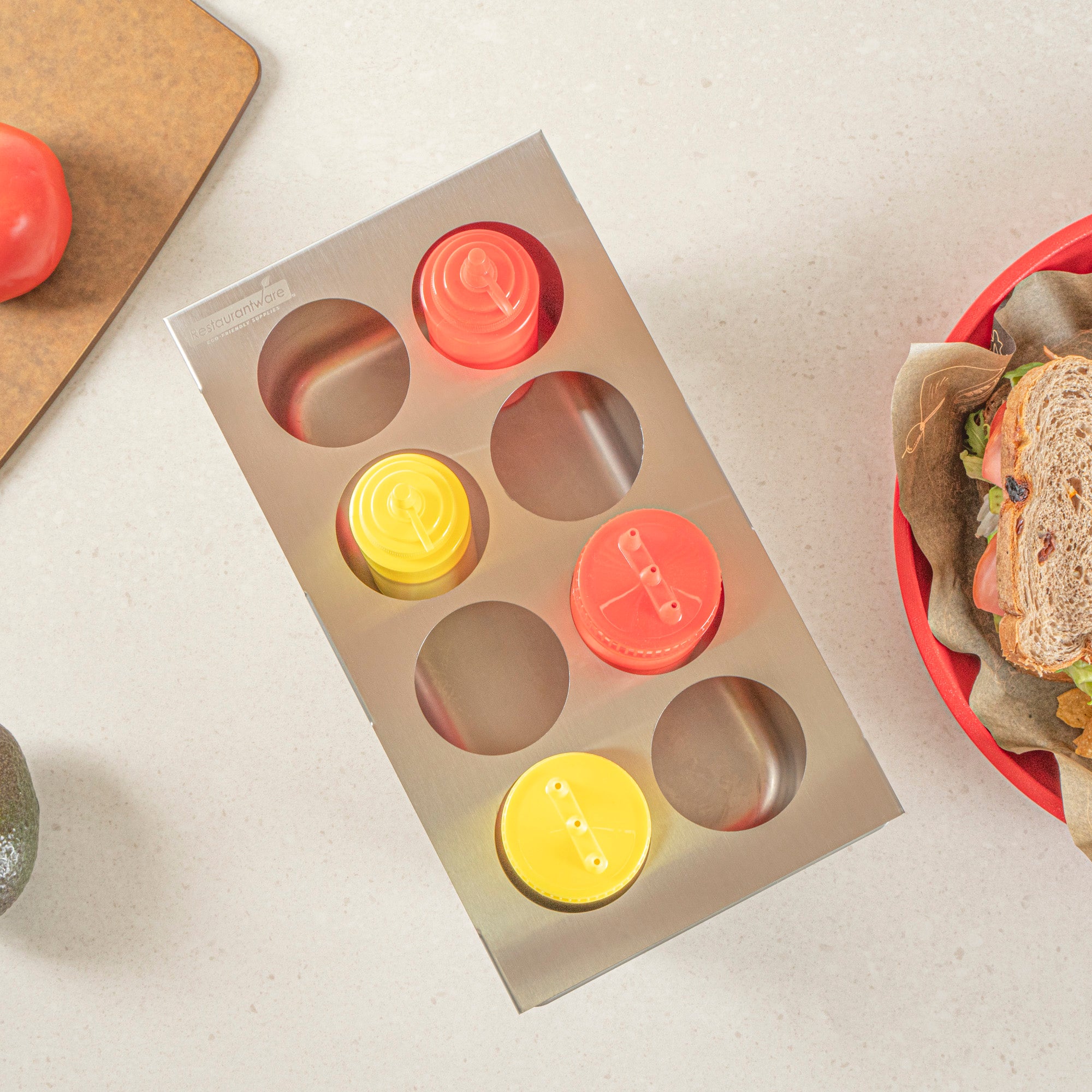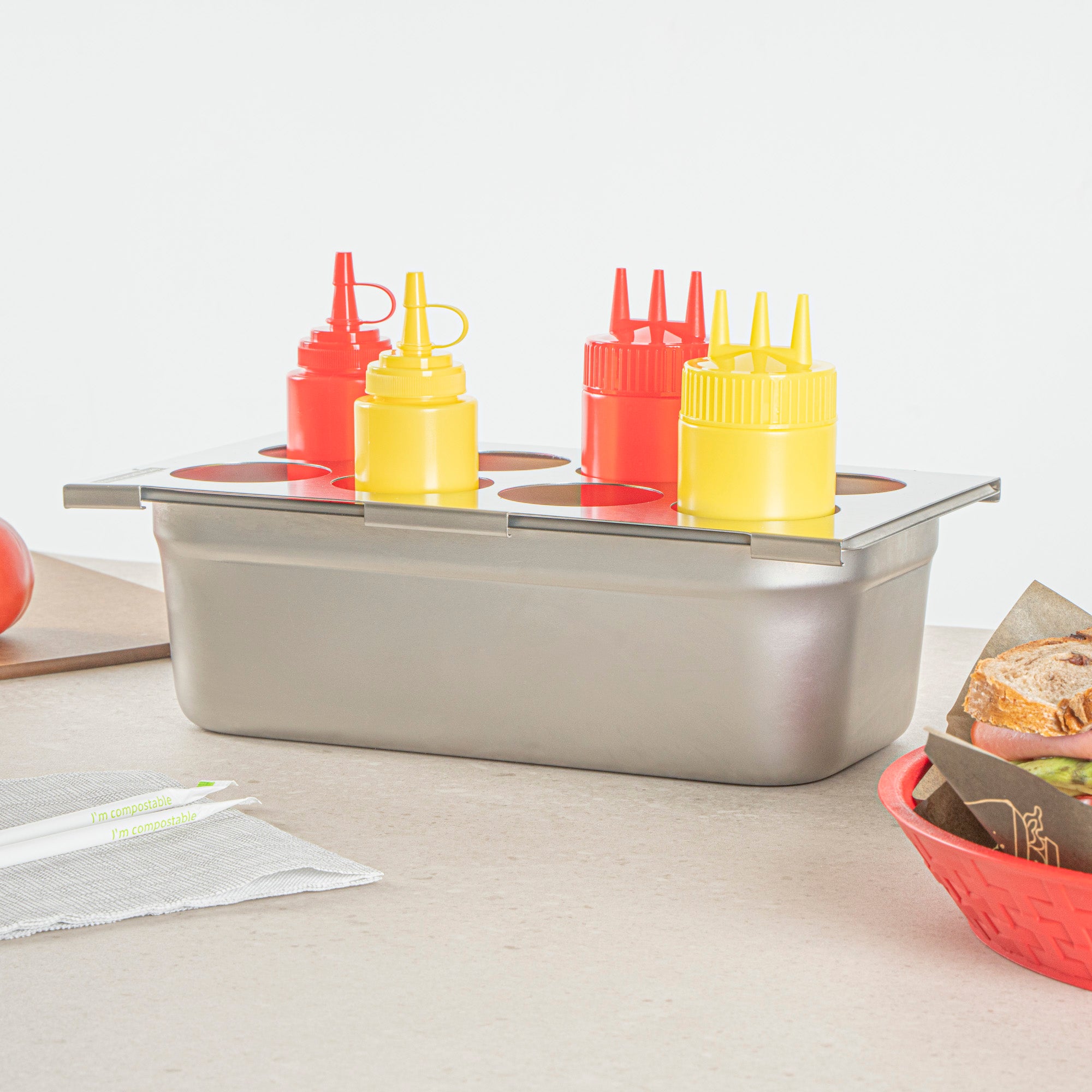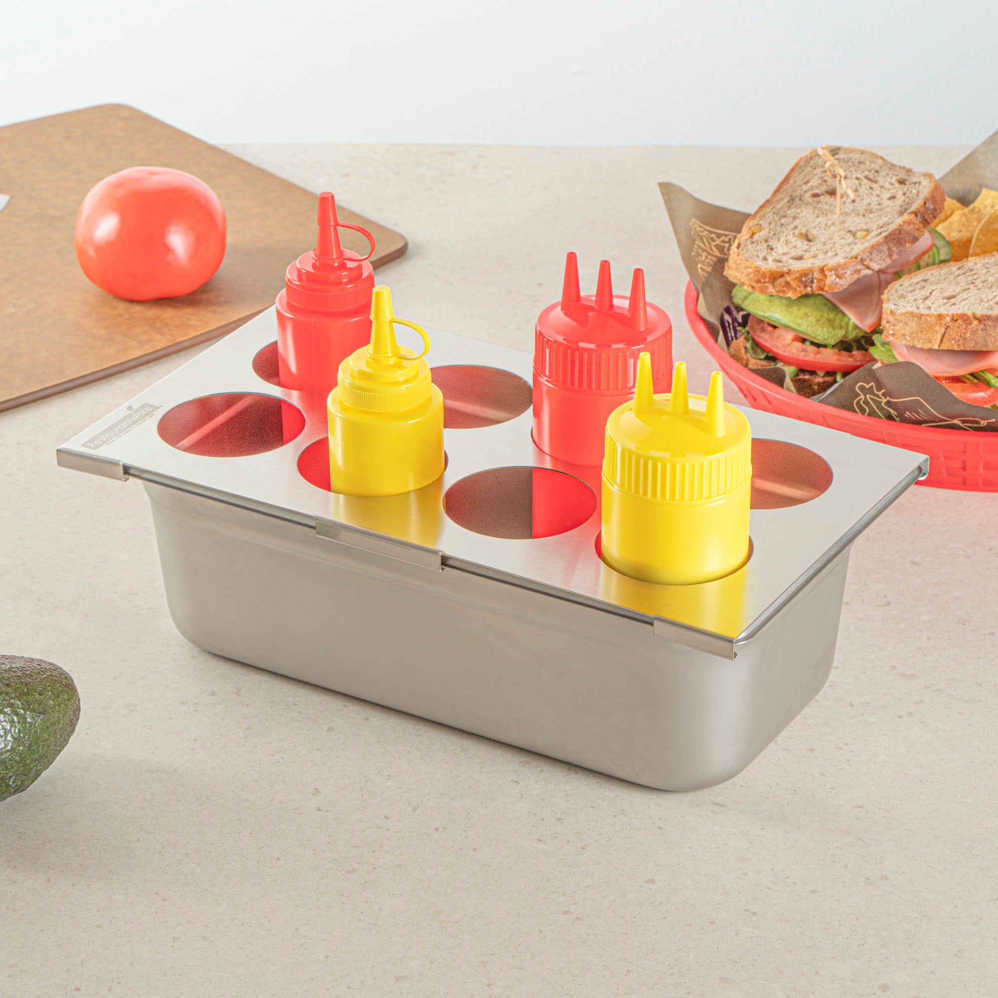Effortlessly streamline your condiment organization with the Met Lux Stainless Steel Squeeze Bottle Holder Top. This squeeze bottle holder is constructed from durable stainless steel, ensuring long-lasting use and resistance to corrosion in busy kitchen environments. Its compact dimensions of 12.75 inches by 7 inches allow for efficient use of counter space while accommodating up to eight squeeze bottles, making it the perfect condiment bottle organizer for fast-paced foodservice settings. Designed to fit 1/3 size pans, this stainless steel condiment holder seamlessly integrates into existing kitchen setups, enhancing workflow and accessibility. The dishwasher-friendly design of this holder simplifies clean-up, ensuring quick sanitation and compliance with health standards. Its eight-hole configuration easily fits sauces, oils, and more, providing organized storage for efficient meal preparation. Sold in a 1 count box.