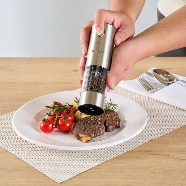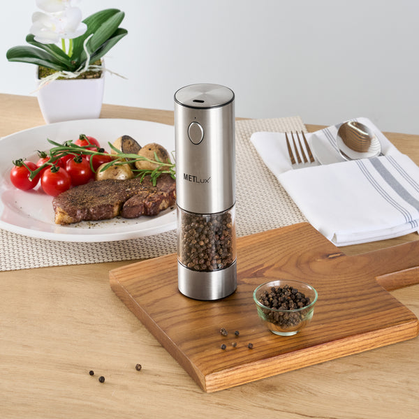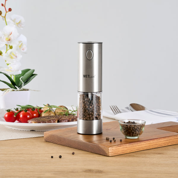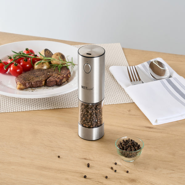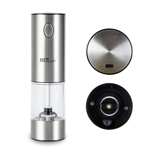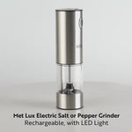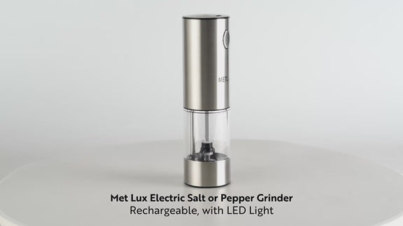 Enhance your seasoning precision with state-of-the-art tools. The Met Lux Electric Grinder features a rechargeable design that ensures uninterrupted grinding, making it an essential for busy kitchens. With its LED light, this rechargeable pepper grinder aids in precision, especially in low-light settings, ensuring your dishes are perfectly seasoned every time. Its ceramic core maintains sharpness over time, providing consistent seasoning results and positioning it as a reliable ceramic pepper grinder. Crafted from sleek silver stainless steel, this grinder measures 7.4 inches in height, offering a durable and stylish addition to your kitchen tools. Experience the convenience and efficiency of this electric grinder to elevate your culinary creations. Each order includes 1 Met Lux Electric Grinder.