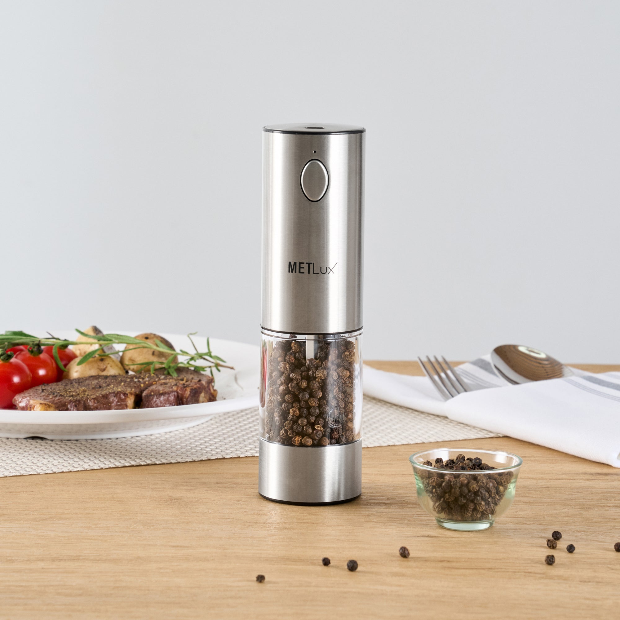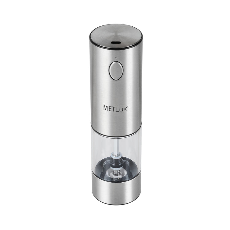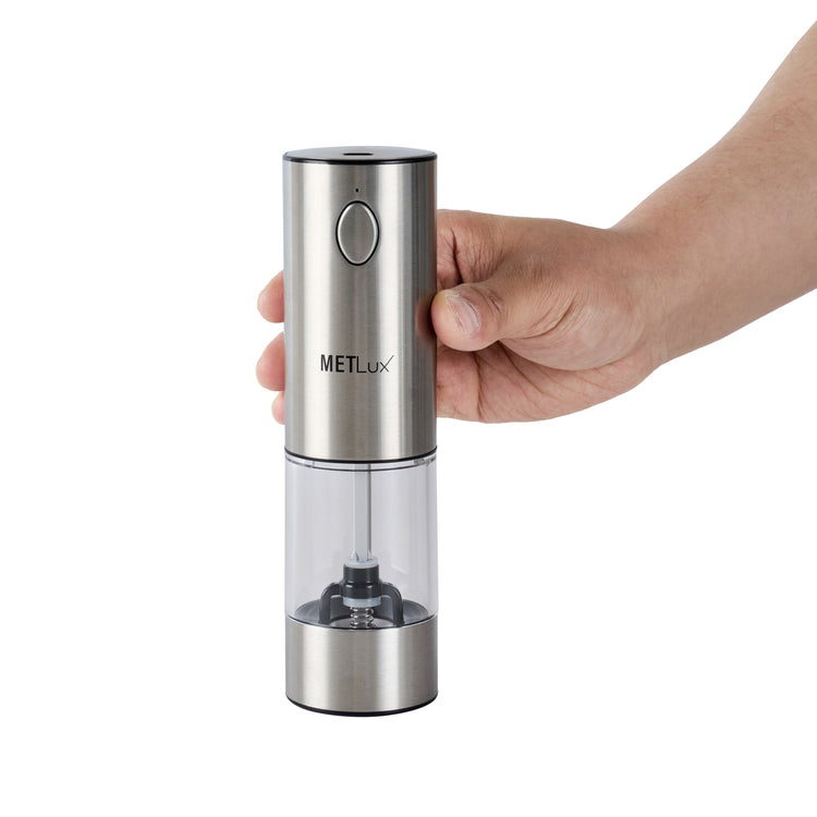 Enhance your seasoning precision with state-of-the-art tools. The Met Lux Electric Grinder features a rechargeable design that ensures uninterrupted grinding, making it an essential for busy kitchens. With its LED light, this rechargeable pepper grinder aids in precision, especially in low-light settings, ensuring your dishes are perfectly seasoned every time. Its ceramic core maintains sharpness over time, providing consistent seasoning results and positioning it as a reliable ceramic pepper grinder. Crafted from sleek silver stainless steel, this grinder measures 7.4 inches in height, offering a durable and stylish addition to your kitchen tools. Experience the convenience and efficiency of this electric grinder to elevate your culinary creations. Each order includes 1 Met Lux Electric Grinder.