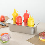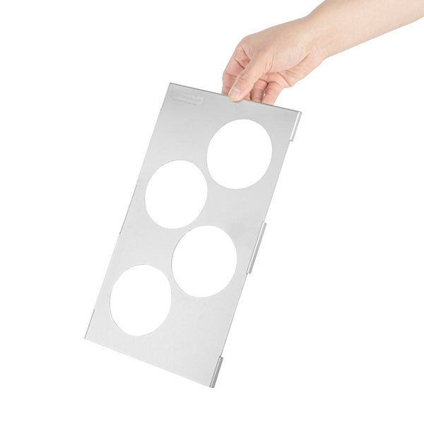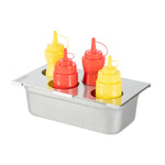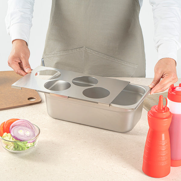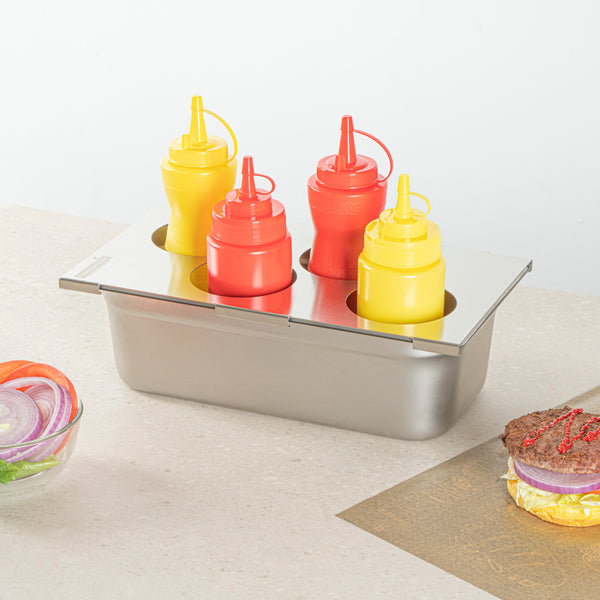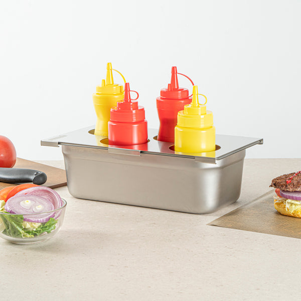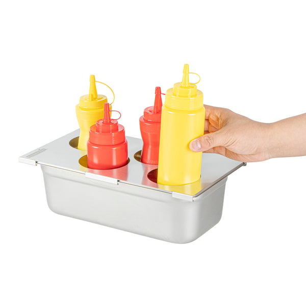 Efficiently organize your condiments with this versatile squeeze bottle organizer top. The Met Lux Stainless Steel Squeeze Bottle Organizer Top, measuring 12.75 inches by 7 inches, is crafted from durable stainless steel, ensuring long-lasting use and resistance to corrosion in busy kitchen environments. Its innovative four-hole design supports multiple condiment bottles, enhancing your kitchen's productivity by keeping sauces and dressings conveniently accessible. Designed to fit 1/3 size pans, this stainless steel bottle holder seamlessly integrates into standard foodservice setups, improving organization and efficiency. The kitchen condiment organizer features an open design that allows for easy access, facilitating quick identification and retrieval of condiments, which is essential for streamlining service. Its dishwasher-safe design simplifies sanitation processes, ensuring compliance with health standards and saving valuable time in the cleaning routine. Sold in a 1 count box.