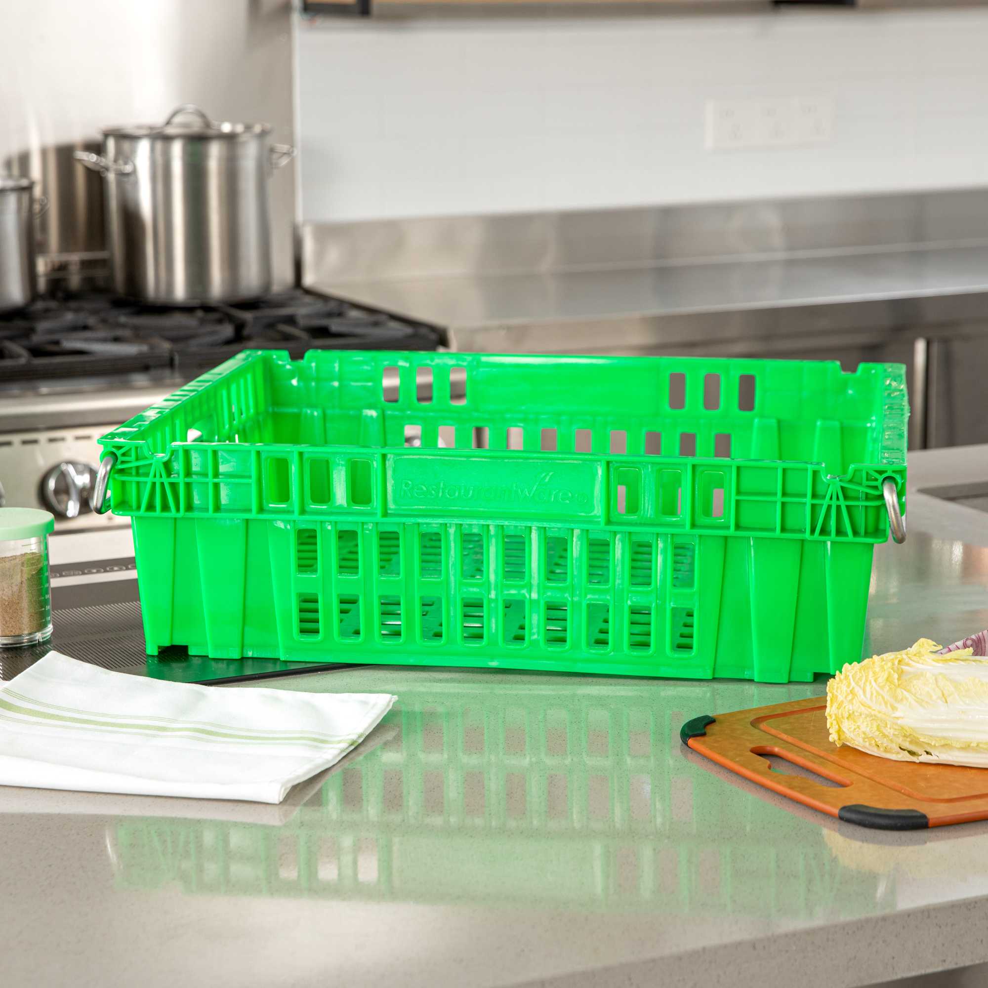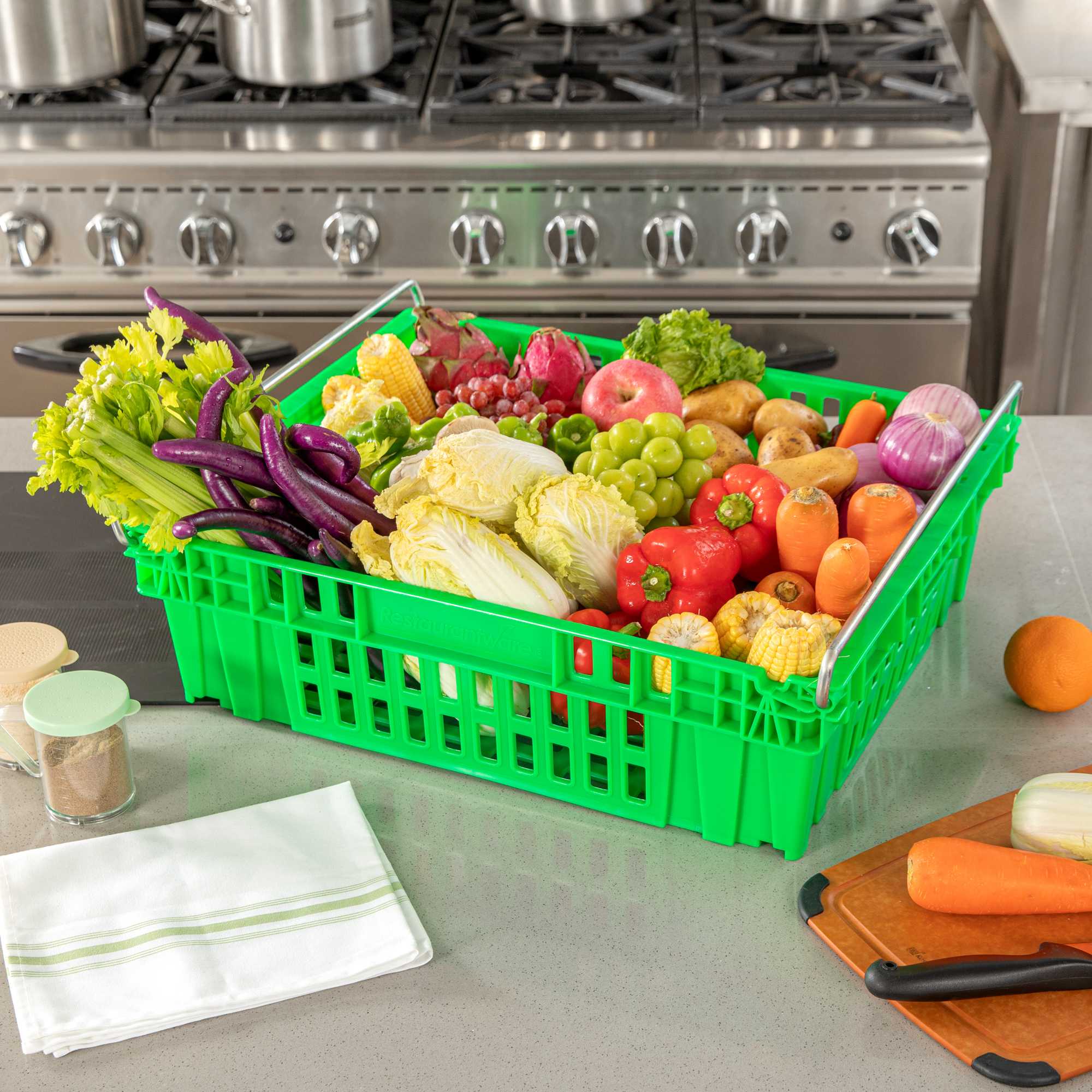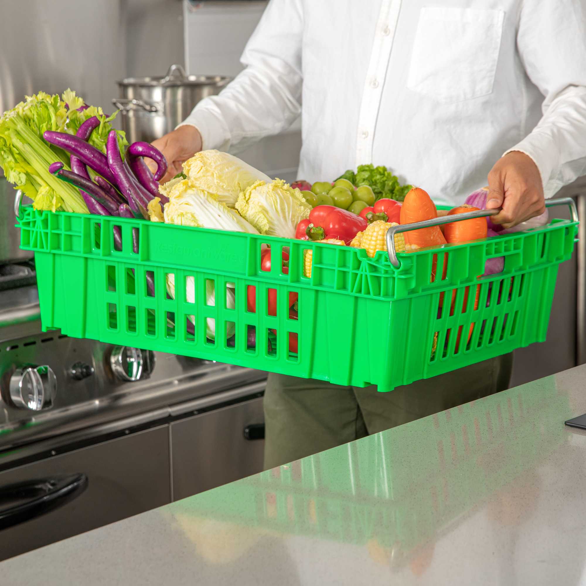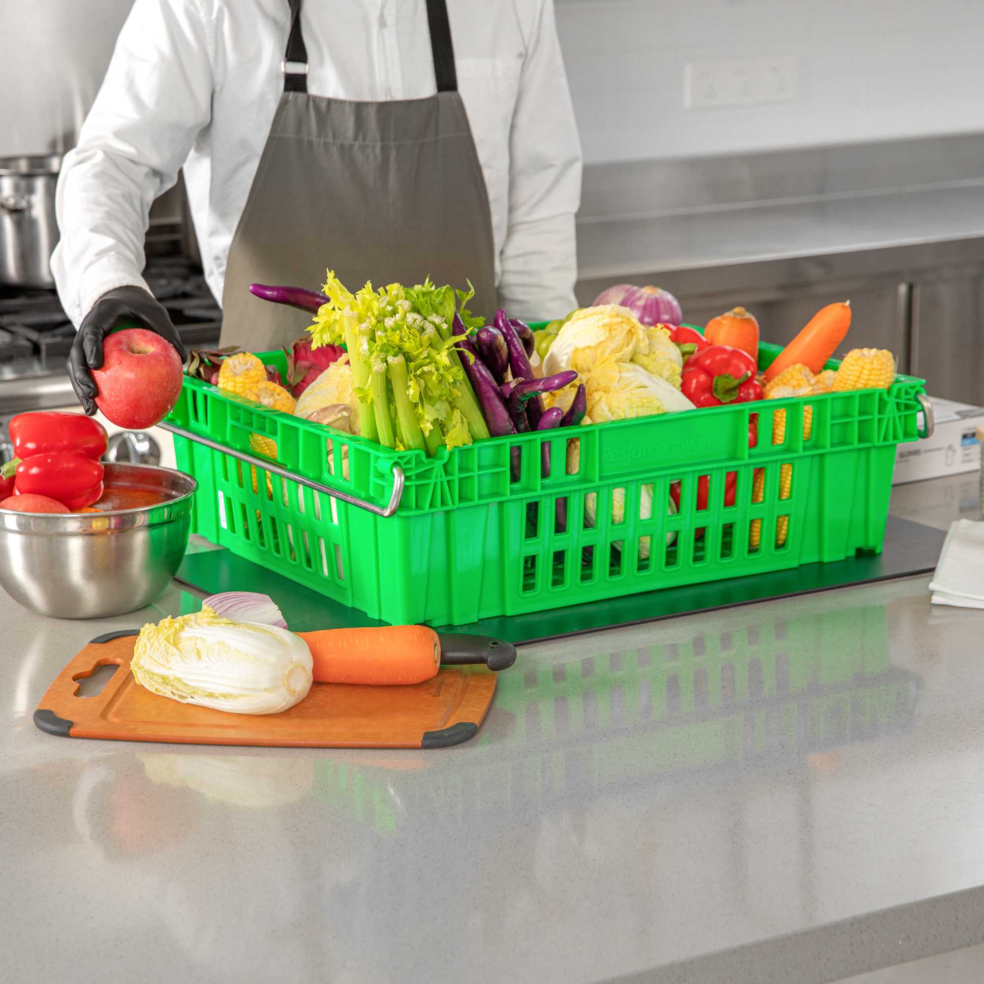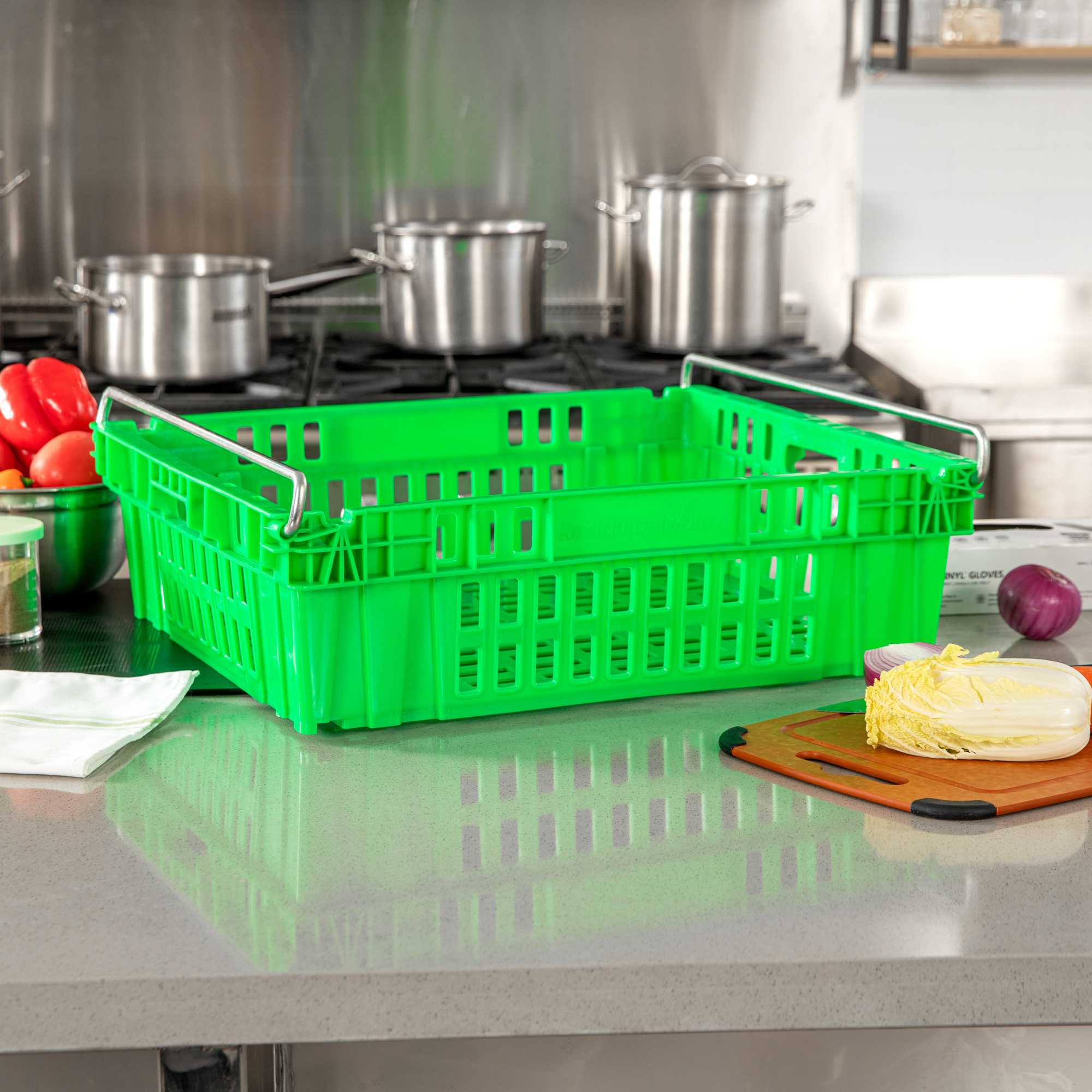 Efficiently cool and store food with ease using this food cooling tray. The Met Lux Stackable Food Cooling Tray, crafted from durable green plastic, measures 23.8 inches in length, 19.6 inches in width, and 7 inches in height, featuring molded hand holds for easy lifting. Its freezer-safe design ensures the freshness of your prepared dishes, making it an ideal meat processing tray in high-moisture settings. The tray's stackable structure maximizes storage space, allowing kitchen staff to organize efficiently without compromising accessibility. Elevate your kitchen's efficiency and organization with this versatile and robust solution. Each order includes 10 Met Lux Stackable Food Cooling Trays.