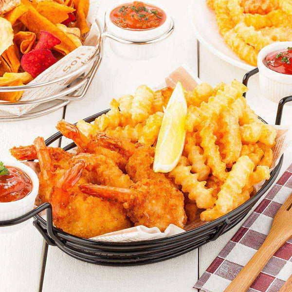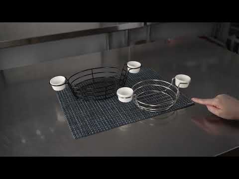Customers will always have extra dip with our Met Lux Oval Black Iron Entree Basket. With 2 built-in dipping sauce holders and 2 white ramekins, these food serving baskets are perfect for serving chips with dip, chicken tenders with honey mustard, or fries with ketchup. The oval basket design and mesh base of this chip basket server expertly holds your meals and add style to your food presentations. Crafted from strong and sturdy iron, this oval food basket endures regular use, making it perfect for quick service restaurants and catered events. This fast food basket pairs perfectly with a basket liner to keep it from getting greasy and provide a quick cleanup. This restaurant food serving basket measures 13 inches long by 6 inches wide by 2.25 inches tall and the ramekins contain up to 1 ounce of sauce. Sold in a 1 count box.