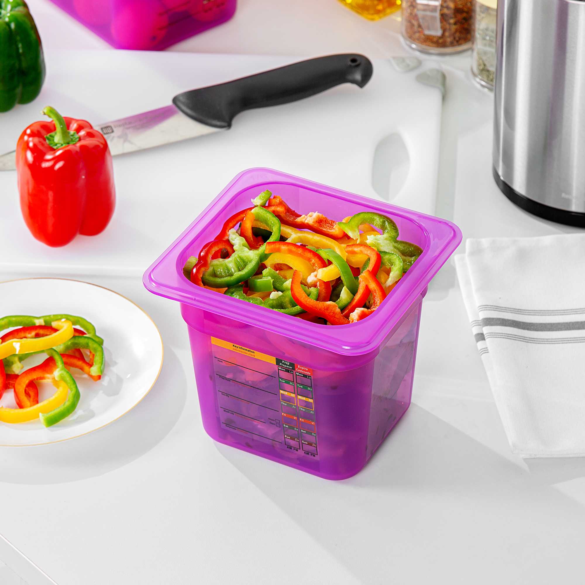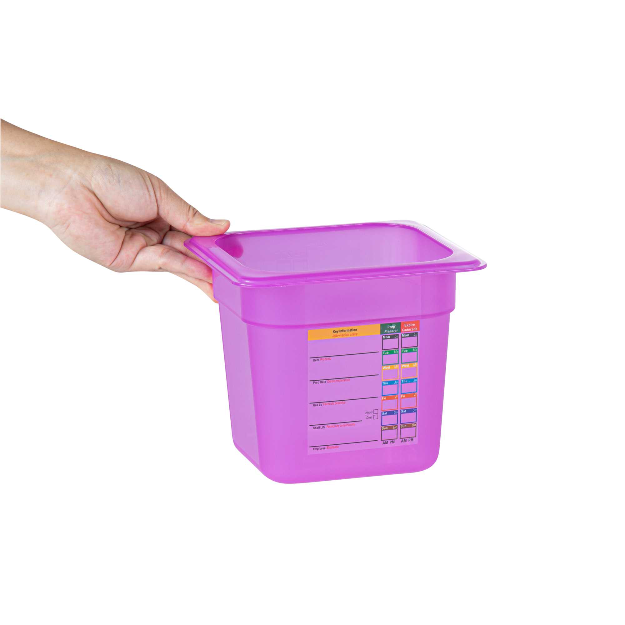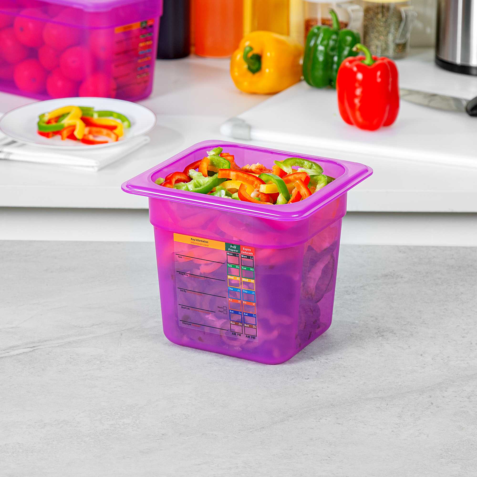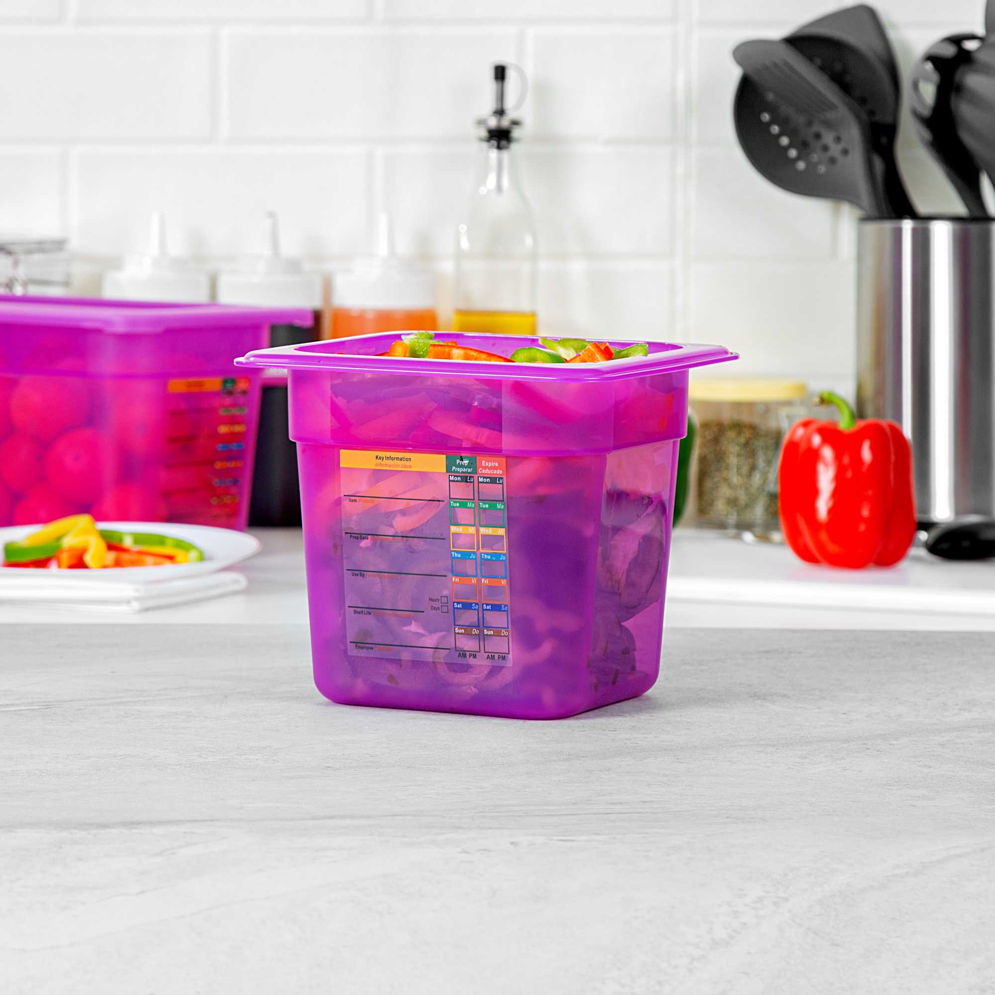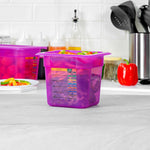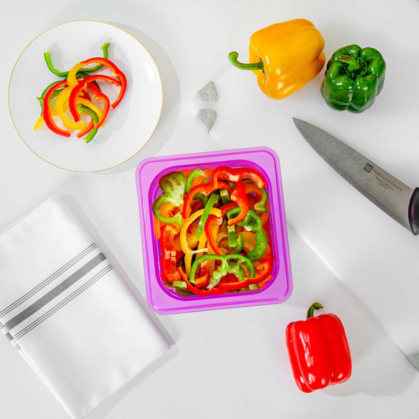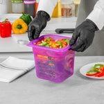 Maximize your kitchen's efficiency with versatile storage solutions. The Met Lux Stackable Plastic Food Container – 2.3 Qt, Temperature-Resistant, Reusable Label – 6.85 inches by 6.2 inches by 5.9 inches optimizes space with its stackable design, making it an ideal choice for busy foodservice environments where organization is key. This plastic food container is BPA-free, ensuring it meets stringent food safety standards while providing the durability necessary for everyday use. With its freezer-safe container capabilities, it withstands temperatures from -40 to 200 degrees Fahrenheit, making it perfect for storing both hot and cold foods without compromising quality. The container features a dishwasher-safe surface, simplifying cleaning and maintenance, freeing up valuable time for your staff. Its flexible polypropylene construction offers strength and affordability. Each order includes 10 Met Lux Stackable Plastic Food Container – Purple, Temperature-Resistant, Reusable Label.
