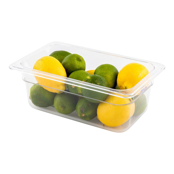Organize bulk ingredients with our 1/4 size Clear Plastic Cold Food Storage Container. This 4 inch deep food container with lid is the ideal solution to storing fruit produce, fish, meats and more. With a premium plastic construction, this food storage box can be used to store fresh produce in your refrigerator or dry ingredients in your kitchen pantry. With a crystal clear finish, you can easily find any ingredient you are looking for. Complete this plastic storage box with its coordinating lid (SKU: RWT0072). Lid sold separately. This durable food container measures 10.4 inches long by 6.4 inches wide and ships in a 1 count box.