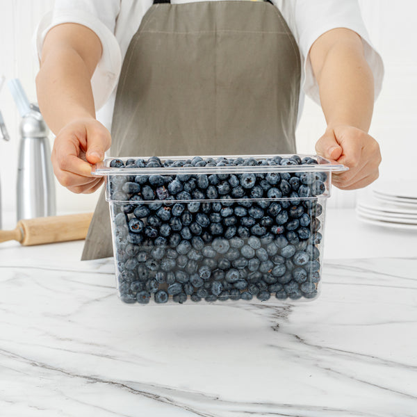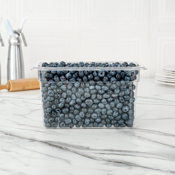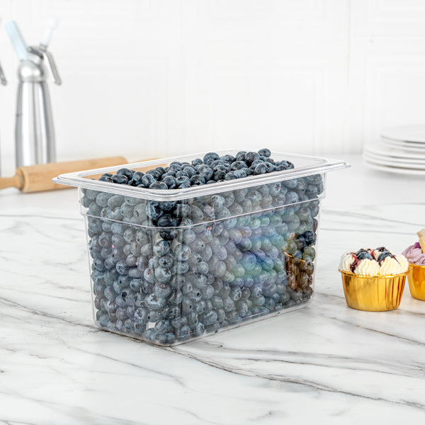 Organize prepped foods using our Met Lux Rectangle Clear Plastic 1/4 Size Cold Food Storage Container. This restaurant kitchen container has volume markers in quarts and liters, offering you a quick and efficient way to measure ingredients and manage your inventory. With an 8-inch depth, this clear food storage container is perfect for showcasing garnishes, ingredients, and prepared foods in cold holding wells or salad bars. Conveniently resistant to odors and stains, this durable food pan is built to preserve their premium appearance for everyday use at your foodservice establishment. Seal this container with our coordinating lid (SKU: RWT0072) to prevent messy accidents when transporting food from freezers. With a stackable design, this plastic food pan is great for space-saving storage in your kitchen or prep area. Containing up to 3.9 quarts, this freezable food pan measures 10.4 inches long by 6.4 inches wide by 6 inches tall. Shipped in a 1 count box. Lids are available and sold separately.