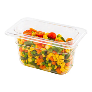Safely hold prepped ingredients with our 1/9 size Clear Plastic Cold Food Storage Container. This 4 inch deep kitchen container is perfect for holding sliced fruits and vegetables at your restaurant, buffet, cafe, and more. Constructed from premium plastic, this durable food storage container can store fresh ingredients in your refrigerator or dry ingredients in your kitchen pantry. With a clear finish, this small plastic container keeps your kitchen neat and organized. To lock in your flavorful ingredients, use our coordinating lid (SKU: RWT0074). Lid sold separately. This clear food container measures 7 inches long by 4.3 inches wide and ships in a 1 count box.