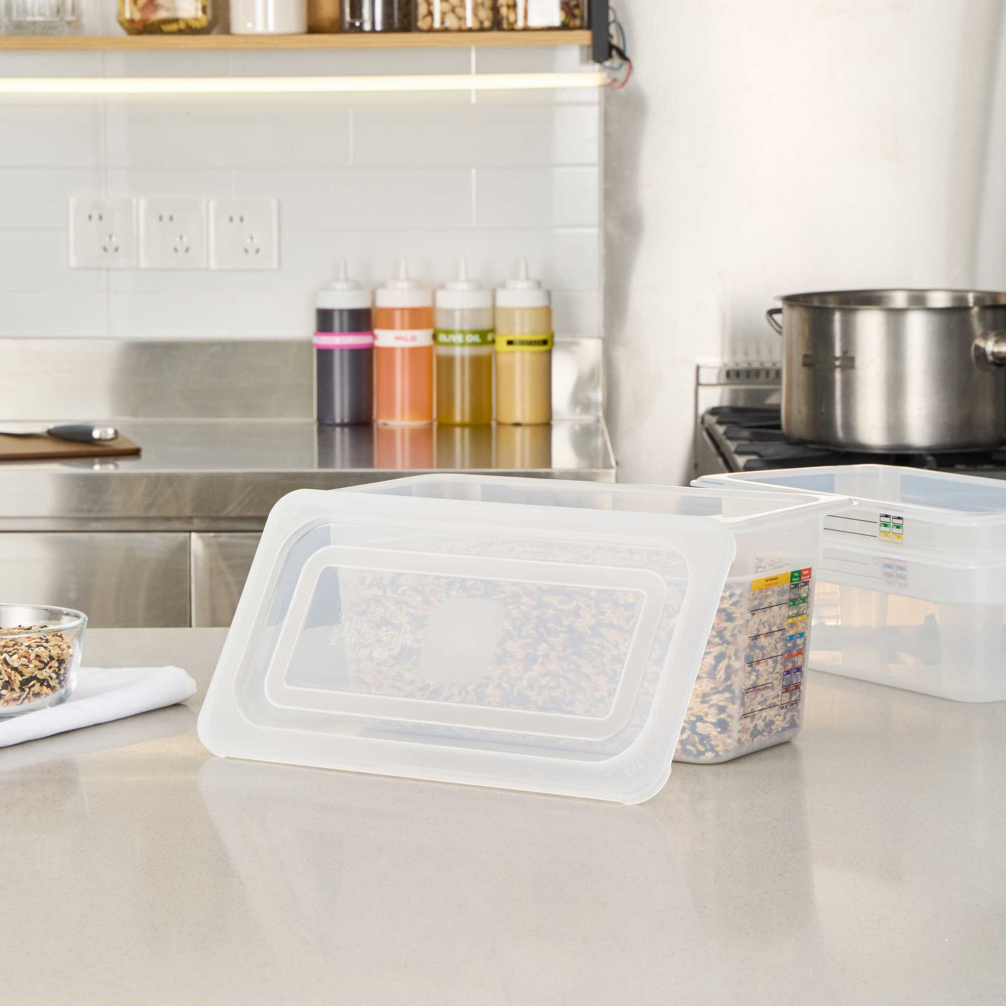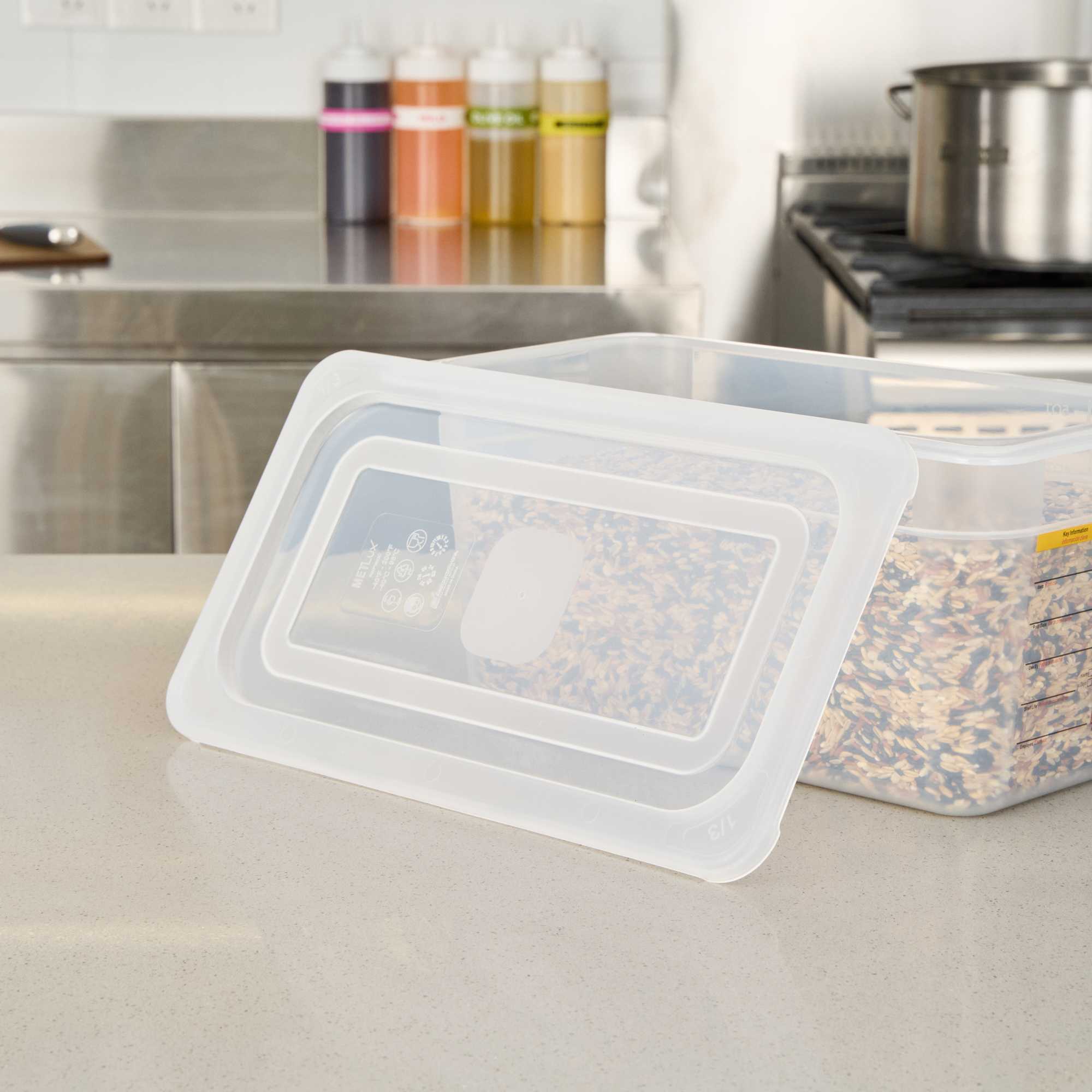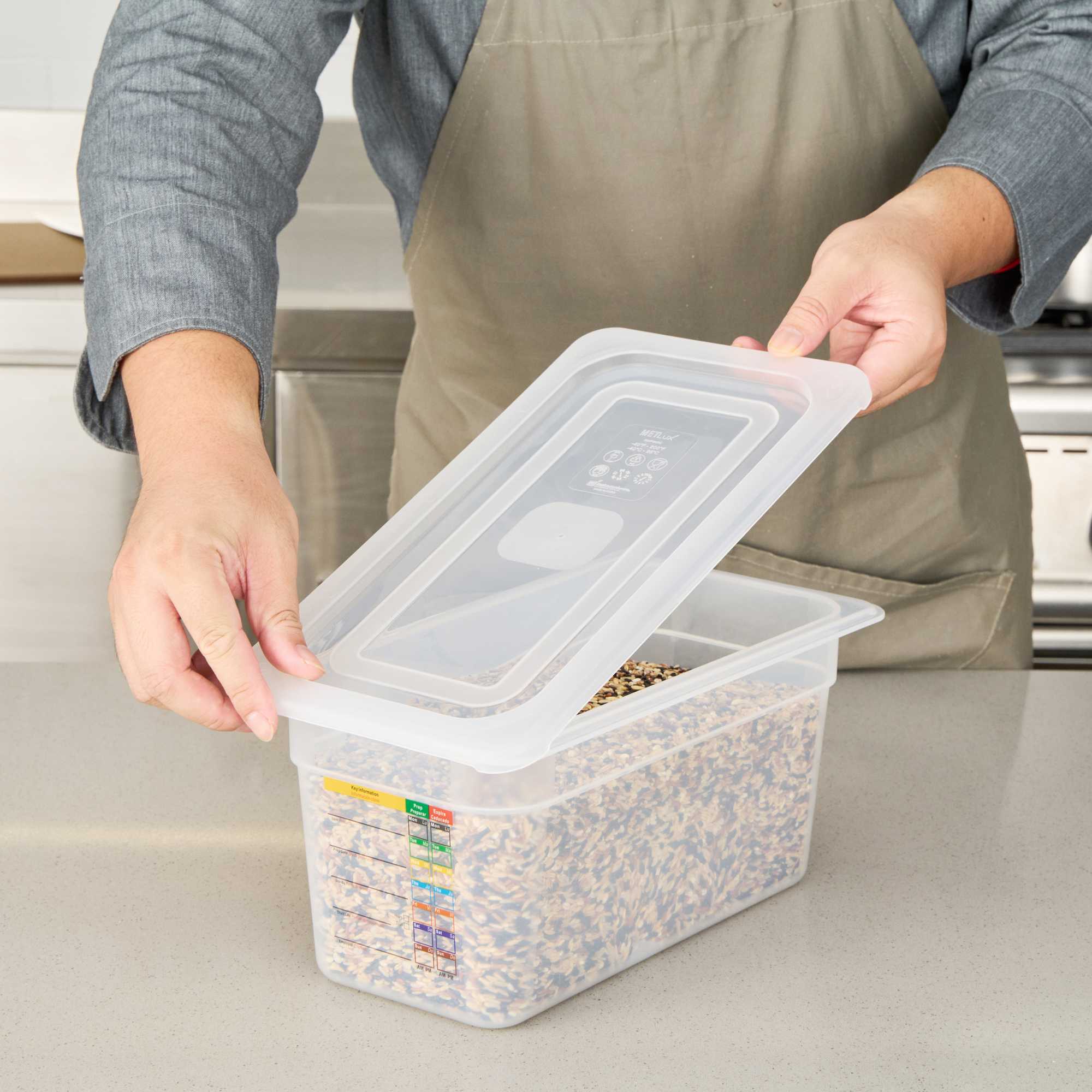 Enhance kitchen efficiency with our versatile clear container lid. The Met Lux Permanent Label Plastic Food Pan Lid, with dimensions of 12.6 inches in length and 7 inches in width, offers a built-in label for reusable food tracking, allowing your staff to record essential details like food type and use-by dates. This feature not only reduces costs by replacing disposable labels but also ensures organization and clarity in food storage. Its square shape maximizes storage space by up to 25%, making it ideal for busy restaurant kitchens and catering services where space optimization is crucial. Made from durable, stain-resistant plastic, this food pan cover maintains a clean appearance and withstands temperatures from -40°F to 203°F, suitable for both hot and cold applications. Additionally, the reusable container lid is dishwasher safe, ensuring quick cleanup and enhanced kitchen productivity. ach order includes 1 Met Lux Permanent Label Plastic Food Pan Lid.