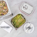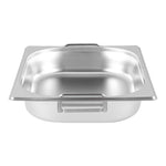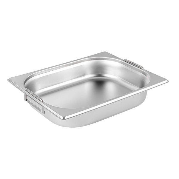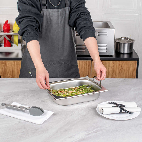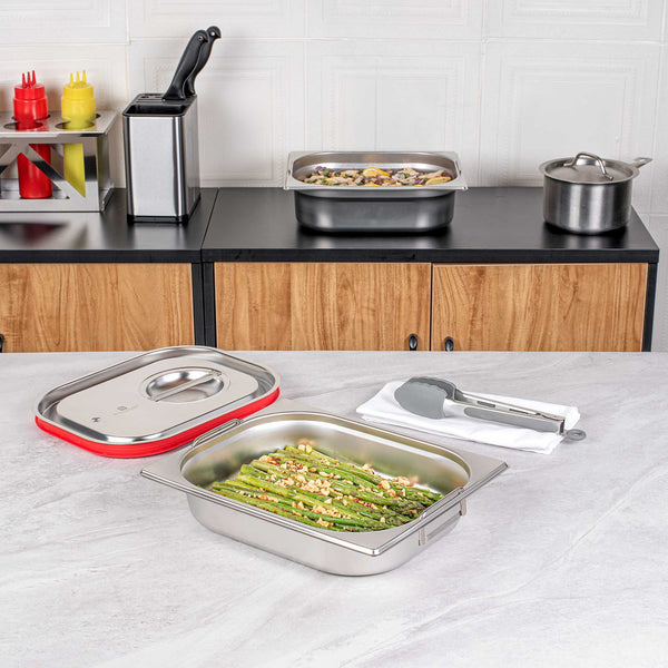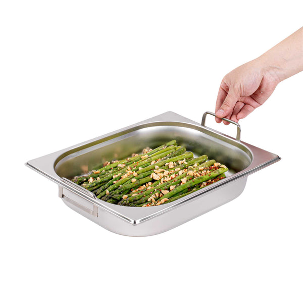 Make the most of your steam table pans with our Met Lux 1/2 Size Anti-Jam Stainless Steel Steam Table Pans with Collapsible Handles. Equipped with built-in retractable handles, these half size steam table pans make it effortless to transfer prepared foods to and from your steam table. Their reinforced corners are designed to resist warping or breakage, and their impact-resistant stainless steel construction ensures reliable and long-term commercial use. These half hotel pans with handles are also equipped with an innovative anti-jam design to enable efficient and hassle-free storage. Measuring 2.5 inches deep, these half size steam pans are great for serving medium-sized portions of hot or cold appetizers, salads, side dishes, and entrees at catered events and buffets. Pair these freezer-safe and oven-safe steam table pans with lids to complete your mess-free and portable food holding solution. Choose between our spill-resistant travel lids (SKU: RWT0052) or our traditional lids (SKU: RWT0046). Lid sold separately. Each order will contain one 12.8-inch L x 10.4-inch W x 2.5-inch H steam table pan.