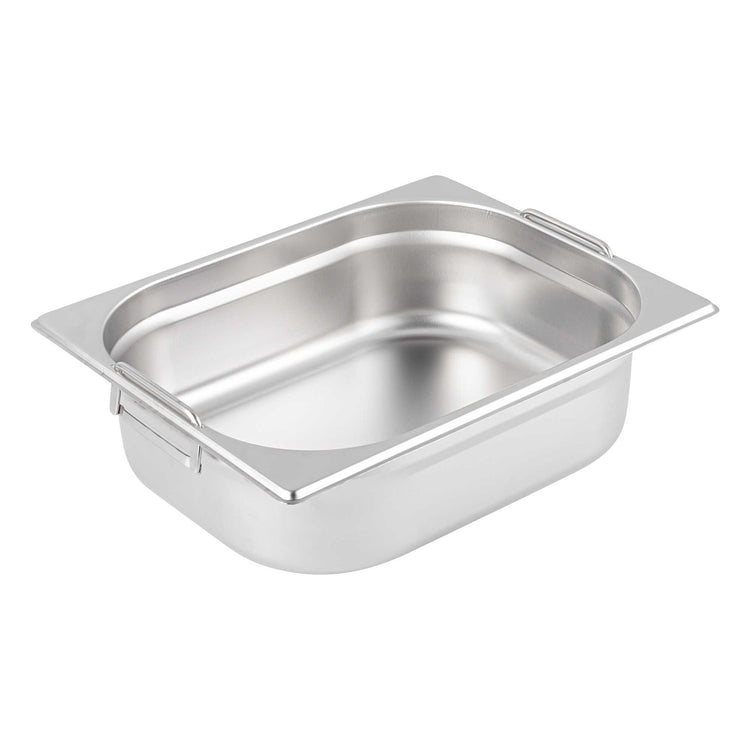 Built to be tough, durable, long-lasting, and scratch and dent resistant, these half-size stainless steel steam table pans feature a convenient anti-jamming design and smooth basin. Constructed from premium stainless steel, these pans are an ideal addition for any caterer's stainless steel cookware collection. Safely and efficiently keep prepared foods warm, and also transport food to off-site catering events and steam tables easily and efficiently. These half-size stainless steel steam table pans come with built-in collapsible handles and are constructed for conveniently moving, arranging, and carrying prepared catered dishes. Each Met Lux 1/2 Size Steam Table Pan Anti Jam Stainless Steel with Collapsible Handles measure 12.8 inches in length, 10.4 inches in width, and is 4 inches deep. One steam table pan is shipped per order.