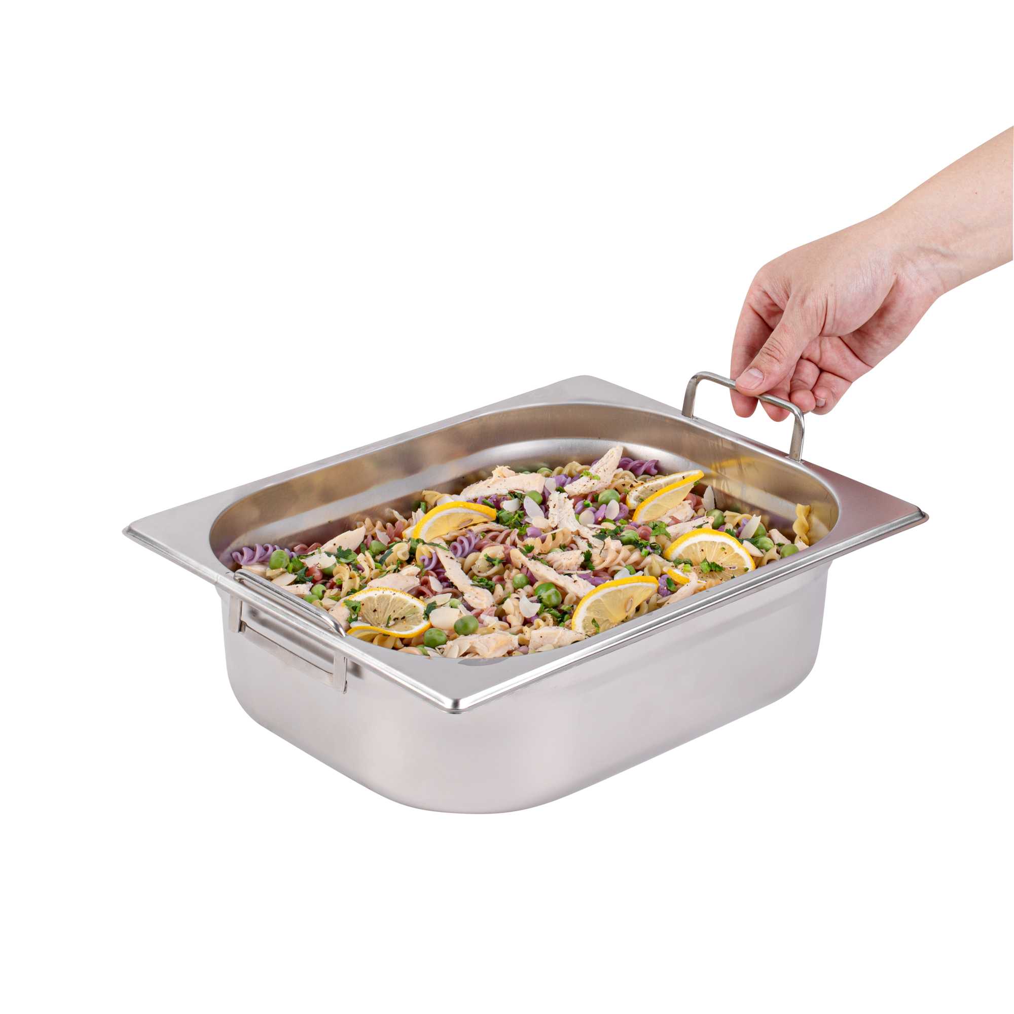 - Collapsible handles make it easy to carry and reload prepared foods in the steam table pans