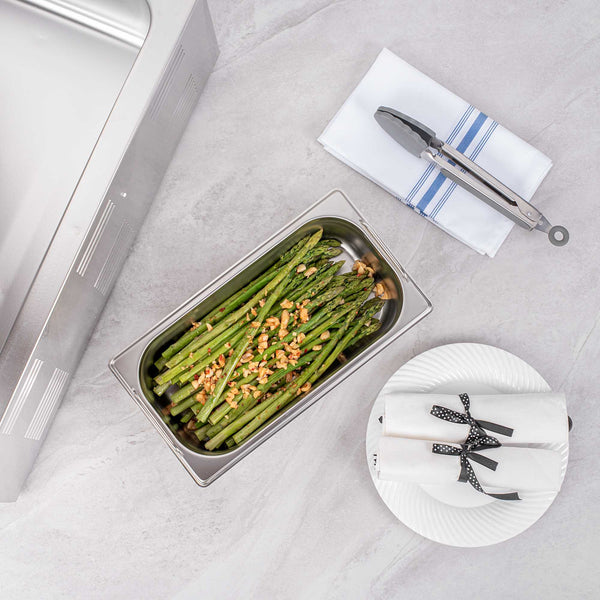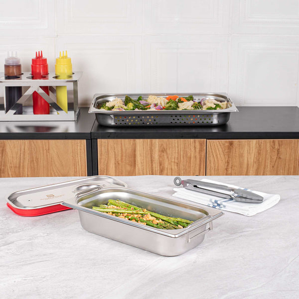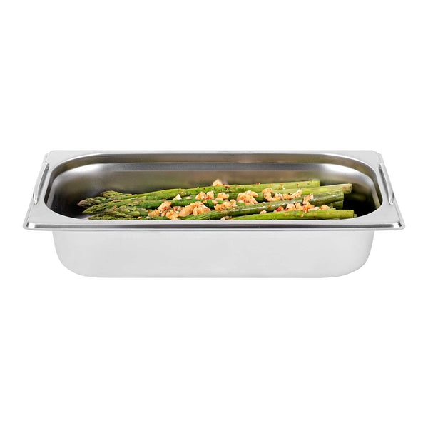Upgrade your steam table setup with our Met Lux Anti-Jam Stainless Steel Steam Table Pans with Collapsible Handles. Designed with innovative built-in handles, these one-third size stainless steam table pans make it quick and easy to load and unload your prepared foods. Their raised rim and flattened edges lock in steam and heat, while their easy-to-grip retractable handles diminish the risk of burns or injury. Constructed from high-quality stainless steel, these dent-resistant third pans are built to withstand extreme temperatures and are conveniently freezer and oven-safe. Their unique anti-jam design prevents pans from sticking together for hassle-free storage, while their reinforced corners expertly resist warping or breakage. Each of these stainless steel steam table pans with handles is 2.5 inches deep - a perfect size for holding smaller portions of appetizers, entrees, side dishes, and desserts at buffet services and catered events. Pair these steam table pans with our spill-resistant travel lids (SKU: RWT0035) or our traditional stainless steel lids (SKU: RWT0047) to complete the look. Lids sold separately. Each order will contain one 12.8 L x 7-inch W x 2.5-inch H steam table pan.