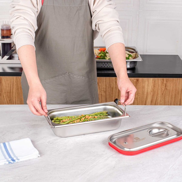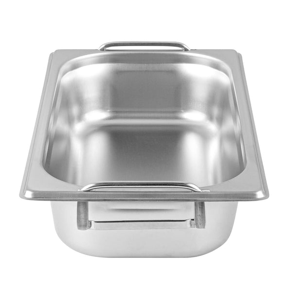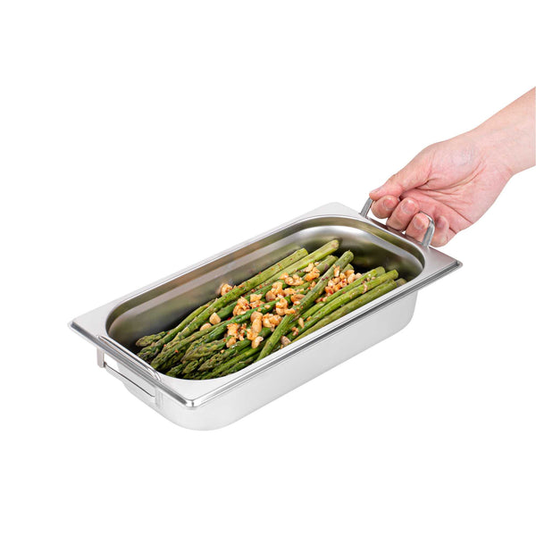 - Collapsible handles make it easy to carry and reload prepared foods in the steam table pans
